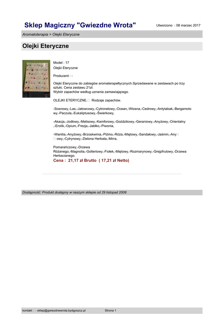 Sklep Magiczny "Gwiezdne Wrota" Utworzono : 08 marzec 2017 Aromatoterapia > Olejki Eteryczne Olejki Eteryczne Model : 17 Olejki Eteryczne Producent : Olejki Eteryczne do zabiegów aromaterapełtycznych.Sprzedawane w zestawach po trzy sztuki. Cena zestawu 21zł. Wybór zapachów według uznania zamawiającego. OLEJKI ETERYCZNE.� Rodzaje zapachów. -Sosnowy,-Las,-Jałowcowy,-Cytronelowy,-Ocean,-Wiosna,-Cedrowy,-Antytabak,-Bergamoto wy,-Paczula,-Eukaliptusowy,-Świerkowy, -Akacja,-Jodłowy,-Melisowy,-Kamforowy,-Gożdzikowy,-Geraniowy,-Anyżowy,-Orientalny ,-Erotik,-Opium,-Frezja,-Jabłko,-Piwonia, -Wanilia,-Anyżowy,-Brzoskwinia,-Piżmo,-Róża,-Miętowy,-Sandałowy,-Jaśmin,-Any� �owy,-Cytrynowy,-Zielona Herbata,-Mirra, Pomarańczowy,-Drzewa Różanego,-Magnolia,-Golteriowy,-Fiołek,-Miętowy,-Rozmarynowy,-Grejpfrutowy,-Drzewa Herbacianego. Cena : 21,17 zł Brutto ( 17,21 zł Netto) Dostępność: Produkt dostępny w naszym sklepie od 29 listopad 2008 kontakt : - [email protected] Strona 1