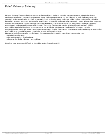 Szkoła Podstawowa w Podmoklach Małych Dzień Ochrony Zwierząt W tym dniu w Zespole Edukacyjnym w Podmoklach Małych została zorganizowana loteria fantowa związana właśnie z tematyką zwierząt. Losy były sprzedawane po 1zł i każdy z nich był wygrany. Do nagród, które uczniowie przyjęli z największym entuzjazmem należała piłka nożna oraz torba, a także koszulki, puzzle, smycze, karma dla psa i kota, breloczki, zabawki dla zwierząt i inne. Wspaniałe nagrody zostały ufundowane przez zoologiczno- wędkarskie ,,Centrum Rybka z Kargowej. Główne nagrody wylosowały dziewczynki- Agata Modrzyk i Patrycja Gęstwa.W sumie udało się nam zebrać 122złwszystkie pieniążki zostaną przeznaczone na artykuły plastyczne i dekoracje szkolne. Loterie zorganizowała klasa VI wraz z wychowawczynią p. Emilią Owczarek. Losowanie odbywało się w obecności wszystkich uczestników oraz członków grona pedagogicznego. Wszyscy jesteśmy zgodni co do tego, że o zwierzętach należy pamiętać przez cały rok: - opiekujmy się nimi, - nie niszczmy ich środowiska, - dbajmy, by były zdrowe i szczęśliwe. Każdy z nas może zrobić coś w tym kierunku.Powodzenia!!! http://www.szkolapodmokle.babimost.pl Kreator PDF Utworzono 8 March, 2017, 12:31
