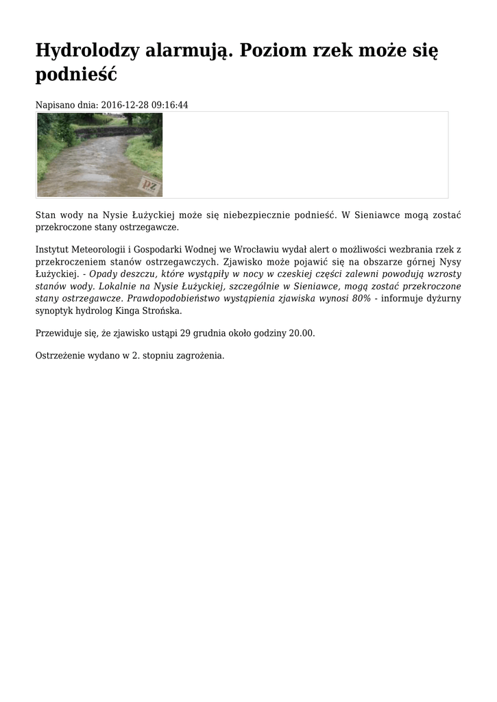 Hydrolodzy alarmują. Poziom rzek może się podnieść Napisano dnia: 2016-12-28 09:16:44 Stan wody na Nysie Łużyckiej może się niebezpiecznie podnieść. W Sieniawce mogą zostać przekroczone stany ostrzegawcze. Instytut Meteorologii i Gospodarki Wodnej we Wrocławiu wydał alert o możliwości wezbrania rzek z przekroczeniem stanów ostrzegawczych. Zjawisko może pojawić się na obszarze górnej Nysy Łużyckiej. - Opady deszczu, które wystąpiły w nocy w czeskiej części zalewni powodują wzrosty stanów wody. Lokalnie na Nysie Łużyckiej, szczególnie w Sieniawce, mogą zostać przekroczone stany ostrzegawcze. Prawdopodobieństwo wystąpienia zjawiska wynosi 80% - informuje dyżurny synoptyk hydrolog Kinga Strońska. Przewiduje się, że zjawisko ustąpi 29 grudnia około godziny 20.00. Ostrzeżenie wydano w 2. stopniu zagrożenia.
