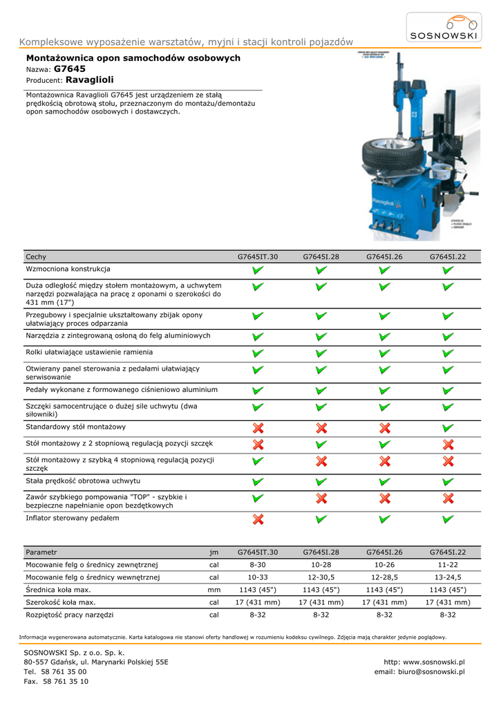 Kompleksowe wyposażenie warsztatów, myjni i stacji kontroli pojazdów Montażownica opon samochodów osobowych Nazwa: G7645 Producent: Ravaglioli Montażownica Ravaglioli G7645 jest urządzeniem ze stałą prędkością obrotową stołu, przeznaczonym do montażu/demontażu opon samochodów osobowych i dostawczych. Cechy G7645IT.30 G7645I.28 G7645I.26 G7645I.22 Wzmocniona konstrukcja Duża odległość między stołem montażowym, a uchwytem narzędzi pozwalająca na pracę z oponami o szerokości do 431 mm (17") Przegubowy i specjalnie ukształtowany zbijak opony ułatwiający proces odparzania Narzędzia z zintegrowaną osłoną do felg aluminiowych Rolki ułatwiające ustawienie ramienia Otwierany panel sterowania z pedałami ułatwiający serwisowanie Pedały wykonane z formowanego ciśnieniowo aluminium Szczęki samocentrujące o dużej sile uchwytu (dwa siłowniki) Standardowy stół montażowy Stół montażowy z 2 stopniową regulacją pozycji szczęk Stół montażowy z szybką 4 stopniową regulacją pozycji szczęk Stała prędkość obrotowa uchwytu Zawór szybkiego pompowania "TOP" - szybkie i bezpieczne napełnianie opon bezdętkowych Inflator sterowany pedałem Parametr jm G7645IT.30 G7645I.28 G7645I.26 G7645I.22 Mocowanie felg o średnicy zewnętrznej cal 8-30 10-28 10-26 11-22 Mocowanie felg o średnicy wewnętrznej cal 10-33 12-30,5 12-28,5 13-24,5 Średnica koła max. mm 1143 (45") 1143 (45") 1143 (45") 1143 (45") Szerokość koła max. cal 17 (431 mm) 17 (431 mm) 17 (431 mm) 17 (431 mm) Rozpiętość pracy narzędzi cal 8-32 8-32 8-32 8-32 Informacja wygenerowana automatycznie. Karta katalogowa nie stanowi oferty handlowej w rozumieniu kodeksu cywilnego. Zdjęcia mają charakter jedynie poglądowy. SOSNOWSKI Sp. z o.o. Sp. k. 80-557 Gdańsk, ul. Marynarki Polskiej 55E Tel. 58 761 35 00 Fax. 58 761 35 10 http: www.sosnowski.pl email: [email protected] Kompleksowe wyposażenie warsztatów, myjni i stacji kontroli pojazdów Parametr jm G7645IT.30 G7645I.28 G7645I.26 G7645I.22 Moment max. Nm 1200 1200 1200 1200 Siła max. kg 3000 3000 3000 3000 obr/ min 7,3 7,3 7,3 7,3 - 0,75 Kw 230/400V (50-60Hz) 3-fazowy 0,75 Kw 230/400V (50-60Hz) 3-fazowy 0,75 Kw 230/400V (50-60Hz) 3-fazowy 0,75 Kw 230/400V (50-60Hz) 3-fazowy G7645I.20 G7645.30 G7645.28 G7645.26 Prędkość obrotowa Zasilanie Cechy Wzmocniona konstrukcja Duża odległość między stołem montażowym, a uchwytem narzędzi pozwalająca na pracę z oponami o szerokości do 431 mm (17") Przegubowy i specjalnie ukształtowany zbijak opony ułatwiający proces odparzania Narzędzia z zintegrowaną osłoną do felg aluminiowych Rolki ułatwiające ustawienie ramienia Otwierany panel sterowania z pedałami ułatwiający serwisowanie Pedały wykonane z formowanego ciśnieniowo aluminium Szczęki samocentrujące o dużej sile uchwytu (dwa siłowniki) Standardowy stół montażowy Stół montażowy z 2 stopniową regulacją pozycji szczęk Stół montażowy z szybką 4 stopniową regulacją pozycji szczęk Stała prędkość obrotowa uchwytu Zawór szybkiego pompowania "TOP" - szybkie i bezpieczne napełnianie opon bezdętkowych Inflator sterowany pedałem Parametr jm G7645I.20 G7645.30 G7645.28 G7645.26 Mocowanie felg o średnicy zewnętrznej cal 10-20 8-30 10-28 10-26 Mocowanie felg o średnicy wewnętrznej cal 12-22,5 10-33 12-30,5 12-28,5 Średnica koła max. mm 1143 (45") 1143 (45") 1143 (45") 1143 (45") Szerokość koła max. cal 17 (431 mm) 17 (431 mm) 17 (431 mm) 17 (431 mm) Rozpiętość pracy narzędzi cal 8-32 8-32 8-32 8-32 Moment max. Nm 1200 1200 1200 1200 Siła max. Prędkość obrotowa Zasilanie kg 3000 3000 3000 3000 obr/ min 7,3 7,3 7,3 7,3 - 0,75 Kw 230/400V (50-60Hz) 3-fazowy 0,75 Kw 230/400V (50-60Hz) 3-fazowy 0,75 Kw 230/400V (50-60Hz) 3-fazowy 0,75 Kw 230/400V (50-60Hz) 3-fazowy Informacja wygenerowana automatycznie. Karta katalogowa nie stanowi oferty handlowej w rozumieniu kodeksu cywilnego. Zdjęcia mają charakter jedynie poglądowy. SOSNOWSKI Sp. z o.o. Sp. k. 80-557 Gdańsk, ul. Marynarki Polskiej 55E Tel. 58 761 35 00 Fax. 58 761 35 10 http: www.sosnowski.pl email: [email protected] Kompleksowe wyposażenie warsztatów, myjni i stacji kontroli pojazdów Cechy G7645.22 G7645.20 G7645.18 Wzmocniona konstrukcja Duża odległość między stołem montażowym, a uchwytem narzędzi pozwalająca na pracę z oponami o szerokości do 431 mm (17") Przegubowy i specjalnie ukształtowany zbijak opony ułatwiający proces odparzania Narzędzia z zintegrowaną osłoną do felg aluminiowych Rolki ułatwiające ustawienie ramienia Otwierany panel sterowania z pedałami ułatwiający serwisowanie Pedały wykonane z formowanego ciśnieniowo aluminium Szczęki samocentrujące o dużej sile uchwytu (dwa siłowniki) Standardowy stół montażowy Stół montażowy z 2 stopniową regulacją pozycji szczęk Stół montażowy z szybką 4 stopniową regulacją pozycji szczęk Stała prędkość obrotowa uchwytu Zawór szybkiego pompowania "TOP" - szybkie i bezpieczne napełnianie opon bezdętkowych Inflator sterowany pedałem Parametr jm G7645.22 G7645.20 G7645.18 Mocowanie felg o średnicy zewnętrznej cal 11-22 10-20 10-18 Mocowanie felg o średnicy wewnętrznej cal 13-24,5 12-22,5 12-20,5 Średnica koła max. mm 1143 (45") 1143 (45") 1143 (45") Szerokość koła max. cal 17 (431 mm) 17 (431 mm) 17 (431 mm) Rozpiętość pracy narzędzi cal 8-32 8-32 8-32 Moment max. Nm 1200 1200 1200 Siła max. Prędkość obrotowa Zasilanie kg 3000 3000 3000 obr/ min 7,3 7,3 7,3 - 0,75 Kw - 230/400V (50-60Hz) - 3-fazowy 0,75 Kw - 230/400V (50-60Hz) - 3-fazowy 0,75 Kw - 230/400V (50-60Hz) - 3-fazowy Więcej informacji u doradców techniczno - handlowych firmy SOSNOWSKI Informacja wygenerowana automatycznie. Karta katalogowa nie stanowi oferty handlowej w rozumieniu kodeksu cywilnego. Zdjęcia mają charakter jedynie poglądowy. SOSNOWSKI Sp. z o.o. Sp. k. 80-557 Gdańsk, ul. Marynarki Polskiej 55E Tel. 58 761 35 00 Fax. 58 761 35 10 Pow