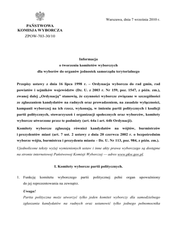 Warszawa, dnia 7 września 2010 r. PAŃSTWOWA KOMISJA WYBORCZA ZPOW-703-30/10 Informacja o tworzeniu komitetów wyborczych dla wyborów do organów jednostek samorządu terytorialnego Przepisy ustawy z dnia 16 lipca 1998 r. – Ordynacja wyborcza do rad gmin, rad powiatów i sejmików województw (Dz. U. z 2003 r. Nr 159, poz. 1547, z późn. zm.), zwanej dalej „Ordynacją” stanowią, że czynności wyborcze związane w szczególności ze zgłaszaniem kandydatów na radnych oraz prowadzeniem, na zasadzie wyłączności, kampanii wyborczej na ich rzecz, wykonują, w imieniu partii politycznych i koalicji partii politycznych, stowarzyszeń i organizacji społecznych oraz wyborców, komitety wyborcze utworzone przez te podmioty (art. 64a i art. 64b Ordynacji). Komitety wyborcze zgłaszają również kandydatów na wójtów, burmistrzów i prezydentów miast (art. 7 ust. 2 ustawy z dnia 20 czerwca 2002 r. o bezpośrednim wyborze wójta, burmistrza i prezydenta miasta – Dz. U. Nr 113, poz. 984, z późn. zm.). Ujednolicone teksty wyżej wymienionych ustaw i inne akty prawa wyborczego są dostępne na stronie internetowej Państwowej Komisji Wyborczej — adres www.pkw.gov.pl. I. Komitety wyborcze partii politycznych. 1. Funkcję komitetu wyborczego partii politycznej pełni organ upoważniony do jej reprezentowania na zewnątrz. Uwaga! Partia polityczna może utworzyć tylko jeden komitet wyborczy dla samodzielnego zgłaszania kandydatów na radnych oraz ustanowić tylko jednego pełnomocnika -2wyborczego i jednego pełnomocnika finansowego. Struktury terenowe partii politycznych nie mogą tworzyć komitetów wyborczych. 2. Organ partii politycznej upoważniony do jej reprezentowania na zewnątrz powołuje: 1) pełnomocnika wyborczego, 2) pełnomocnika finansowego. Uwaga! Zgodnie z art. 82a ust. 2 i 3 Ordynacji pełnomocnik finansowy komitetu wyborczego nie może być pełnomocnikiem wyborczym komitetu wyborczego, pełnomocnikiem finansowym innego komitetu wyborczego oraz funkcjonariuszem publicznym w rozumieniu art. 115 § 13 Kodeksu karnego. Zgodnie z tym przepisem funkcjonariuszem publicznym jest: 1) Prezydent Rzeczypospolitej Polskiej, 2) poseł, senator, radny, 3) poseł do Parlamentu Europejskiego, 4) sędzia, ławnik, prokurator, funkcjonariusz finansowego organu postępowania przygotowawczego lub organu nadrzędnego nad finansowym organem postępowania przygotowawczego, notariusz, komornik, kurator sądowy, syndyk, nadzorca sądowy i zarządca, osoba orzekająca w organach dyscyplinarnych działających na podstawie ustawy, 5) osoba będąca pracownikiem administracji rządowej, innego organu państwowego lub samorządu terytorialnego, chyba że pełni wyłącznie czynności usługowe, a także inna osoba w zakresie, w którym uprawniona jest do wydawania decyzji administracyjnych, 6) osoba będąca pracownikiem organu kontroli państwowej lub organu kontroli samorządu terytorialnego, chyba że pełni wyłącznie czynności usługowe, 7) osoba zajmująca kierownicze stanowisko w innej instytucji państwowej, 8) funkcjonariusz organu powołanego do ochrony bezpieczeństwa publicznego albo funkcjonariusz Służby Więziennej, 9) osoba pełniąca czynną służbę wojskową. -33. Nazwa komitetu wyborczego partii politycznej musi zawierać wyrazy „komitet wyborczy” oraz nazwę partii politycznej. Nazwa ta może zawierać również skrót nazwy partii (art. 64g ust. 1 Ordynacji). Uwaga! Zabronione jest umieszczenie w nazwie komitetu wyborczego nazwy partii politycznej, skrótu nazwy partii politycznej lub części nazwy utożsamianej z daną partią, bez zgody organu statutowego innej partii politycznej, której nazwa albo skrót ma zostać umieszczona w nazwie komitetu wyborczego. Jeżeli wpis do ewidencji partii politycznych uzyskały dwie lub więcej partii, których nazwy nie odróżniają się wyraźnie od siebie mogąc tym samym wprowadzać wyborcę w błąd, wymóg zgody organu statutowego dotyczy partii politycznej, która pierwsza uzyskała wpis do ewidencji partii politycznych (art. 64g ust. 5). Skrót nazwy komitetu wyborczego partii politycznej może zawierać wyrazy „komitet wyborczy” albo skrót „KW” i nazwę partii politycznej lub skrót jej nazwy wskazany w ewidencji partii politycznej. Skrót nazwy komitetu wyborczego może składać się z co najwyżej 40 znaków drukarskich, wliczając spacje (art. 64ga ust. 1 i 5 Ordynacji). Należy pamiętać, że na urzędowych obwieszczeniach i na karcie do głosowania umieszczony będzie skrót nazwy komitetu wyborczego, a nie nazwa komitetu wyborczego (art. 114 Ordynacji). Każdy komitet wyborczy musi mieć skrót nazwy. Skrót nazwy komitetu wyborczego może być taki sam jak nazwa tego komitetu pod warunkiem, że nazwa komitetu składa się z nie więcej niż 40 znaków drukarskich, wliczając spacje. 4. O utworzeniu komitetu wyborczego i zamiarze samodzielnego zgłaszania kandydatów na radnych, organ partii politycznej upoważniony do jej reprezentowania na zewnątrz zawiadamia Państwową Komisję Wyborczą. 5. Zawiadomienie to musi być dokonane w terminie do 50. dnia przed dniem wyborów (art. 64c ust. 4 Ordynacji). Zakładając, że 50. dzień przed dniem wyborów będzie -4wypadał w sobotę, to zgodnie z art. 205 ust. 2 Ordynacji zawiadomienie musi zostać złożone najpóźniej w 48. dniu przed dniem wyborów w godzinach urzędowania. W zawiadomieniu podaje się: 1) nazwę komitetu wyborczego i obowiązkowo skrót nazwy komitetu wyborczego, 2) adres siedziby komitetu wyborczego, 3) numer ewidencyjny, pod którym partia polityczna jest wpisana do ewidencji partii politycznych, 4) imię (imiona), nazwisko, adres zamieszkania i numer ewidencyjny PESEL pełnomocnika wyborczego, 5) imię (imiona), nazwisko, adres zamieszkania i numer ewidencyjny PESEL pełnomocnika finansowego. Pożądane jest podanie danych kontaktowych do komitetu wyborczego i pełnomocników (numerów telefonów, numerów faksów, adres
