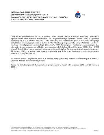 INFORMACJA O CENIE EMISYJNEJ CERTYFIKATÓW INWESTYCYJNYCH SERII B PKO ABSOLUTNEJ STOPY ZWROTU EUROPA WSCHÓD - ZACHÓD – FUNDUSZ INWESTYCYJNY ZAMKNIĘTY Działając na podstawie art. 54 ust. 3 ustawy z dnia 29 lipca 2005 r. o ofercie publicznej i warunkach wprowadzania instrumentów finansowych do zorganizowanego systemu obrotu oraz o spółkach publicznych (Dz. U. z 2009 nr 185 poz. 1439 z późn. zm.) oraz Rozdziału VI. pkt 4.3. prospektu emisyjnego certyfikatów inwestycyjnych serii A, B, C i D PKO Absolutnej Stopy Zwrotu Europa Wschód - Zachód funduszu inwestycyjnego zamkniętego („Fundusz”), PKO Towarzystwo Funduszy Inwestycyjnych S.A. informuje, iż cena emisyjna certyfikatów inwestycyjnych („Certyfikaty”) serii B wynosi 100,06 (sto i 6/100 groszy) złotych i jest równa wartości aktywów netto na Certyfikat Funduszu ustalonej na dzień wyceny – 29 sierpnia 2016 r., to jest na dzień wyceny przypadający na 7 dni przed dniem rozpoczęcia przyjmowania zapisów na Certyfikaty serii B. W ramach emisji Certyfikatów serii B w drodze oferty publicznej zostanie zaoferowanych 10.000.000 (słownie: dziesięć milionów) Certyfikatów. Zapisy na Certyfikaty serii B Funduszu będą przyjmowane w dniach od 5 września 2016 r. do 28 września 2016 r. PKO Towarzystwo Funduszy Inwestycyjnych SA, ul. Chłodna 52, 00-872 Warszawa; tel: 022 358 56 00, fax: 022 358 56 01; www.pkotfi.pl Spółka zarejestrowana w Rejestrze Przedsiębiorców prowadzonym przez Sąd Rejestrowy dla m.st. Warszawy, XIII Wydział Gospodarczy Krajowego Rejestru Sądowego pod numerem 0000019384. Kapitał zakładowy 18.000.000 złotych. NIP 526-17-88-449 Strona 1/1