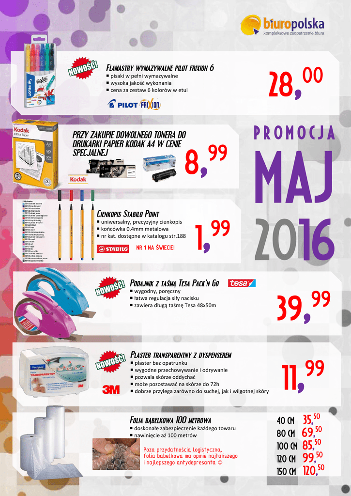 Flamastry wymazywalne pilot frixion 6 pisaki w pełni wymazywalne wysoka jakość wykonania cena za zestaw 6 kolorów w etui PRZY ZAKUPIE DOWOLNEGO TONERA DO DRUKARKI PAPIER KODAK A4 W CENIE SPECJALNEJ uniwersalny, precyzyjny cienkopis końcówka 0.4mm metalowa nr kat. dostępne w katalogu str.188 NR 1 NA ŚWIECIE! PROMOCJA , MAJ 1, 2016 39, 11, 8 Cienkopis Stabilo Point , 28 00 99 99 Podajnik z taśmą Tesa Pack’n Go wygodny, poręczny łatwa regulacja siły nacisku zawiera długą taśmę Tesa 48x50m 99 Plaster transparentny z dyspenserem 99 plaster bez opatrunku wygodne przechowywanie i odrywanie pozwala skórze oddychać może pozostawać na skórze do 72h dobrze przylega zarówno do suchej, jak i wilgotnej skóry Folia bąbelkowa 100 metrowa doskonałe zabezpieczenie każdego towaru nawinięcie aż 100 metrów Poza przydatnością logistyczną, folia bąbelkowa ma opinie najtańszego i najlepszego antydepresanta 35,50 50 80 CM- 69, 50 100 CM- 85, 50 120 CM- 99, 50 150 CM- 120, 40 CM- Woda źródlana Cristal pyszna, zdrowa woda źródlana pojemność 0,5L w ofercie niegazowana i gazowana (lekko) w zgrzewce 6 sztuk Zszywki kolorowe 24/6 typowy, popularny rozmiar nadają charakter i barwę „szarym” dokumentom w opakowaniu 1000szt. występują w 4 kolorach KOLORY: MARKER DWUSTRONNY SUCHOŚCIERALNY TOMA łatwo ścieralny z wszelkich powierzchni suchościeralnych posiada 2 końcówki: 0.8 i 1.5mm czarny 550640 czerwony 550639. niebieski 550638 zielony 550641 komplet 4 szt. 550642 Segregator VauPe A4 50 lub 75mm estetyczny i dobrze wykonany segregator metalowe okucia wymienna etykieta opisowa wszystkie kolory wraz z numerami w naszym katalogu na stronie 319 Klipy biurowe 25mm buźki klipy z ciekawymi motywami z wysokiej jakości stali duża siła spinania dokumentów cena za opakowanie 48 sztk nr katalogowy 700201 Herbata Lipton Yellow 1oo herbata czarna ekspresowa torebki ze sznureczkami w opakowaniu 100 sztuk nr katalogowy 880074 tel./fax: 61 437-24-85 PH – [email protected] tel.kom.: 693 664 250 PH – [email protected] tel.kom.: 661 562 662 www.biuropolska.pl , 1, 2, 4, 19, 14, 0 79 99 99 99 50 99