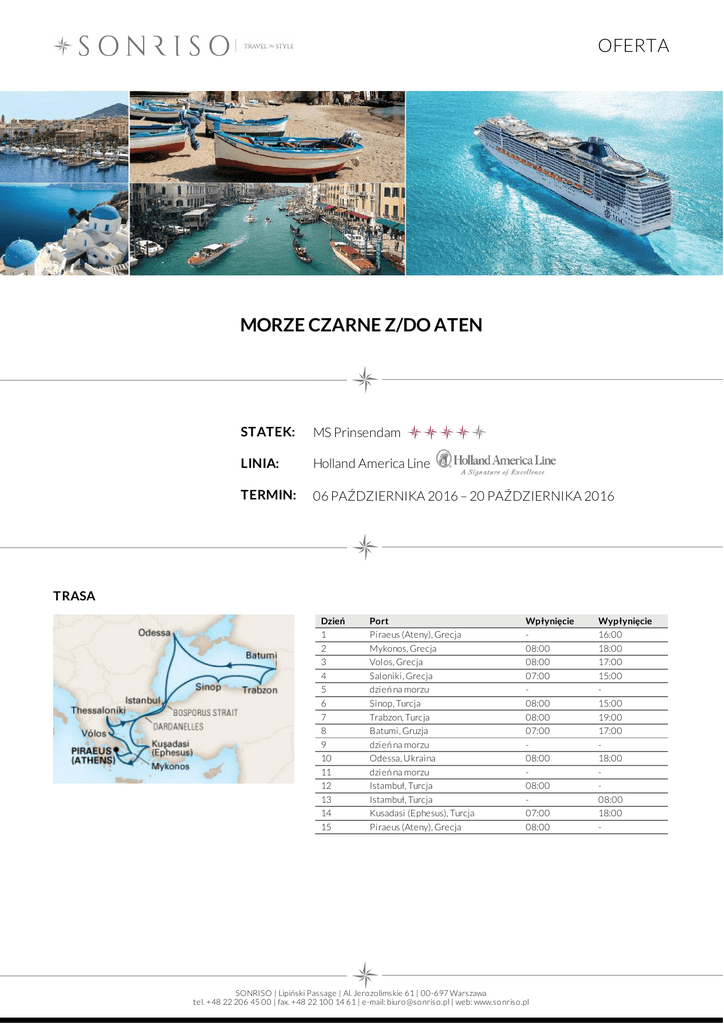 OFERTA MORZE CZARNE Z/DO ATEN STATEK: MS Prinsendam LINIA: Holland America Line TERMIN: 06 PAŹDZIERNIKA 2016 – 20 PAŹDZIERNIKA 2016 TRASA Dzień 1 2 3 4 5 6 7 8 9 10 11 12 13 14 15 Port Piraeus (Ateny), Grecja Mykonos, Grecja Volos, Grecja Saloniki, Grecja dzień na morzu Sinop, Turcja Trabzon, Turcja Batumi, Gruzja dzień na morzu Odessa, Ukraina dzień na morzu Istambuł, Turcja Istambuł, Turcja Kusadasi (Ephesus), Turcja Piraeus (Ateny), Grecja Wpłynięcie 08:00 08:00 07:00 08:00 08:00 07:00 08:00 08:00 07:00 08:00 SONRISO | Lipiński Passage | Al. Jero zo limskie 61 | 00-697 Warszawa tel. +48 22 206 45 00 | fax. +48 22 100 14 61 | e-mail: biuro @so nriso .pl | web: www.so nriso .pl Wypłynięcie 16:00 18:00 17:00 15:00 15:00 19:00 17:00 18:00 08:00 18:00 - OFERTA CENA Typ kabiny Cena z osobę Kabina wewnętrzna od 2 650 EUR Kabina z oknem od 2 850 EUR Kabina z balkonem od 3 950 EUR CENA ZAWIERA DOTATKOWE OPŁATY zakwaterowanie w 2 - os. kabinie wybranej kategorii pełne wyżywienie: 3 posiłki, przekąski między posiłakmi, bufet o północy napoje do posiłków: woda stołowa, kawa, herbata oraz sok do śniadania serwis bagażowy podczas wejścia i zejścia ze statku 24 godzinny serwis kabinowy korzystanie z urządzeń sportowo - rekreacyjnych dostępnych na pokładzie (baseny, jacuzzi, boiska sportowe, kluby dla dzieci i młodzieży itp.) udział we wszystkich imprezach organizowanych na pokładzie (przedstawienia, pokazy, aukcje, animacje i inne) obowiązkowe opłaty portowe dojazd/przelot do portu rozpoczęcia i zakończenia rejsu transfery (lotnisko - port - lotnisko) ewentulne noclegi przed lub po rejsie wycieczki fakultatywne napoje: bezalkoholowe, alkoholowe, woda mineralna dostępne w restauracjach i barach (istnieje możliwość wykupienia pakietów napojów, o szczegóły zapytaj w biurze) korzystanie z mini baru w kabinie korzystanie z usług typu: SPA, salon piękności, pralnia itp. wydatki osobiste tj. zakupy w butikach, internet, kasyno itp. obowiązkowa opłata serwisowa (napiwki dla obsługi statku ok. 12,50 USD/os. dorosła/dzień, dzieci poniżej 3 lat nie płacą) obowiązkowe ubezpieczenie turystyczne koszt wymaganych wiz Na życzenie świadczymy dodatkowo usługi: rezerwacje hotelowe na całym świecie rezerwacje biletów lotniczych, trasferów oraz parkingu w porcie rezerwacje wycieczek fakultatywnych i innych atrakcji SONRISO | Lipiński Passage | Al. Jero zo limskie 61 | 00-697 Warszawa tel. +48 22 206 45 00 | fax. +48 22 100 14 61 | e-mail: biuro @so nriso .pl | web: www.so nriso .pl
