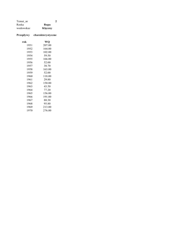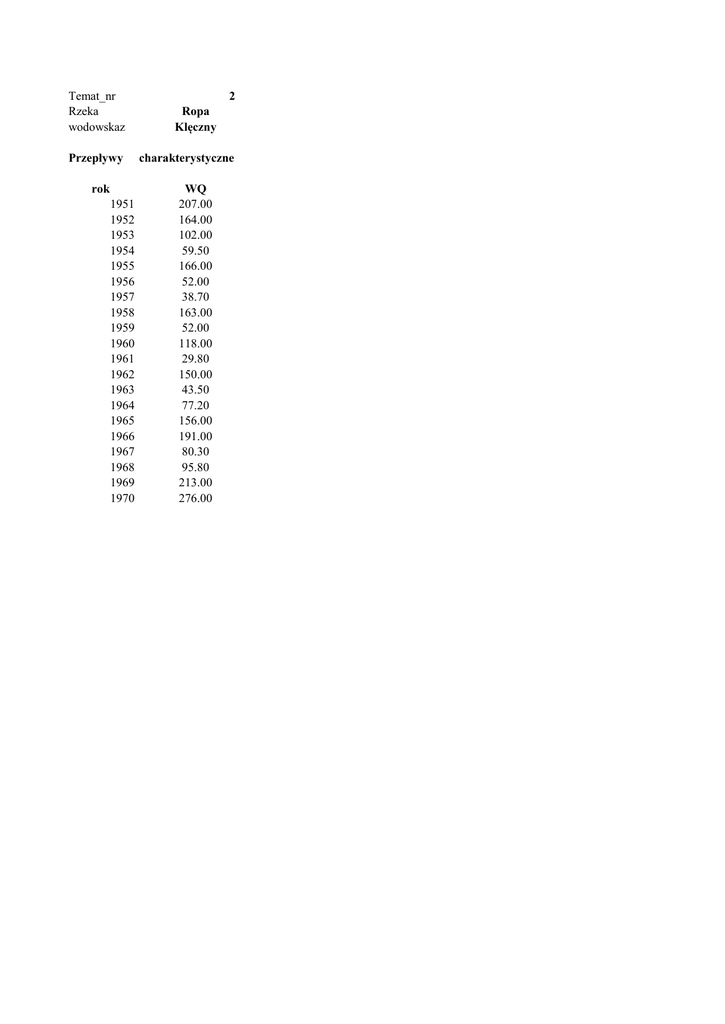 Temat_nr Rzeka wodowskaz Przepływy rok 1951 1952 1953 1954 1955 1956 1957 1958 1959 1960 1961 1962 1963 1964 1965 1966 1967 1968 1969 1970 2 Ropa Klęczny charakterystyczne WQ 207.00 164.00 102.00 59.50 166.00 52.00 38.70 163.00 52.00 118.00 29.80 150.00 43.50 77.20 156.00 191.00 80.30 95.80 213.00 276.00