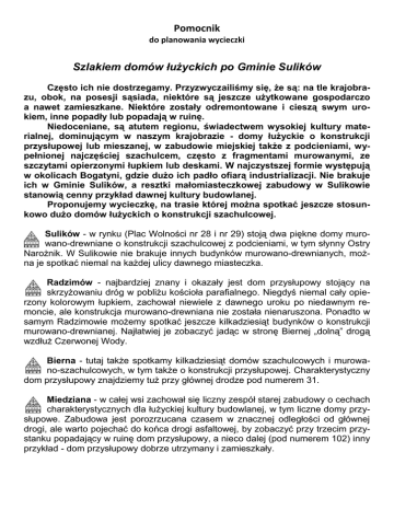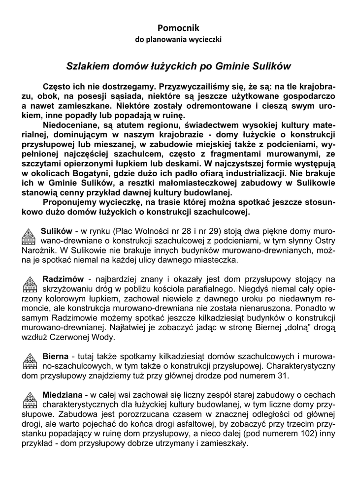 Pomocnik do planowania wycieczki Szlakiem domów łużyckich po Gminie Sulików Często ich nie dostrzegamy. Przyzwyczailiśmy się, że są: na tle krajobrazu, obok, na posesji sąsiada, niektóre są jeszcze użytkowane gospodarczo a nawet zamieszkane. Niektóre zostały odremontowane i cieszą swym urokiem, inne popadły lub popadają w ruinę. Niedoceniane, są atutem regionu, świadectwem wysokiej kultury materialnej, dominującym w naszym krajobrazie - domy łużyckie o konstrukcji przysłupowej lub mieszanej, w zabudowie miejskiej także z podcieniami, wypełnionej najczęściej szachulcem, często z fragmentami murowanymi, ze szczytami opierzonymi łupkiem lub deskami. W najczystszej formie występują w okolicach Bogatyni, gdzie dużo ich padło ofiarą industrializacji. Nie brakuje ich w Gminie Sulików, a resztki małomiasteczkowej zabudowy w Sulikowie stanowią cenny przykład dawnej kultury budowlanej. Proponujemy wycieczkę, na trasie której można spotkać jeszcze stosunkowo dużo domów łużyckich o konstrukcji szachulcowej. Sulików - w rynku (Plac Wolności nr 28 i nr 29) stoją dwa piękne domy murowano-drewniane o konstrukcji szachulcowej z podcieniami, w tym słynny Ostry Narożnik. W Sulikowie nie brakuje innych budynków murowano-drewnianych, można je spotkać niemal na każdej ulicy dawnego miasteczka. Radzimów - najbardziej znany i okazały jest dom przysłupowy stojący na skrzyżowaniu dróg w pobliżu kościoła parafialnego. Niegdyś niemal cały opierzony kolorowym łupkiem, zachował niewiele z dawnego uroku po niedawnym remoncie, ale konstrukcja murowano-drewniana nie została nienaruszona. Ponadto w samym Radzimowie możemy spotkać jeszcze kilkadziesiąt budynków o konstrukcji murowano-drewnianej. Najłatwiej je zobaczyć jadąc w stronę Biernej „dolną” drogą wzdłuż Czerwonej Wody. Bierna - tutaj także spotkamy kilkadziesiąt domów szachulcowych i murowano-szachulcowych, w tym także o konstrukcji przysłupowej. Charakterystyczny dom przysłupowy znajdziemy tuż przy głównej drodze pod numerem 31. Miedziana - w całej wsi zachował się liczny zespół starej zabudowy o cechach charakterystycznych dla łużyckiej kultury budowlanej, w tym liczne domy przysłupowe. Zabudowa jest porozrzucana czasem w znacznej odległości od głównej drogi, ale warto pojechać do końca drogi asfaltowej, by zobaczyć przy trzecim przystanku popadający w ruinę dom przysłupowy, a nieco dalej (pod numerem 102) inny przykład - dom przysłupowy dobrze utrzymany i zamieszkały.