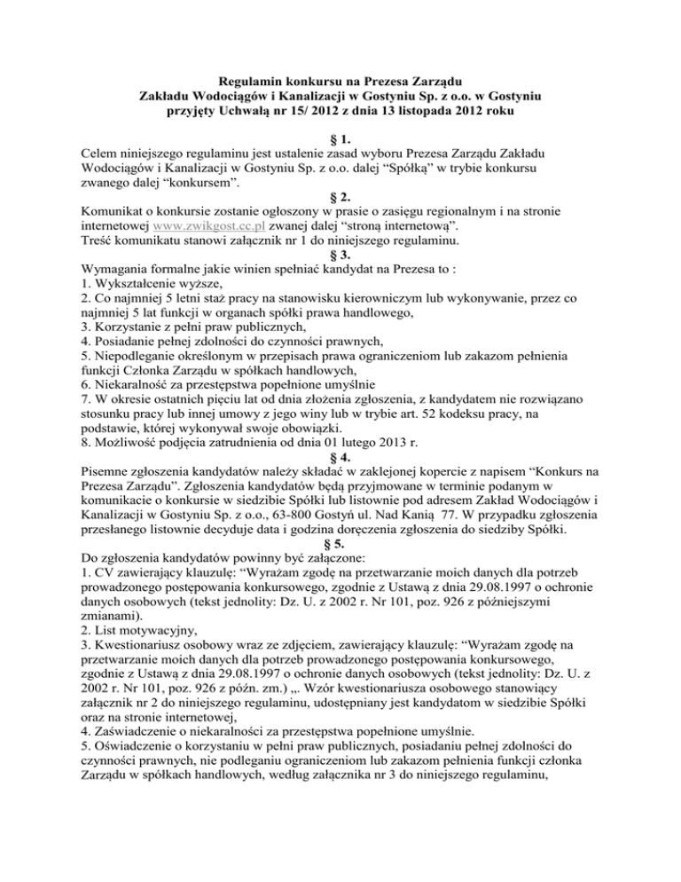 Regulamin konkursu na Prezesa Zarządu Zakładu Wodociągów i Kanalizacji w Gostyniu Sp. z o.o. w Gostyniu przyjęty Uchwałą nr 15/ 2012 z dnia 13 listopada 2012 roku § 1. Celem niniejszego regulaminu jest ustalenie zasad wyboru Prezesa Zarządu Zakładu Wodociągów i Kanalizacji w Gostyniu Sp. z o.o. dalej “Spółką” w trybie konkursu zwanego dalej “konkursem”. § 2. Komunikat o konkursie zostanie ogłoszony w prasie o zasięgu regionalnym i na stronie internetowej www.zwikgost.cc.pl zwanej dalej “stroną internetową”. Treść komunikatu stanowi załącznik nr 1 do niniejszego regulaminu. § 3. Wymagania formalne jakie winien spełniać kandydat na Prezesa to : 1. Wykształcenie wyższe, 2. Co najmniej 5 letni staż pracy na stanowisku kierowniczym lub wykonywanie, przez co najmniej 5 lat funkcji w organach spółki prawa handlowego, 3. Korzystanie z pełni praw publicznych, 4. Posiadanie pełnej zdolności do czynności prawnych, 5. Niepodleganie określonym w przepisach prawa ograniczeniom lub zakazom pełnienia funkcji Członka Zarządu w spółkach handlowych, 6. Niekaralność za przestępstwa popełnione umyślnie 7. W okresie ostatnich pięciu lat od dnia złożenia zgłoszenia, z kandydatem nie rozwiązano stosunku pracy lub innej umowy z jego winy lub w trybie art. 52 kodeksu pracy, na podstawie, której wykonywał swoje obowiązki. 8. Możliwość podjęcia zatrudnienia od dnia 01 lutego 2013 r. § 4. Pisemne zgłoszenia kandydatów należy składać w zaklejonej kopercie z napisem “Konkurs na Prezesa Zarządu”. Zgłoszenia kandydatów będą przyjmowane w terminie podanym w komunikacie o konkursie w siedzibie Spółki lub listownie pod adresem Zakład Wodociągów i Kanalizacji w Gostyniu Sp. z o.o., 63-800 Gostyń ul. Nad Kanią 77. W przypadku zgłoszenia przesłanego listownie decyduje data i godzina doręczenia zgłoszenia do siedziby Spółki. § 5. Do zgłoszenia kandydatów powinny być załączone: 1. CV zawierający klauzulę: “Wyrażam zgodę na przetwarzanie moich danych dla potrzeb prowadzonego postępowania konkursowego, zgodnie z Ustawą z dnia 29.08.1997 o ochronie danych osobowych (tekst jednolity: Dz. U. z 2002 r. Nr 101, poz. 926 z późniejszymi zmianami). 2. List motywacyjny, 3. Kwestionariusz osobowy wraz ze zdjęciem, zawierający klauzulę: “Wyrażam zgodę na przetwarzanie moich danych dla potrzeb prowadzonego postępowania konkursowego, zgodnie z Ustawą z dnia 29.08.1997 o ochronie danych osobowych (tekst jednolity: Dz. U. z 2002 r. Nr 101, poz. 926 z późn. zm.) „. Wzór kwestionariusza osobowego stanowiący załącznik nr 2 do niniejszego regulaminu, udostępniany jest kandydatom w siedzibie Spółki oraz na stronie internetowej, 4. Zaświadczenie o niekaralności za przestępstwa popełnione umyślnie. 5. Oświadczenie o korzystaniu w pełni praw publicznych, posiadaniu pełnej zdolności do czynności prawnych, nie podleganiu ograniczeniom lub zakazom pełnienia funkcji członka Zarządu w spółkach handlowych, według załącznika nr 3 do niniejszego regulaminu, udostępnionego kandydatom przez Spółkę w siedzibie przedsiębiorstwa oraz na stronie internetowej. 6. Kopie świadectw pracy lub innych stosownych dokumentów potwierdzających spełnienie warunków, o których mowa w § 3 punkt 2. 7. Kopie dyplomu ukończenia studiów oraz kursów i szkoleń, informacje o otrzymanych nagrodach i wyróżnieniach. 8. Aktualne zaświadczenie lekarskie o stanie zdrowia potwierdzające brak przeciwwskazań do pracy na stanowisku Prezesa Zarządu. 9. Oświadczenie o spełnieniu warunku określonego w § 3 pkt 7 niniejszego regulaminu. § 6. Kandydaci oprócz dokumentów wymienionych w § 5 niniejszego Regulaminu zobowiązani są dołączyć również koncepcję zarządzania Spółką (opracowanie do 5 stron znormalizowanego maszynopisu). § 7. Kandydaci mogą uzyskiwać informacje o Spółce osobiście do dnia upływu terminu składania zgłoszeń, w siedzibie Zarządu Spółki. Zakres informacji obejmuje: 1. Aktualny odpis z Rejestru Przedsiębiorców KRS, 2. Sprawozdanie finansowe za ostatni okres sprawozdawczy, 3. Umowę Spółki. § 8. Otwarcia zgłoszeń dokona Komisja Konkursowa. § 9. 1. Przewodniczący Komisji Konkursowej ustala harmonogram działań Komisji obejmujących weryfikację zgłoszeń pod kątem spełniania warunków określonych w regulaminie oraz terminy przeprowadzenia rozmów kwalifikacyjnych. 2. O terminie i miejscu przeprowadzenia rozmowy kwalifikacyjnej kandydaci spełniający wymogi formalne zostaną powiadomieni listownie lub telefonicznie, co najmniej na 2 dni przed terminem rozmowy. § 10. Rozmowy kwalifikacyjne z kandydatami będą przeprowadzane przez Komisję Konkursową w siedzibie Spółki. Nie zgłoszenie się kandydata na rozmowę kwalifikacyjną w określonym miejscu i terminie oznacza jego rezygnację z udziału w dalszym postępowaniu konkursowym. § 11. W toku rozmowy kwalifikacyjnej oceniane będą predyspozycje, wiedza i kwalifikacje kandydata w zakresie zagadnień, których przedmiot obejmuje w szczególności: 1. Wiedzę w zakresie działalności Spółki 2. Znajomość zagadnień związanych z zarządzaniem i kierowaniem zasobami ludzkimi, 3. Dotychczasowe osiągnięcia zawodowe i dodatkowe kwalifikacje, 4. Znajomość ograniczeń prowadzenia działalności gospodarczej przez osoby pełniące funkcje publiczne. § 12. Oprócz predyspozycji, wiedzy i kwalifikacji kandydata w zakresie zagadnień wymienionych w § 11niniejszego regulaminu dodatkowo oceniana będzie koncepcja zarządzania Spółką w oparciu o przedstawione opracowanie. § 13. Każdy z członków Komisji Konkursowej dokonuje oceny kwalifikacji i odpowiedzi na pytania na formularzu oceny kandydata, stanowiącym załącznik nr 4 do niniejszego Regulaminu. Formularze oceny kandydatów i zbiorcze formularze oceny kandydatów stanowią załączniki do protokołu z konkursu. Zbiorcze zestawienie ocen ma charakter pomocnicz