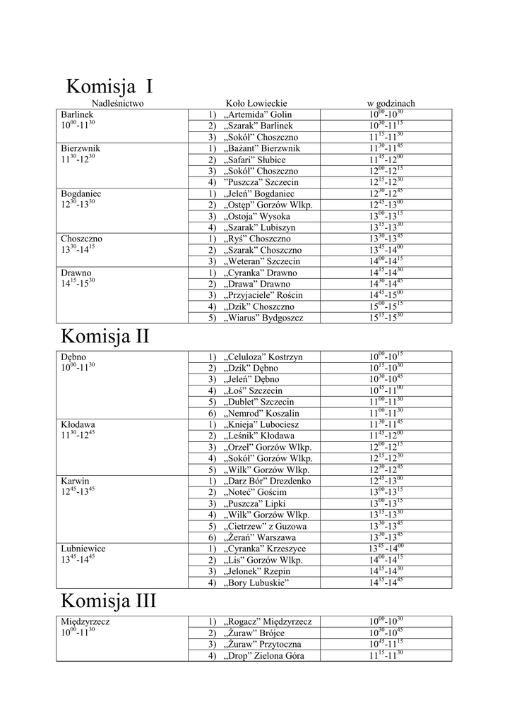 Komisja I Nadleśnictwo Barlinek 1000-1130 Bierzwnik 1130-1230 Bogdaniec 1230-1330 Choszczno 1330-1415 Drawno 1415-1530 1) 2) 3) 1) 2) 3) 4) 1) 2) 3) 4) 1) 2) 3) 1) 2) 3) 4) 5) Koło Łowieckie „Artemida” Golin „Szarak” Barlinek „Sokół” Choszczno „Bażant” Bierzwnik „Safari” Słubice „Sokół” Choszczno ”Puszcza” Szczecin „Jeleń” Bogdaniec „Ostęp” Gorzów Wlkp. „Ostoja” Wysoka „Szarak” Lubiszyn „Ryś” Choszczno „Szarak” Choszczno „Weteran” Szczecin „Cyranka” Drawno „Drawa” Drawno „Przyjaciele” Rościn „Dzik” Choszczno „Wiarus” Bydgoszcz w godzinach 1000-1030 1030-1115 1115-1130 1130-1145 1145-1200 1200-1215 1215-1230 1230-1245 1245-1300 1300-1315 1315-1330 1330-1345 1345-1400 1400-1415 1415-1430 1430-1445 1445-1500 1500-1515 1515-1530 1) 2) 3) 4) 5) 6) 1) 2) 3) 4) 5) 1) 2) 3) 4) 5) 6) 1) 2) 3) 4) „Celuloza” Kostrzyn „Dzik” Dębno „Jeleń” Dębno „Łoś” Szczecin „Dublet” Szczecin „Nemrod” Koszalin „Knieja” Lubociesz „Leśnik” Kłodawa „Orzeł” Gorzów Wlkp. „Sokół” Gorzów Wlkp. „Wilk” Gorzów Wlkp. „Darz Bór” Drezdenko „Noteć” Gościm „Puszcza” Lipki „Wilk” Gorzów Wlkp. „Cietrzew” z Guzowa „Żerań” Warszawa „Cyranka” Krzeszyce „Lis” Gorzów Wlkp. „Jelonek” Rzepin „Bory Lubuskie” 1000-1015 1015-1030 1030-1045 1045-1100 1100-1130 1100-1130 1130-1145 1145-1200 1200-1215 1215-1230 1230-1245 1245-1300 1300-1315 1300-1315 1315-1330 1330-1345 1330-1345 1345 -1400 1400-1415 1415-1430 1415-1445 1) 2) 3) 4) „Rogacz” Międzyrzecz „Żuraw” Brójce „Żuraw” Przytoczna „Drop” Zielona Góra 1000-1030 1030-1045 1045-1115 1115-1130 Komisja II Dębno 1000-1130 Kłodawa 1130-1245 Karwin 1245-1345 Lubniewice 1345-1445 Komisja III Międzyrzecz 1000-1130 Międzychód 1130-1245 Myślibórz 1245-1315 Ośno Lubuskie 1315-1500 1) 2) 3) 4) 5) 1) 2) 1) 2) 3) 4) 5) 6) „Jeleń” Krobielewko „Sokół” Gorzów Wlkp. „Żuraw” Przytoczna „Szarotka” Skwierzyna „Celuloza” Kostrzyn „Jeleń” Myślibórz „Grzywacz” Halinów „Bór” Słubice „Cyranka” Krzeszyce „Dzik” Słońsk „Knieja” Ośno „Łyska” Słońsk „Tumak” Osno 1130-1145 1145-1200 1200-1215 1215-1230 1230-1245 1245-1300 1300-1315 1315-1330 1330-1400 1400-1415 1415-1430 1430-1445 1445-1500 1) 2) 3) 1) 2) 3) 4) 5) 1) 2) 3) 1) 2) 3) 4) „Jeleń” Rzepin „Bór” Słubice „Drop” Zielona Góra „Cietrzew” Myślibórz „Diana” Myślibórz „Dzik” Myślibórz „Jeleń” Myślibórz „Darz Bór” Szczecin „Jeleń” Sulęcin „Szop” Wędrzyn „Cis” Ośno Lubuskie „Czarny Bór” Klesno „Knieja” Strzelce Kraj. „Ryś” Dobiegniew „Św. Hubert” Drezdenko 1000-1030 1030-1045 1030-1045 1045-1115 1115-1130 1130-1145 1145-1215 1145-1215 1215-1230 1230-1300 1300-1315 1315-1345 1345-1415 1415-1445 1445-1515 1) 2) 3) 4) 5) 6) 7) 1) 2) 3) 4) 5) 1) 2) 3) „Brzoza” Strzelce Kraj. „Jeleń” Drezdenko „Knieja” Strzelce Kraj. „Ostoja” Strzelce Kraj. „Św. Hubert” Drezdenko „Cyranka Lubuska” „Soból” Warszawa „Bory Lubuskie” „Korona” Międzyrzecz „Ponowa” Słubice „Szarotka” Skwierzyna „Wadera” Warszawa „Gon” Poznań „Ponowa” Międzyrzecz „Żuraw” Brójce 1000-1015 1015-1045 1045-1100 1100-1130 1100-1130 1130-1200 1200-1230 1230-1245 1245-1300 1300-1315 1315-1330 1330-1345 1345-1415 1415-1430 1430-1445 Komisja IV Rzepin 1000-1045 Różańsko 1045-1215 Sulęcin 1215-1315 Smolarz 1315-1515 Komisja V Strzelce Krajeńskie 1000-1230 Skwierzyna 1230-1345 Trzciel 1345-1445