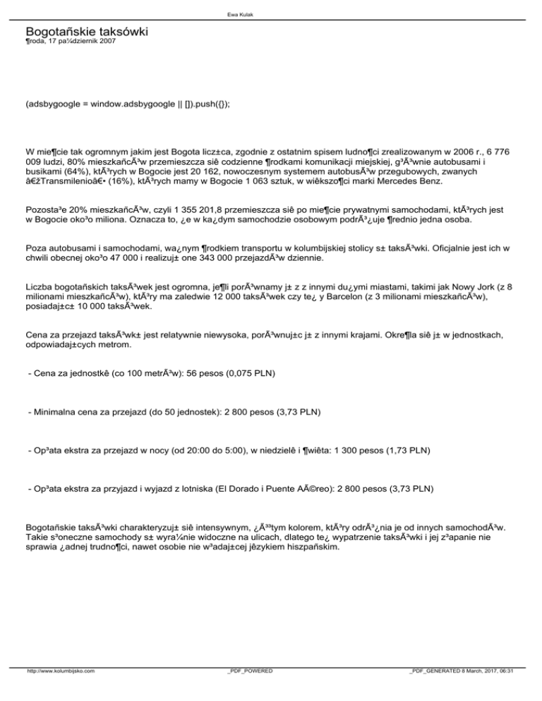 - Op³ata ekstra za przejazd w nocy (od 20:00 do 5:00), w niedzielê i ¶wiêta: 1 300 pesos (1,73 PLN)