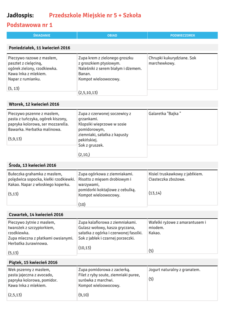 Jadłospis: Przedszkole Miejskie nr 5 + Szkoła Podstawowa nr 1 ŚNIADANIE OBIAD PODWIECZOREK Poniedziałek, 11 kwiecień 2016 Pieczywo razowe z masłem, pasztet z cielęciną, ogórek zielony, rzodkiewka. Kawa Inka z mlekiem. Napar z rumianku. (5, 13) Zupa krem z zielonego groszku z groszkiem ptysiowym. Naleśniki z serem białym i dżemem. Banan. Kompot wieloowocowy. Chrupki kukurydziane. Sok marchewkowy. (2,5,10,13) Wtorek, 12 kwiecień 2016 Pieczywo pszenne z masłem, pasta z tuńczyka, ogórek kiszony, papryka kolorowa, ser mozzarella. Bawarka. Herbatka malinowa. (5,9,13) Zupa z czerwonej soczewicy z grzankami. Klopsiki wieprzowe w sosie pomidorowym, ziemniaki, sałatka z kapusty pekińskiej. Sok z gruszek. Galaretka "Bajka " (2,10,) Środa, 13 kwiecień 2016 Bułeczka grahamka z masłem, Zupa ogórkowa z ziemniakami. polędwica sopocka, kiełki rzodkiewki. Risotto z mięsem drobiowym i Kakao. Napar z włoskiego koperku. warzywami, pomidorki koktajlowe z cebulką. (5,13) Kompot wieloowocowy. Kisiel truskawkowy z jabłkiem. Ciasteczka zbożowe. (13,14) (10) Czwartek, 14 kwiecień 2016 Pieczywo żytnie z masłem, twarożek z szczypiorkiem, rzodkiewka. Zupa mleczna z płatkami owsianymi. Herbatka żurawinowa. Zupa kalafiorowa z ziemniakami. Gulasz wołowy, kasza gryczana, sałatka z ogórka i czerwonej fasolki. Sok z jabłek i czarnej porzeczki. (10,13) (5,13) Wafelki ryżowe z amarantusem i miodem. Kakao. (5) Piątek, 15 kwiecień 2016 Wek pszenny z masłem, pasta jajeczna z avocado, papryka kolorowa, pomidor. Kawa Inka z mlekiem. Zupa pomidorowa z zacierką. Filet z ryby soute, ziemniaki puree, surówka z marchwi. Kompot wieloowocowy. (2,5,13) (9,10) Jogurt naturalny z granatem. (5) www.ePrzedszkole.com.pl