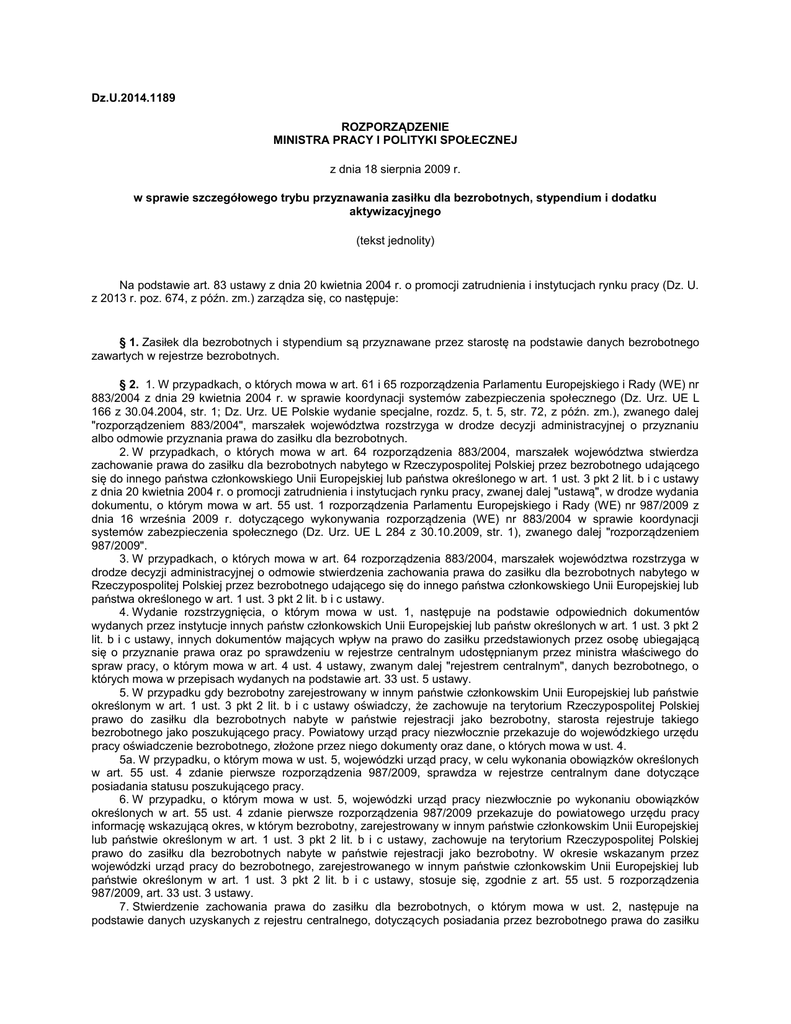 Dz.U.2014.1189 ROZPORZĄDZENIE MINISTRA PRACY I POLITYKI SPOŁECZNEJ z dnia 18 sierpnia 2009 r. w sprawie szczegółowego trybu przyznawania zasiłku dla bezrobotnych, stypendium i dodatku aktywizacyjnego (tekst jednolity) Na podstawie art. 83 ustawy z dnia 20 kwietnia 2004 r. o promocji zatrudnienia i instytucjach rynku pracy (Dz. U. z 2013 r. poz. 674, z późn. zm.) zarządza się, co następuje: § 1. Zasiłek dla bezrobotnych i stypendium są przyznawane przez starostę na podstawie danych bezrobotnego zawartych w rejestrze bezrobotnych. § 2. 1. W przypadkach, o których mowa w art. 61 i 65 rozporządzenia Parlamentu Europejskiego i Rady (WE) nr 883/2004 z dnia 29 kwietnia 2004 r. w sprawie koordynacji systemów zabezpieczenia społecznego (Dz. Urz. UE L 166 z 30.04.2004, str. 1; Dz. Urz. UE Polskie wydanie specjalne, rozdz. 5, t. 5, str. 72, z późn. zm.), zwanego dalej "rozporządzeniem 883/2004", marszałek województwa rozstrzyga w drodze decyzji administracyjnej o przyznaniu albo odmowie przyznania prawa do zasiłku dla bezrobotnych. 2. W przypadkach, o których mowa w art. 64 rozporządzenia 883/2004, marszałek województwa stwierdza zachowanie prawa do zasiłku dla bezrobotnych nabytego w Rzeczypospolitej Polskiej przez bezrobotnego udającego się do innego państwa członkowskiego Unii Europejskiej lub państwa określonego w art. 1 ust. 3 pkt 2 lit. b i c ustawy z dnia 20 kwietnia 2004 r. o promocji zatrudnienia i instytucjach rynku pracy, zwanej dalej "ustawą", w drodze wydania dokumentu, o którym mowa w art. 55 ust. 1 rozporządzenia Parlamentu Europejskiego i Rady (WE) nr 987/2009 z dnia 16 września 2009 r. dotyczącego wykonywania rozporządzenia (WE) nr 883/2004 w sprawie koordynacji systemów zabezpieczenia społecznego (Dz. Urz. UE L 284 z 30.10.2009, str. 1), zwanego dalej "rozporządzeniem 987/2009". 3. W przypadkach, o których mowa w art. 64 rozporządzenia 883/2004, marszałek województwa rozstrzyga w drodze decyzji administracyjnej o odmowie stwierdzenia zachowania prawa do zasiłku dla bezrobotnych nabytego w Rzeczypospolitej Polskiej przez bezrobotnego udającego się do innego państwa członkowskiego Unii Europejskiej lub państwa określonego w art. 1 ust. 3 pkt 2 lit. b i c ustawy. 4. Wydanie rozstrzygnięcia, o którym mowa w ust. 1, następuje na podstawie odpowiednich dokumentów wydanych przez instytucje innych państw członkowskich Unii Europejskiej lub państw określonych w art. 1 ust. 3 pkt 2 lit. b i c ustawy, innych dokumentów mających wpływ na prawo do zasiłku przedstawionych przez osobę ubiegającą się o przyznanie prawa oraz po sprawdzeniu w rejestrze centralnym udostępnianym przez ministra właściwego do spraw pracy, o którym mowa w art. 4 ust. 4 ustawy, zwanym dalej "rejestrem centralnym", danych bezrobotnego, o których mowa w przepisach wydanych na podstawie art. 33 ust. 5 ustawy. 5. W przypadku gdy bezrobotny zarejestrowany w innym państwie członkowskim Unii Europejskiej lub państwie określonym w art. 1 ust. 3 pkt 2 lit. b i c ustawy oświadczy, że zachowuje na terytorium Rzeczypospolitej Polskiej prawo do zasiłku dla bezrobotnych nabyte w państwie rejestracji jako bezrobotny, starosta rejestruje takiego bezrobotnego jako poszukującego pracy. Powiatowy urząd pracy niezwłocznie przekazuje do wojewódzkiego urzędu pracy oświadczenie bezrobotnego, złożone przez niego dokumenty oraz dane, o których mowa w ust. 4. 5a. W przypadku, o którym mowa w ust. 5, wojewódzki urząd pracy, w celu wykonania obowiązków określonych w art. 55 ust. 4 zdanie pierwsze rozporządzenia 987/2009, sprawdza w rejestrze centralnym dane dotyczące posiadania statusu poszukującego pracy. 6. W przypadku, o którym mowa w ust. 5, wojewódzki urząd pracy niezwłocznie po wykonaniu obowiązków określonych w art. 55 ust. 4 zdanie pierwsze rozporządzenia 987/2009 przekazuje do powiatowego urzędu pracy informację wskazującą okres, w którym bezrobotny, zarejestrowany w innym państwie członkowskim Unii Europejskiej lub państwie określonym w art. 1 ust. 3 pkt 2 lit. b i c ustawy, zachowuje na terytorium Rzeczypospolitej Polskiej prawo do zasiłku dla bezrobotnych nabyte w państwie rejestracji jako bezrobotny. W okresie wskazanym przez wojewódzki urząd pracy do bezrobotnego, zarejestrowanego w innym państwie członkowskim Unii Europejskiej lub państwie określonym w art. 1 ust. 3 pkt 2 lit. b i c ustawy, stosuje się, zgodnie z art. 55 ust. 5 rozporządzenia 987/2009, art. 33 ust. 3 ustawy. 7. Stwierdzenie zachowania prawa do zasiłku dla bezrobotnych, o którym mowa w ust. 2, następuje na podstawie danych uzyskanych z rejestru centralnego, dotyczących posiadania przez bezrobotnego prawa do zasiłku dla bezrobotnych, okresu, na jaki przysługuje zasiłek, wysokości zasiłku oraz wszelkich innych okoliczności wpływających na wypłatę zasiłku. 8. W przypadku, o którym mowa w ust. 2, wojewódzki urząd pracy, po otrzymaniu z instytucji innego państwa członkowskiego Unii Europejskiej lub państwa określonego w art. 1 ust. 3 pkt 2 lit. b i c ustawy informacji określonych w art. 55 ust. 4 rozporządzenia 987/2009, niezwłocznie przekazuje te informacje do powiatowego urzędu pracy. 9. Przed przedłużeniem, zgodnie z art. 64 ust. 1 lit. c zdanie drugie lub ust. 3 zdanie drugie rozporządzenia 883/2004, okresu zachowania prawa do zasiłku dla bezrobotnych, o którym mowa w ust. 2, marszałek województwa sprawdza w powiatowym urzędzie pracy, czy wobec bezrobotnego nie jest planowane zastosowanie jednej z usług rynku pracy oraz czy nie ma dla niego propozycji odpowiedniej pracy. 10. (uchylony). 11. Powiatowy urząd pracy niezwłocznie powiadamia wojewódzki urząd pracy o utracie statusu osoby bezrobotnej przez bezrobotnego, wobec którego jest prowadzone postępowanie administracyjne w sprawie, o której mowa w ust. 1, jeżeli utrata statusu nastąpi przed wydaniem w tej sprawie ostatecznej decyzji administracyjne