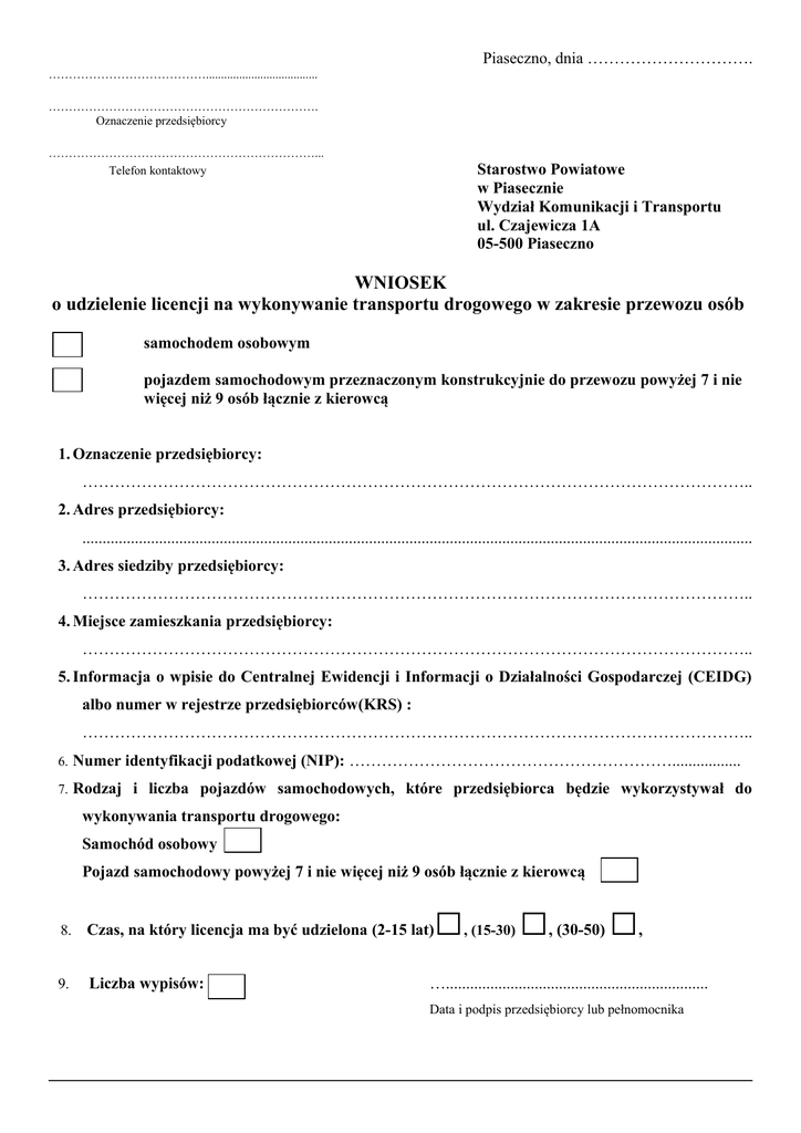 Piaseczno, dnia …………………………. …………………………………..................................... …………………………………………………………. Oznaczenie przedsiębiorcy …………………………………………………………... Telefon kontaktowy Starostwo Powiatowe w Piasecznie Wydział Komunikacji i Transportu ul. Czajewicza 1A 05-500 Piaseczno WNIOSEK o udzielenie licencji na wykonywanie transportu drogowego w zakresie przewozu osób samochodem osobowym pojazdem samochodowym przeznaczonym konstrukcyjnie do przewozu powyżej 7 i nie więcej niż 9 osób łącznie z kierowcą 1. Oznaczenie przedsiębiorcy: …………………………………………………………………………………………………………….. 2. Adres przedsiębiorcy: ...................................................................................................................................................................... 3. Adres siedziby przedsiębiorcy: …………………………………………………………………………………………………………….. 4. Miejsce zamieszkania przedsiębiorcy: …………………………………………………………………………………………………………….. 5. Informacja o wpisie do Centralnej Ewidencji i Informacji o Działalności Gospodarczej (CEIDG) albo numer w rejestrze przedsiębiorców(KRS) : …………………………………………………………………………………………………………….. 6. Numer identyfikacji podatkowej (NIP): ……………………………………………………................. 7. Rodzaj i liczba pojazdów samochodowych, które przedsiębiorca będzie wykorzystywał do wykonywania transportu drogowego: Samochód osobowy Pojazd samochodowy powyżej 7 i nie więcej niż 9 osób łącznie z kierowcą 8. Czas, na który licencja ma być udzielona (2-15 lat) 9. Liczba wypisów: □ , (15-30) □ , (30-50) □ , …................................................................. Data i podpis przedsiębiorcy lub pełnomocnika UWAGA! Konsekwencje błędnego wypełnienia formularza ponosi przedsiębiorca ….......................................................................................................................................................................... Miejscowość Data Czytelny podpis wnioskodawcy Załączniki do wniosku: 1. Oświadczenie osoby zarządzającej transportem drogowym o pełnieniu roli zarządzającego transportem drogowym (Załącznik ), 2. Kopia certyfikatu kompetencji zawodowych osoby zarządzającej transportem, 3. Oświadczenie członków organu zarządzającego osoby prawnej, osoby zarządzającej spółką jawną lub komandytową lub osoby prowadzącej działalność gospodarczą dotyczący spełnienia wymogu dobrej reputacji (Załącznik ) 4. Dokumenty potwierdzające spełnienie warunków dotyczących sytuacji finansowej przedsiębiorcy w wysokości 9000 euro na pierwszy pojazd samochodowy i 5000 euro na każdy następny pojazd samochodowy przeznaczony do transportu drogowego (roczne sprawozdanie finansowe tj. bilans i rachunek zysków i strat sporządzony na dzień 31.12 poprzedniego roku obrachunkowego albo dostępne środki pieniężne w gotówce lub na rachunku bankowym lub dostępne aktywa albo posiadanie akcji, udziałów lub innych zbywalnych papierów wartościowych albo gwarancja bankowa lub poręczenie bankowe albo własność nieruchomości tj. tytuł prawny potwierdzający własność nieruchomości i wycena nieruchomości lub ubezpieczenie) 5. Oświadczenie o zatrudnianiu kierowców lub zamiarze współpracy z osobami niezatrudnionymi przez przedsiębiorcę, lecz wykonującymi osobiście przewóz na rzecz przedsiębiorcy (Załącznik nr 3), 6. Wykaz pojazdów (Załącznik ) 7. Dowód uiszczenia opłaty administracyjnej za wydanie licencji i wypisów z tej licencji Potwierdzenie odbioru zezwolenia wraz z wypisami 1. Potwierdzam odbiór licencji na wykonywanie transportu drogowego w zakresie przewozu osób samochodem osobowym/ pojazdem samochodowym przeznaczonym konstrukcyjnie do przewozu powyżej 7 i nie więcej niż 9 osób łącznie z kierowcą numer ………………… oraz wypisów z przedmiotowej licencji w ilości …………………… szt. ……………………………………………… Data i podpis przedsiębiorcy lub pełnomocnika