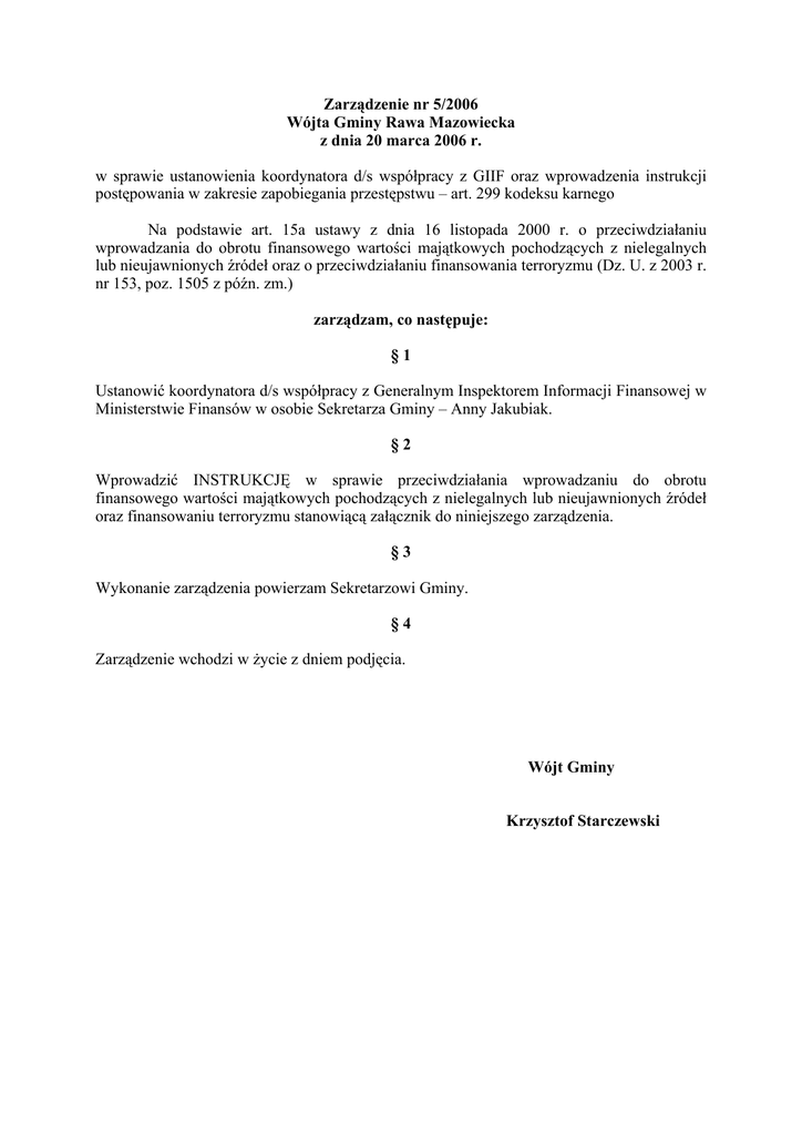 Zarządzenie nr 5/2006 Wójta Gminy Rawa Mazowiecka z dnia 20 marca 2006 r. w sprawie ustanowienia koordynatora d/s współpracy z GIIF oraz wprowadzenia instrukcji postępowania w zakresie zapobiegania przestępstwu – art. 299 kodeksu karnego Na podstawie art. 15a ustawy z dnia 16 listopada 2000 r. o przeciwdziałaniu wprowadzania do obrotu finansowego wartości majątkowych pochodzących z nielegalnych lub nieujawnionych źródeł oraz o przeciwdziałaniu finansowania terroryzmu (Dz. U. z 2003 r. nr 153, poz. 1505 z późn. zm.) zarządzam, co następuje: §1 Ustanowić koordynatora d/s współpracy z Generalnym Inspektorem Informacji Finansowej w Ministerstwie Finansów w osobie Sekretarza Gminy – Anny Jakubiak. §2 Wprowadzić INSTRUKCJĘ w sprawie przeciwdziałania wprowadzaniu do obrotu finansowego wartości majątkowych pochodzących z nielegalnych lub nieujawnionych źródeł oraz finansowaniu terroryzmu stanowiącą załącznik do niniejszego zarządzenia. §3 Wykonanie zarządzenia powierzam Sekretarzowi Gminy. §4 Zarządzenie wchodzi w życie z dniem podjęcia. Wójt Gminy Krzysztof Starczewski Załącznik do Zarządzenia nr 5/2006 Wójta Gminy z dnia 20 marca 2006 r. INSTRUKCJA w sprawie przeciwdziałania wprowadzaniu do obrotu finansowego wartości majątkowych pochodzących z nielegalnych lub nieujawnionych źródeł oraz finansowaniu terroryzmu w Urzędzie Gminy Rawa Mazowiecka Rozdział I Podstawy prawne § 1. Instrukcję opracowano na podstawie przepisów ogólnych obowiązujących oraz wypracowanych i sprawdzonych przez praktykę rozwiązań w zakresie organizacji, kontroli wewnętrznej, a w szczególności na podstawie: 1. Ustawy z dnia 30 czerwca 2005 r. o finansach publicznych ( Dz.U. z 2005 r., Nr 249, poz. 2104.), 2. Ustawy z dnia 29 września 1994 r. o rachunkowości (tekst jednolity Dz.U. z 2002 r., Nr 76, poz. 694 z późn. zm), 3. Ustawy z dnia 16 listopada 2000 r. o przeciwdziałaniu wprowadzania do obrotu finansowego wartości majątkowych pochodzących z nielegalnych lub nieujawnionych źródeł oraz o przeciwdziałaniu finansowania terroryzmu (art. 15a – tekst jednolity Dz.U. z 2003 r. Nr 153, poz. 1505 z późn. zm.), 4. Ustawy z dnia 6 czerwca 1997 r. Kodeks karny ( Dz.U. Nr 88, poz. 553 z późn. zm.). Rozdział II Objaśnienia – – – – – – – § 2. Ilekroć w niniejszej instrukcji jest mowa o: ustawie – dotyczy to ustawy z dnia 16 listopada 2000 r. o przeciwdziałaniu wprowadzania do obrotu finansowego wartości majątkowych pochodzących z nielegalnych lub nieujawnionych źródeł oraz o przeciwdziałaniu finansowania terroryzmu (tekst jednolity Dz.U. z 2003 r. Nr 153, poz. 1505 z późn. zm.), ustawie o finansach publicznych – dotyczy to ustawy z dnia 30 czerwca 2005 r. o finansach publicznych ( Dz.U. z 2005 r., Nr 249, poz. 2104), kodeksie karnym – dotyczy to ustawy z dnia 6 czerwca 1997 r. Kodeks karny (Dz.U. Nr 88, poz. 553 z późn. zm.), jednostce – oznacza to urząd gminy, kierowniku jednostki – oznacza to wójta gminy, głównym księgowym – oznacza to skarbnika gminy, GIIF – oznacza to Generalnego Inspektora Informacji Finansowej. § 3. Pracownicy jednostki właściwi merytorycznie z tytułu powierzonych im obowiązków, winni zapoznać się z treścią instrukcji i bezwzględnie przestrzegać zawartych w niej postanowień. Fakt zapoznania się z przepisami zawartymi w instrukcji winien być potwierdzony na specjalnym oświadczeniu, stanowiącym Załącznik Nr 1 do niniejszej instrukcji. § 4. Pracownicy jednostki w trakcie wykonywania obowiązków służbowych obowiązani są do zwracania uwagi na: 1) nietypowe transakcje związane z nabyciem majątku komunalnego, 2) umowy i transakcje związane z wykonywaniem przez inne podmioty zadań publicznych w jednostkach samorządu terytorialnego, realizowane na warunkach odbiegających od istniejących standardów, 3) nietypowe zachowania i czynności podejmowane przez uczestników postępowania o udzielenie zamówienia publicznego, polegające między innymi na oferowaniu przez nich warunków wykonania zamówienia, rażąco odbiegających od oferowanych przez innych oferentów, 4) przypadki dokonywania przez podatników nadpłat podatków i ewentualnego ich wycofywania, 5) udział kontrolowanych jednostek w nietypowych przedsięwzięciach, szczególnie finansowanych z udziałem kapitału zagranicznego, 6) dokonywanie wpłaty znacznych kwot gotówką, np. tytułem zapłaty za nabyte mienie komunalne, 7) dokonywanie wpłaty należności gotówką w ratach (kilkakrotnie), w tym samym dniu. § 5. 1. Pracownicy jednostki obowiązani są: 1) dokonywać analizy i oceny realizowanych transakcji w rozumieniu art. 2 pkt 2 ustawy, w którym występują symptomy wskazujące na możliwość wprowadzania do obrotu finansowego wartości majątkowych pochodzących z nielegalnych lub nieujawnionych źródeł, 2) sporządzać potwierdzone kopie dokumentów dotyczących transakcji, co do których zachodzi podejrzenie, że mają one związek z popełnieniem przestępstwa, o którym mowa w art. 299 kodeksu karnego, 3) zebrać dostępne informacje o osobach przeprowadzających te transakcje, 4) dokonać opisu transakcji, o których mowa wyżej wraz z uzasadnieniem, że zachodzą okoliczności wskazane w art. 15a ust 1 ustawy i istnieje uzasadniona potrzeba powiadomienia o tym GIIF, przedkładając projekt jego powiadomienia. 2. Pracownik kontroli wewnętrznej analizujący dokumenty jednostek, obowiązany jest do sporządzenia odpowiedniej notatki służbowej lub projektu powiadomienia GIIF i przekazania jej koordynatorowi d/s. współpracy z GIIF w przypadku stwierdzenia, że zachodzą podstawy do zawiadomienia GIIF o zagrożeniu popełnienia przestępstwa, o którym mowa w art. 299 kodeksu karnego. 3. Wzór powiadomienia GIIF stanowi Załącznik Nr 2 do niniejszej Instrukcji. § 6. 1. Koordynator d/s. współpracy z GIIF, uznając zasadność podjęcia działań wnioskowanych przez praco