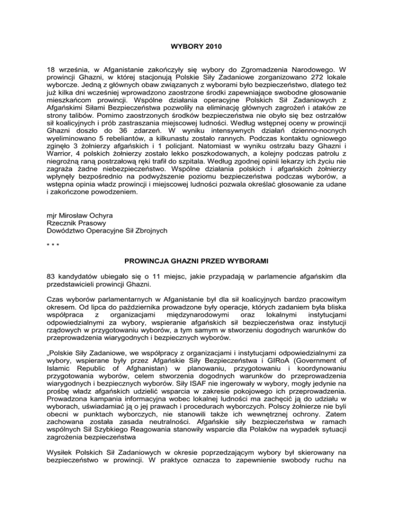 WYBORY 2010 18 września, w Afganistanie zakończyły się wybory do Zgromadzenia Narodowego. W prowincji Ghazni, w której stacjonują Polskie Siły Zadaniowe zorganizowano 272 lokale wyborcze. Jedną z głównych obaw związanych z wyborami było bezpieczeństwo, dlatego teŜ juŜ kilka dni wcześniej wprowadzono zaostrzone środki zapewniające swobodne głosowanie mieszkańcom prowincji. Wspólne działania operacyjne Polskich Sił Zadaniowych z Afgańskimi Siłami Bezpieczeństwa pozwoliły na eliminację głównych zagroŜeń i ataków ze strony talibów. Pomimo zaostrzonych środków bezpieczeństwa nie obyło się bez ostrzałów sił koalicyjnych i prób zastraszania miejscowej ludności. Według wstępnej oceny w prowincji Ghazni doszło do 36 zdarzeń. W wyniku intensywnych działań dzienno-nocnych wyeliminowano 5 rebeliantów, a kilkunastu zostało rannych. Podczas kontaktu ogniowego zginęło 3 Ŝołnierzy afgańskich i 1 policjant. Natomiast w wyniku ostrzału bazy Ghazni i Warrior, 4 polskich Ŝołnierzy zostało lekko poszkodowanych, a kolejny podczas patrolu z niegroźną raną postrzałową ręki trafił do szpitala. Według zgodnej opinii lekarzy ich Ŝyciu nie zagraŜa Ŝadne niebezpieczeństwo. Wspólne działania polskich i afgańskich Ŝołnierzy wpłynęły bezpośrednio na podwyŜszenie poziomu bezpieczeństwa podczas wyborów, a wstępna opinia władz prowincji i miejscowej ludności pozwala określać głosowanie za udane i zakończone powodzeniem. mjr Mirosław Ochyra Rzecznik Prasowy Dowództwo Operacyjne Sił Zbrojnych *** PROWINCJA GHAZNI PRZED WYBORAMI 83 kandydatów ubiegało się o 11 miejsc, jakie przypadają w parlamencie afgańskim dla przedstawicieli prowincji Ghazni. Czas wyborów parlamentarnych w Afganistanie był dla sił koalicyjnych bardzo pracowitym okresem. Od lipca do października prowadzone były operacje, których zadaniem była bliska współpraca z organizacjami międzynarodowymi oraz lokalnymi instytucjami odpowiedzialnymi za wybory, wspieranie afgańskich sił bezpieczeństwa oraz instytucji rządowych w przygotowaniu wyborów, a tym samym w stworzeniu dogodnych warunków do przeprowadzenia wiarygodnych i bezpiecznych wyborów. „Polskie Siły Zadaniowe, we współpracy z organizacjami i instytucjami odpowiedzialnymi za wybory, wspierane były przez Afgańskie Siły Bezpieczeństwa i GIRoA (Government of Islamic Republic of Afghanistan) w planowaniu, przygotowaniu i koordynowaniu przygotowania wyborów, celem stworzenia dogodnych warunków do przeprowadzenia wiarygodnych i bezpiecznych wyborów. Siły ISAF nie ingerowały w wybory, mogły jedynie na prośbę władz afgańskich udzielić wsparcia w zakresie pokojowego ich przeprowadzenia. Prowadzona kampania informacyjna wobec lokalnej ludności ma zachęcić ją do udziału w wyborach, uświadamiać ją o jej prawach i procedurach wyborczych. Polscy Ŝołnierze nie byli obecni w punktach wyborczych, nie stanowili takŜe ich wewnętrznej ochrony. Zatem zachowana została zasada neutralności. Afgańskie siły bezpieczeństwa w ramach wspólnych Sił Szybkiego Reagowania stanowiły wsparcie dla Polaków na wypadek sytuacji zagroŜenia bezpieczeństwa Wysiłek Polskich Sił Zadaniowych w okresie poprzedzającym wybory był skierowany na bezpieczeństwo w prowincji. W praktyce oznacza to zapewnienie swobody ruchu na głównych szlakach komunikacyjnych w prowincji, utrzymywanie w stałej gotowości i w razie konieczności uŜycie Sił Szybkiego Reagowania. Innym zadaniem dla naszych Ŝołnierzy było wsparcie władz prowincji w zakresie transportu członków komisji wyborczych oraz kandydatów, do tych miejsc do których dostęp jest utrudniony. Takich miejsc było 11. Wybory były przede wszystkim powaŜnym testem dla władz Afganistanu. Po pierwsze, to olbrzymie wyzwanie organizacyjne. Przygotowanie lokali wyborczych, komisji, materiałów informacyjnych, kart do głosowania. Po drugie, i to chyba sprawa zdecydowanie waŜniejsza, wybory są testem wiarygodności, a jednocześnie sprawności władz centralnych. Liczba czynnych punktów do głosowania i bezpieczeństwo podczas wyborów pozwalają ocenić czy i w jakim stopniu władze w Kabulu kontrolują podległe struktury państwowe i sytuację w sytuację w terenie. ZbliŜającym się wyborom towarzyszyły liczne zagroŜenia ze strony sił antyrządowych. Talibowie próbowali sabotować wybory nawołując do ich bojkotu, atakując ludność cywilną, punkty wyborcze, osoby kandydujące. W swoich działaniach niejednokrotnie posuwali się do porwań, uprowadzeń i morderstw. Efekt psychologiczny tych działań jest duŜy i mógł mieć wpływ zarówno na przebieg wyborów jak i na frekwencję wyborców. Inną sprawą była transparentność wyborów. Liczne nieprawidłowości podczas ostatnich wyborów prezydenckich powodowały obawy o przebieg elekcji parlamentarnej. NaleŜy pod uwagę brać równieŜ fakt, Ŝe w Afganistanie nie istnieje w zasadzie tradycja wyborów demokratycznych. W świadomości wielu mieszkańców tego państwa istnieje silne przekonanie, Ŝe wybory niczego nie zmienią. Co gorsza, wielu obywateli nie ma nawet wewnętrznej potrzeby pójścia do głosowania. Mając świadomość tak złoŜonej sytuacji, siły ISAF, w tym Polskie Siły Zadaniowe, włoŜyły sporo wysiłku, aby zapewnić moŜliwie najlepsze warunki do głosowania. Utrzymywane były ścisłe kontakty z władzami prowincji, wojska i policji. Przedstawiciele kontyngentu codziennie spotykali się z urzędnikami prowincji i NiezaleŜnej Komisji Wyborczej. Na długo przed wyborami dyskutowano o najwaŜniejszych problemach związanych z bezpieczeństwem i logistyką. Polskie Siły Zadaniowe prowadziły kompleksowe działania, których celem jest wsparcie przeprowadzenia wyborów, obejmujące operacje bojowe, ale równieŜ szereg działań niekinetycznych. Eliminowani byli kolejni rebelianci, którzy stanowią realne zagroŜenie dla społeczności lokalnych