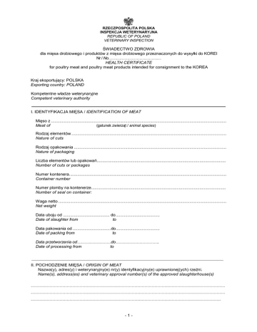 RZECZPOSPOLITA POLSKA INSPEKCJA WETERYNARYJNA REPUBLIC OF POLAND VETERINARY INSPECTION ŚWIADECTWO ZDROWIA dla mięsa drobiowego i produktów z mięsa drobiowego przeznaczonych do wysyłki do KOREI Nr / No………………………………… HEALTH CERTIFICATE for poultry meat and poultry meat products intended for consignment to the KOREA Kraj eksportujący: POLSKA Exporting country: POLAND Kompetentne władze weterynaryjne Competent veterinary authority I. IDENTYFIKACJA MIĘSA / IDENTIFICATION OF MEAT Mięso z ................................................................................................................................................... Meat of (gatunek zwierząt / animal species) Rodzaj elementów .................................................................................................................................. Nature of cuts Rodzaj opakowania ................................................................................................................................ Nature of packaging Liczba elementów lub opakowań................................................................................................................. Number of cuts or packages Numer kontenera.................................................................................................................................... Container number Numer plomby na kontenerze...................................................................................................................... Number of seal on container: Waga netto ............................................................................................................................................. Net weight Data uboju od ....................................... do..................................... Date of slaughter from to Data pakowania od ................................do..................................... Date of packing from to Data przetworzenia od……………………do…………………………. Date of processing from to II. POCHODZENIE MIĘSA / ORIGIN OF MEAT Nazwa(y), adres(y) i weterynaryjny(e) nr(y) identyfikacyjny(e) uprawnionej(ych) rzeźni. Name(s), address(es) and veterinary approval number(s) of the approved slaughterhouse(s) ……………………………………………………………………………………………………………………… ……………………………………………………………………………………………………………………… …………………………………………………………………………………………………………………… -1- Nazwa(y), adres(y) i weterynaryjny(e) nr(y) identyfikacyjny(e) uprawnionego(ych) zakładu(ów) rozbioru Name(s), address(es) and veterinary approval number(s) of the approved cutting plant(s) ………………………………………………………………………………………………………………… ………………………………………………………………………………………………………………… ………………………………………………………………………………………………………………… Nazwa(y), adres(y) i weterynaryjny(e) nr(y) identyfikacyjny(e) zakładu(ów) przetwórstwa Name(s), address(es) and veterinary approval number(s) of the approved processing plant(s) ………………………………………………………………………………………………………………… ………………………………………………………………………………………………………………… ……………………………………………………………………………………………………................. Nazwa(y), adres(y) i weterynaryjny(e) nr(y) identyfikacyjny(e) chłodni składowej (ych) Name(s), address(es) and veterinary approval number(s) of the approved cold store(s) ………………………………………………………………………………………………………………… ………………………………………………………………………………………………………………… ………………………………………………………………………………………………………………… III. PRZEZNACZENIE MIĘSA / DESTINATION OF MEAT Mięso wysyłane jest z ...................................................................................................................... The meat will be sent from (miejsce załadunku / place of loading) do .................................................................................................................................... to (kraj i miejsce przeznaczenia / country and place of destination) Data wysyłki ................................................................................................................................... Date of shipment 1) następującym środkiem transportu ……………………………………………………………………… 1) by the following means of transport Nazwa i adres wysyłającego………………………………................................................................ Name and address of consignor Nazwa i adres odbiorcy ................................................................................................................... Name and address of consignee IV. DEKLARACJA ZDROWOTNOŚCI / HYGIENE INFORMATION Ja, niŜej podpisany, urzędowy lekarz weterynarii zaświadczam, Ŝe: I, the undersigned, official veterinarian, certify that: 1. Kraj eksportujący jest wolny od wysoce zjadliwej grypy ptasiej (HPAI) przez okres 1 roku do czasu wysyłki. The exporting country is free from Highly Pathogenic Avian Influenza(HPAI) during the past 1 year prior to shipment of exporting products. 2. Nie stwierdzono przypadków wystąpienia chorob