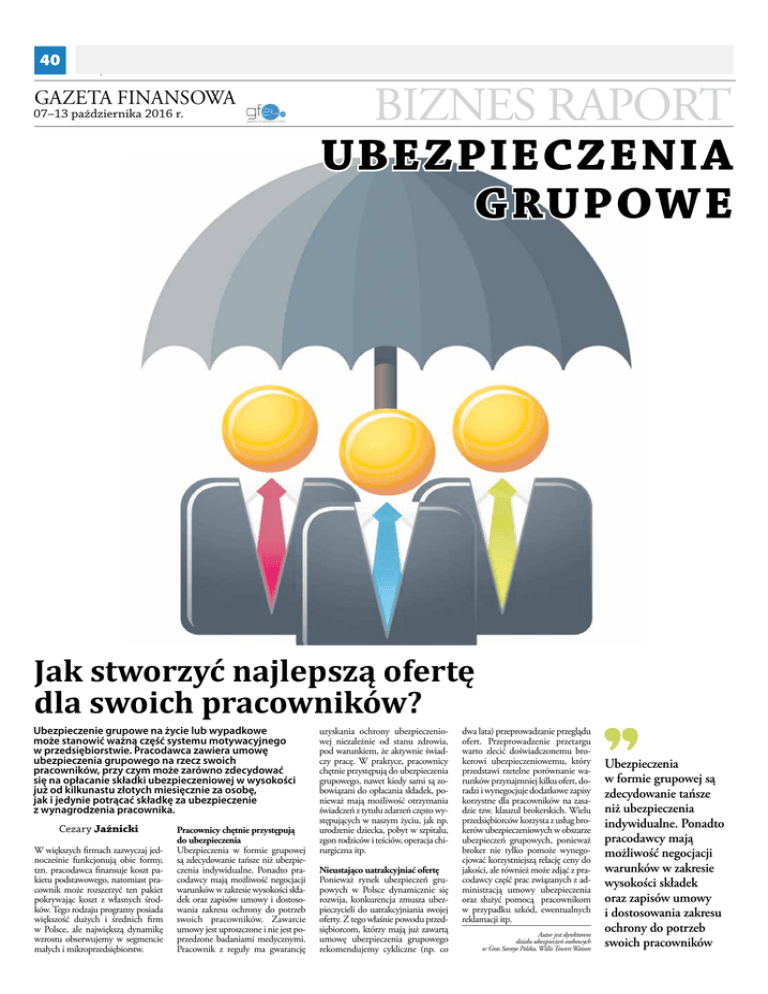 40 GAZETA FINANSOWA 07–13 października 2016 r. BIZNES RAPORT UBEZPIECZENIA GRUPOWE Jak stworzyć najlepszą ofertę dla swoich pracowników? Ubezpieczenie grupowe na życie lub wypadkowe może stanowić ważną część systemu motywacyjnego w przedsiębiorstwie. Pracodawca zawiera umowę ubezpieczenia grupowego na rzecz swoich pracowników, przy czym może zarówno zdecydować się na opłacanie składki ubezpieczeniowej w wysokości już od kilkunastu złotych miesięcznie za osobę, jak i jedynie potrącać składkę za ubezpieczenie z wynagrodzenia pracownika. Cezary Jaźnicki W większych firmach zazwyczaj jednocześnie funkcjonują obie formy, tzn. pracodawca finansuje koszt pakietu podstawowego, natomiast pracownik może rozszerzyć ten pakiet pokrywając koszt z własnych środków. Tego rodzaju programy posiada większość dużych i średnich firm w Polsce, ale największą dynamikę wzrostu obserwujemy w segmencie małych i mikroprzedsiębiorstw. Pracownicy chętnie przystępują do ubezpieczenia Ubezpieczenia w formie grupowej są zdecydowanie tańsze niż ubezpieczenia indywidualne. Ponadto pracodawcy mają możliwość negocjacji warunków w zakresie wysokości składek oraz zapisów umowy i dostosowania zakresu ochrony do potrzeb swoich pracowników. Zawarcie umowy jest uproszczone i nie jest poprzedzone badaniami medycznymi. Pracownik z reguły ma gwarancję uzyskania ochrony ubezpieczeniowej niezależnie od stanu zdrowia, pod warunkiem, że aktywnie świadczy pracę. W praktyce, pracownicy chętnie przystępują do ubezpieczenia grupowego, nawet kiedy sami są zobowiązani do opłacania składek, ponieważ mają możliwość otrzymania świadczeń z tytułu zdarzeń często występujących w naszym życiu, jak np. urodzenie dziecka, pobyt w szpitalu, zgon rodziców i teściów, operacja chirurgiczna itp. Nieustająco uatrakcyjniać ofertę Ponieważ rynek ubezpieczeń grupowych w Polsce dynamicznie się rozwija, konkurencja zmusza ubezpieczycieli do uatrakcyjniania swojej oferty. Z tego właśnie powodu przedsiębiorcom, którzy mają już zawartą umowę ubezpieczenia grupowego rekomendujemy cykliczne (np. co dwa lata) przeprowadzanie przeglądu ofert. Przeprowadzenie przetargu warto zlecić doświadczonemu brokerowi ubezpieczeniowemu, który przedstawi rzetelne porównanie warunków przynajmniej kilku ofert, doradzi i wynegocjuje dodatkowe zapisy korzystne dla pracowników na zasadzie tzw. klauzul brokerskich. Wielu przedsiębiorców korzysta z usług brokerów ubezpieczeniowych w obszarze ubezpieczeń grupowych, ponieważ broker nie tylko pomoże wynegocjować korzystniejszą relację ceny do jakości, ale również może zdjąć z pracodawcy część prac związanych z administracją umowy ubezpieczenia oraz służyć pomocą pracownikom w przypadku szkód, ewentualnych reklamacji itp. Autor jest dyrektorem działu ubezpieczeń osobowych w Gras Savoye Polska, Willis Towers Watson Ubezpieczenia w formie grupowej są zdecydowanie tańsze niż ubezpieczenia indywidualne. Ponadto pracodawcy mają możliwość negocjacji warunków w zakresie wysokości składek oraz zapisów umowy i dostosowania zakresu ochrony do potrzeb swoich pracowników UBEZPIECZENIA GRUPOWE BIZNES RAPORT 41 GAZETA FINANSOWA 07–13 października 2016 r. Dla pracownika czy pracodawcy? Grupowe ubezpieczenie na życie jest komunikowane jako benefit dla zatrudnionego, jednak w określonych okolicznościach poważne korzyści może z takiego ubezpieczenia czerpać także pracodawca. dr Filip Przydróżny Polisa to zabezpieczenie głównie dla pracownika, dla którego dobry program ubezpieczeniowy może być jednym z argumentów przemawiających za wyborem właśnie tego pracodawcy. Finansowana przez pracodawcę ochrona ubezpieczeniowa na rzecz swoich pracowników jest także elementem budowania lojalności kadr. Bądźmy szczerzy – 50 zł podwyżki, praktycznie na nikim nie zrobi wrażenia. Z pewnością też takie kwoty nie zwiększą zaangażowania pracownika, który pytany czy woli wzrost wynagrodzenia o 50 złotych, czy polisę na życie zazwyczaj wybierze to drugie. Polisa jest też jednak istotna dla pracodawcy – może zmniejszać fluktuacje pracowników w firmie, a w razie tragicznego zdarzenia odciąży firmę z części ustawowych opłat na rzecz poszkodowanego. Po co ubezpieczenie grupowe Ubezpieczeniem grupowym można objąć każdą zatrudnioną osobę – inaczej niż w polisach indywidualnych, gdzie nie wszystkie osoby mogą wykupić ochronę ubezpieczeniową. - Ubezpieczenie grupowe pozwala na tzw. uśrednianie ryzyka w ramach danego przedsiębiorstwa. Oznacza to, że dla większych grup można przyjąć do ubezpieczenia także osoby starsze, z pewnymi schorzeniami, chore – w przypadku grupowych ubezpieczeń na życie, czy wykonujące ryzykowny zawód – w przypadku grupowych ubezpieczeń następstw nieszczęśliwych wypadków. Przy ubezpieczeniach indywidualnych takie osoby albo nie mogłyby wykupić polisy, albo byłaby ona dużo droższa. Zorganizowana grupa osób ubezpieczonych to szansa na uzyskanie lepszej ceny (czyli niższej składki) niż w przypadku, gdyby każdy z pracowników szukał podobnego zakresu i sumy ubezpieczenia – przeciętnie o około 20-30 proc. Jeszcze innym atutem polis grupowych jest możliwość przystępowania do programów partnerów (małżonków). nikom pozapłacowe benefity. Spośród tych firm 54 proc. korzystało z programu wsparcia pracowników w przypadkach losowych. Dla pracodawcy ważny jest przede wszystkim aspekt wsparcia pracownika i przyspieszenie jego powrotu do pracy po przymusowej nieobecności spowodowanej uszczerbkiem na zdrowiu czy pobytem w szpitalu. Ubezpieczyciel wypłaci wówczas pracownikowi kwotę świadczenia wynikającą z zawartej umowy, a środki będą mogły zostać przeznaczone na rehabilitację bądź pokrycie zobowiązań osoby ubezpieczonej. Najistotniejszym celem ubezpieczenia jest zawsze ochrona przedsiębiorstw
