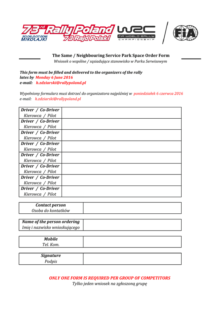 TheSame/NeighbouringServiceParkSpaceOrderForm Wniosekowspólne/sąsiadującestanowiskowParkuSerwisowym Thisformmustbefilledanddeliveredtotheorganizersoftherally latesby Monday6June2016 e‐mail: [email protected] Wypełnionyformularzmusidotrzećdoorganizatoranajpóźniejw poniedziałek6czerwca2016 e‐mail: [email protected] Driver/Co‐Driver Kierowca/Pilot Driver/Co‐Driver Kierowca/Pilot Driver/Co‐Driver Kierowca/Pilot Driver/Co‐Driver Kierowca/Pilot Driver/Co‐Driver Kierowca/Pilot Driver/Co‐Driver Kierowca/Pilot Driver/Co‐Driver Kierowca/Pilot Driver/Co‐Driver Kierowca/Pilot Contactperson Osobadokontatków Nameofthepersonordering Imięinazwiskownioskującego Mobile Tel.Kom. Signature Podpis ONLYONEFORMISREQUIREDPERGROUPOFCOMPETITORS Tylkojedenwnioseknazgłoszonągrupę