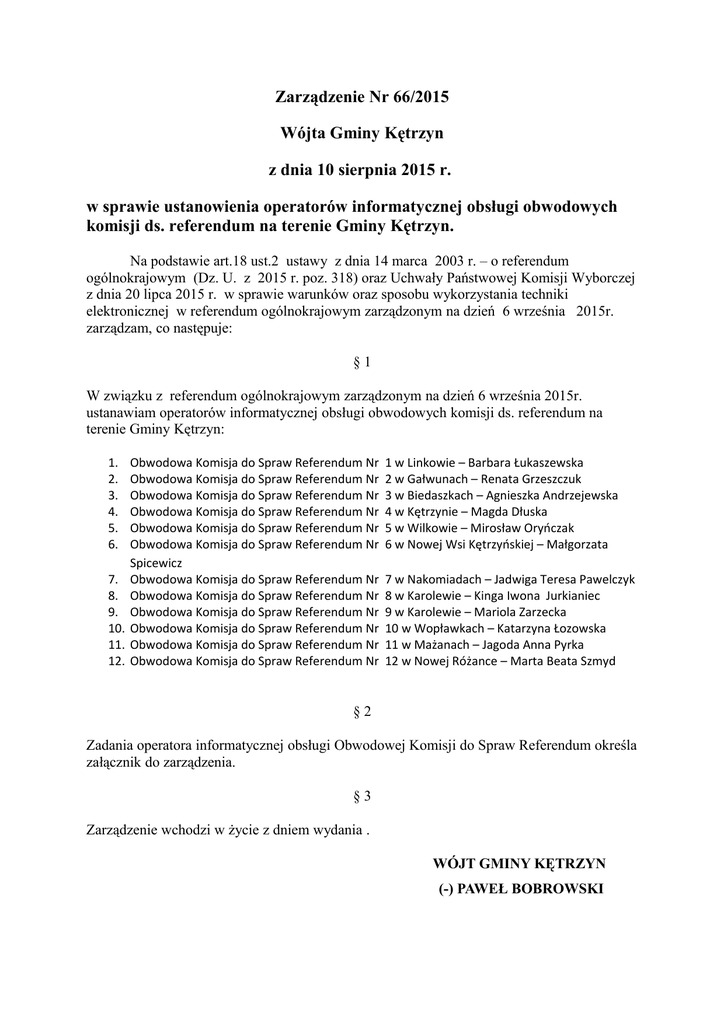 Zarządzenie Nr 66/2015 Wójta Gminy Kętrzyn z dnia 10 sierpnia 2015 r. w sprawie ustanowienia operatorów informatycznej obsługi obwodowych komisji ds. referendum na terenie Gminy Kętrzyn. Na podstawie art.18 ust.2 ustawy z dnia 14 marca 2003 r. – o referendum ogólnokrajowym (Dz. U. z 2015 r. poz. 318) oraz Uchwały Państwowej Komisji Wyborczej z dnia 20 lipca 2015 r. w sprawie warunków oraz sposobu wykorzystania techniki elektronicznej w referendum ogólnokrajowym zarządzonym na dzień 6 września 2015r. zarządzam, co następuje: §1 W związku z referendum ogólnokrajowym zarządzonym na dzień 6 września 2015r. ustanawiam operatorów informatycznej obsługi obwodowych komisji ds. referendum na terenie Gminy Kętrzyn: 1. 2. 3. 4. 5. 6. 7. 8. 9. 10. 11. 12. Obwodowa Komisja do Spraw Referendum Nr Obwodowa Komisja do Spraw Referendum Nr Obwodowa Komisja do Spraw Referendum Nr Obwodowa Komisja do Spraw Referendum Nr Obwodowa Komisja do Spraw Referendum Nr Obwodowa Komisja do Spraw Referendum Nr Spicewicz Obwodowa Komisja do Spraw Referendum Nr Obwodowa Komisja do Spraw Referendum Nr Obwodowa Komisja do Spraw Referendum Nr Obwodowa Komisja do Spraw Referendum Nr Obwodowa Komisja do Spraw Referendum Nr Obwodowa Komisja do Spraw Referendum Nr 1 w Linkowie – Barbara Łukaszewska 2 w Gałwunach – Renata Grzeszczuk 3 w Biedaszkach – Agnieszka Andrzejewska 4 w Kętrzynie – Magda Dłuska 5 w Wilkowie – Mirosław Oryńczak 6 w Nowej Wsi Kętrzyńskiej – Małgorzata 7 w Nakomiadach – Jadwiga Teresa Pawelczyk 8 w Karolewie – Kinga Iwona Jurkianiec 9 w Karolewie – Mariola Zarzecka 10 w Wopławkach – Katarzyna Łozowska 11 w Mażanach – Jagoda Anna Pyrka 12 w Nowej Różance – Marta Beata Szmyd §2 Zadania operatora informatycznej obsługi Obwodowej Komisji do Spraw Referendum określa załącznik do zarządzenia. §3 Zarządzenie wchodzi w życie z dniem wydania . WÓJT GMINY KĘTRZYN (-) PAWEŁ BOBROWSKI Zadania operatora informatycznej obsługi Obwodowej Komisji do Spraw Referendum. Do zadań operatora należy: 1) udział w szkoleniu organizowanym przez koordynatora gminnego, 2) udział w wyznaczonych terminach w testach ogólnokrajowych obejmujących wprowadzenie testowych wyników głosowania w zakresie obsługiwanych obwodów głosowania oraz przesłanie danych za pośrednictwem sieci publicznej lub w przypadku braku dostępu do sieci publicznej przekazanie danych do pełnomocnika komisarza wyborczego w gminie w wyznaczonym terminie, 3) odbiór za potwierdzeniem loginu i hasła operatora do systemu (na czas testów oraz dla obsługi referendum), 4) przygotowanie i sprawdzenie stanowiska komputerowego w zakresie konfiguracji dostępu do sieci publicznej i zainstalowanego oprogramowania oraz w przypadku braku dostępu do sieci publicznej instalacji oprogramowania wraz z wczytaniem właściwych plików definicyjnych klk, 5) potwierdzenie dostępu do sieci publicznej, łączności ze stronami, na których udostępniono WOW oraz ewentualnie instalacji wersji offline wraz z zainstalowaniem właściwych plików klk, 6) ustalenie z przewodniczącym obwodowej komisji ds. referendum, najpóźniej w przeddzień głosowania, miejsca i harmonogramu pracy, 7) wprowadzenie danych z projektu protokołu wyników głosowania w obwodzie przekazanego przez przewodniczącego lub zastępcę przewodniczącego obwodowej komisji ds. referendum, 8) w przypadku wystąpienia błędów lub ostrzeżeń - wydrukowanie i przekazanie przewodniczącemu obwodowej komisji ds. referendum zestawienia błędów do wprowadzonego protokołu, 9) zgłaszanie przewodniczącemu obwodowej komisji ds. referendum błędnych danych o siedzibie obwodowej komisji ds. referendum lub o godzinach rozpoczęcia i zakończenia głosowania, 10) wydrukowanie i przekazanie przewodniczącemu obwodowej komisji ds. referendum do podpisania niezbędnej liczby egzemplarzy projektów protokołów głosowania w obwodzie, 11) po podpisaniu przez komisję protokołu, przesłanie do systemu danych z protokołu głosowania w obwodzie, 12) w przypadku braku możliwości technicznych przesłania danych do systemu zapisanie danych z protokołu głosowania na nośniku informatycznym i dołączenie go do dokumentów przekazywanych do komisarza wyborczego, 13) udostępnienie funkcji uwierzytelnienia, za pomocą kodów jednorazowych, danych protokołu przekazanego do systemu, przewodniczącemu lub zastępcy przewodniczącego. WÓJT GMINY KĘTRZYN (-) PAWEŁ BOBROWSKI