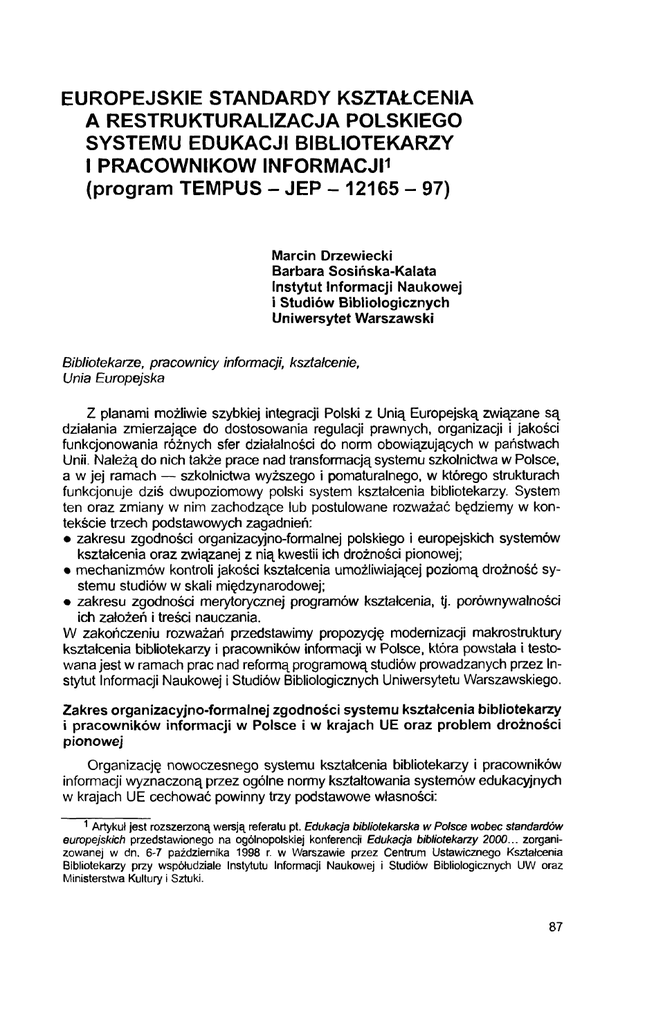 EUROPEJSKIE STANDARDY KSZTAŁCENIA A RESTRUKTURALIZACJA POLSKIEGO SYSTEMU EDUKACJI BIBLIOTEKARZY I PRACOWNIKOW INFORMACJI1 (program TEMPUS - JEP - 12165 - 97) Marcin Drzewiecki Barbara Sosińska-Kalata Instytut Informacji Naukowej i Studiów Bibliologicznych Uniwersytet Warszawski Bibliotekarze, pracownicy informacji, kształcenie, Unia Europejska Z planami możliwie szybkiej integracji Polski z Unią Europejską związane są działania zmierzające do dostosowania regulacji prawnych, organizacji i jakości funkcjonowania różnych sfer działalności do norm obowiązujących w państwach Unii. Należą do nich także prace nad transformacją systemu szkolnictwa w Polsce, a w jej ramach — szkolnictwa wyższego i pomaturalnego, w którego strukturach funkcjonuje dziś dwupoziomowy polski system kształcenia bibliotekarzy. System ten oraz zmiany w nim zachodzące lub postulowane rozważać będziemy w kon tekście trzech podstawowych zagadnień: • zakresu zgodności organizacyjno-formalnej polskiego i europejskich systemów kształcenia oraz związanej z nią kwestii ich drożności pionowej; • mechanizmów kontroli jakości kształcenia umożliwiającej poziomą drożność sy stemu studiów w skali międzynarodowej; • zakresu zgodności merytorycznej programów kształcenia, tj. porównywalności ich założeń i treści nauczania. W zakończeniu rozważań przedstawimy propozycję modernizacji makrostruktury kształcenia bibliotekarzy i pracowników informacji w Polsce, która powstała i testo wana jest w ramach prac nad reformą programową studiów prowadzanych przez In stytut Informacji Naukowej i Studiów Bibliologicznych Uniwersytetu Warszawskiego. Zakres organizacyjno-formalnej zgodności systemu kształcenia bibliotekarzy i pracowników informacji w Polsce i w krajach UE oraz problem drożności pionowej Organizację nowoczesnego systemu kształcenia bibliotekarzy i pracowników informacji wyznaczoną przez ogólne normy kształtowania systemów edukacyjnych w krajach UE cechować powinny trzy podstawowe własności: 1 Artykuł jest rozszerzoną wersją referatu pt. Edukacja bibliotekarska w Polsce wobec standardów europejskich przedstawionego na ogólnopolskiej konferencji Edukacja bibliotekarzy 2000... zorgani zowanej w dn. 6-7 października 1998 r. w Warszawie przez Centrum Ustawicznego Kształcenia Bibliotekarzy przy współudziale Instytutu Informacji Naukowej i Studiów Bibliologicznych UW oraz Ministerstwa Kultury i Sztuki. 87 • ekonomiczność kształcenia zapewniona przez jego stratyfikację i jednoznaczne określenie kwalifikacji uzyskiwanych na poszczególnych poziomach nauczania; • drożność pionowa zapewniająca możliwość podnoszenia poziomu kwalifikacji od powiednio do potrzeb i aspiracji uczących się; • upowszechnienie wykształcenia wyższego jako podstawy pełnego wykształcenia specjalistycznego wykwalifikowanej kadry bibliotecznej i informacyjnej przy rów noczesnym wyodrębnieniu różnych jego poziomów. Warto zauważyć, iż model ten, choć uważany za najwłaściwszy, nie jest speł niony przez systemy organizacji kształcenia bibliotekarzy i pracowników informacji funkcjonujące w wielu krajach Unii2. Dotyczy to przede wszystkim drugiego i trze ciego z wymienionych postulatów. Tradycyjna, funkcjonująca przez blisko czterdzieści lat makrostruktura kształ cenia bibliotekarzy i pracowników informacji w Polsce miała zasadniczo postać sy stemu dwustopniowego, obejmującego dwa nieskorelowane ze sobą typy studiów: dwuletnie studia pomaturalne (lub policealne) formalnie zapewniające średnie wy kształcenie biblioteczne lub dokumentacyjne, pięcioletnie magisterskie studia bib liotekoznawstwa i informacji naukowej lub specjalizacje bibliotekoznawcze prowa dzone w ramach pięcioletnich studiów filologicznych w uniwersytetach i wyższych szkołach pedagogicznych formalnie zapewniające wyższe wykształcenie biblio teczne i informacyjne. Na poziomie wykształcenia średniego ten podstawowy układ uzupełniały licea lub technika bibliotekarskie i dokumentacyjne. Na poziomie kształ cenia wyższego uzupełnienie pięcioletnich studiów magisterskich i magisterskich specjalizacji stanowiły roczne, półtoraroczne lub dwuletnie pomagisterskie studia podyplomowe. Pożądanym, ale efemerycznym ogniwem polskiego systemu kształ cenia kadr bibliotecznych i informacyjnych były i są studia doktoranckie. W prowadzonych od lat dyskusjach o wadliwości tego systemu przede wszyst kim podkreśla się jego niedrożność pionową, czyli wspomniany brak korelacji mię dzy studiami pomaturalnymi i studiami wyższymi. Uzyskanie bibliotekoznawczego wykształcenia wyższego przez absolwenta pomaturalnej szkoły bibliotekarskiej for malnie trwać bowiem powinno dokładnie tak samo długo, jak zdobycie tego wy kształcenia przez absolwenta liceum ogólnokształcącego, mimo iż pierwszy przez dwa lata poznawał już tajniki pracy biblioteczno-informacyjnej i uzyskał uprawnienia zawodowe bibliotekarza lub dokumentalisty, a drugi dysponuje jedynie ogólnym wykształceniem średnim. W sytuacji podobnej jak absolwenci pomaturalnych stu diów bibliotekarskich i dokumentacyjnych znajdują się też absolwenci bibliotekar skich, księgarskich i dokumentacyjnych liceów i techników. Oni również traktowani są równorzędnie z absolwentami liceów ogólnokształcących lub techników kształ cących w dowolnej innej dziedzinie. W konsekwencji zatem droga do biblioteko znawczego magisterium w przypadku maturzysty — absolwenta dowolnego rodza ju szkoły średniej trwa 5 lat, a w przypadku słuchacza pomaturalnych szkół biblio tekarskich i dokumentacyjnych 7 lat. Dyplomy studiów pomaturalnych i studiów ma gisterskich zapewniają przy tym niewiele różniące się i de facto mało znaczące uprawnienia zawodowe3. Istotnym kluczem do rozwoju kariery zawodowej jest bo 2 Por. np. A. M. Heusmann: Kształcenie bibliotekarzy w RFN. W: E. B. Zybert, M. Szys