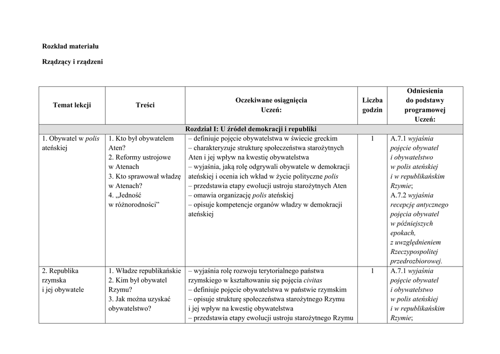 Rozkład materiału Rządzący i rządzeni Temat lekcji 1. Obywatel w polis ateńskiej 2. Republika rzymska i jej obywatele Treści Oczekiwane osiągnięcia Uczeń: Rozdział I: U źródeł demokracji i republiki 1. Kto był obywatelem – definiuje pojęcie obywatelstwa w świecie greckim Aten? – charakteryzuje strukturę społeczeństwa starożytnych 2. Reformy ustrojowe Aten i jej wpływ na kwestię obywatelstwa w Atenach – wyjaśnia, jaką rolę odgrywali obywatele w demokracji 3. Kto sprawował władzę ateńskiej i ocenia ich wkład w życie polityczne polis w Atenach? – przedstawia etapy ewolucji ustroju starożytnych Aten 4. „Jedność – omawia organizację polis ateńskiej w różnorodności” – opisuje kompetencje organów władzy w demokracji ateńskiej 1. Władze republikańskie 2. Kim był obywatel Rzymu? 3. Jak można uzyskać obywatelstwo? – wyjaśnia rolę rozwoju terytorialnego państwa rzymskiego w kształtowaniu się pojęcia civitas – definiuje pojęcie obywatelstwa w państwie rzymskim – opisuje strukturę społeczeństwa starożytnego Rzymu i jej wpływ na kwestię obywatelstwa – przedstawia etapy ewolucji ustroju starożytnego Rzymu Liczba godzin 1 1 Odniesienia do podstawy programowej Uczeń: A.7.1 wyjaśnia pojęcie obywatel i obywatelstwo w polis ateńskiej i w republikańskim Rzymie; A.7.2 wyjaśnia recepcję antycznego pojęcia obywatel w późniejszych epokach, z uwzględnieniem Rzeczypospolitej przedrozbiorowej. A.7.1 wyjaśnia pojęcie obywatel i obywatelstwo w polis ateńskiej i w republikańskim Rzymie; – wymienia najważniejsze organy i urzędy republiki rzymskiej – porównuje i ocenia prawa oraz obowiązki obywateli w świecie greckim i rzymskim – tłumaczy, na czym polegały reguły ius soli oraz ius sanguinis w świecie antycznym i jaką rolę odgrywają współcześnie 3. Tradycja antycznej demokracji i republiki w późniejszych epokach 1. Republiki w średniowieczu 2. Obywatele średniowiecznych miast 3. Republika Niderlandów 4. Demokratyczne i republikańskie tradycje polskiej szlachty 1. Władcy średniowiecznej Europy 1. Królestwo Franków i Kościół 2. Cesarstwo uniwersalistyczne – wymienia przykłady recepcji antycznej tradycji politycznej w późniejszych epokach – omawia uwarunkowania uzyskania praw obywatelskich przez średniowieczne mieszczaństwo – przedstawia prawa i wolności średniowiecznego mieszczaństwa oraz jego wewnętrze rozwarstwienie – opisuje osiągnięcia republik kupieckich – charakteryzuje organy władzy Republiki Weneckiej i Republiki Zjednoczonych Prowincji – prezentuje wspólne cechy między demokracją szlachecką w Rzeczypospolitej a ustrojem polis ateńskiej i republiki rzymskiej – tłumaczy wpływ ideologii sarmackiej na sposób rozumienia praw i obowiązków polskiej szlachty względem państwa Rozdział II: Królowie i poddani – wymienia okoliczności powstania państwa Franków i Państwa Kościelnego oraz wzajemne relacje między nimi – przedstawia okoliczności odnowienia cesarstwa przez 1 1 A.7.2 wyjaśnia recepcję antycznego pojęcia obywatel w późniejszych epokach, z uwzględnieniem Rzeczypospolitej przedrozbiorowej. A.7.2 wyjaśnia recepcję antycznego pojęcia obywatel w późniejszych epokach, z uwzględnieniem Rzeczypospolitej przedrozbiorowej. B.7.1 charakteryzuje zakres władzy cesarza, papieża i króla oraz ich wzajemne relacje 3. Cezaropapizm czy papocezaryzm? 4. Jak przedstawiano pochodzenie władzy monarszej? 2. Feudalizm w średniowieczu 1. Czym był feudalizm? 2. System lenny 3. Poddaństwo chłopów 3. Miasta średniowiecznej Europy 1. Od upadku do rozkwitu 2. Lokacje miejskie 3. Samorząd miejski 4. Gildie i cechy Ottona I – wyjaśnia, na czym polegała idea uniwersalizmu cesarskiego – porównuje koncepcje cezaropapizmu i papocezaryzmu – charakteryzuje rywalizację między cesarstwem a papiestwem w VIII–XIV w. – określa doktrynalne podstawy władzy w średniowieczu – podaje cechy ideologii władzy książąt i królów, cesarza oraz papieża – tłumaczy znaczenie terminu feudalizm – omawia relacje między seniorem i wasalem oraz obowiązki każdego z nich – przedstawia proces kształtowania się drabiny feudalnej w społeczeństwie i wynikające z tego konsekwencje – wyjaśnia, na czym polegała zależność chłopa od pana feudalnego – opisuje proces rozprzestrzeniania się systemu wasalnolennego w Europie – ocenia stosunki własności występujące w średniowieczu – przedstawia proces odradzania się miast w średniowiecznej Europie – wyjaśnia, na czym polegała lokacja miasta i jakie niosła korzyści dla jego mieszkańców – omawia organizację i kompetencje samorządu miejskiego – charakteryzuje zadania i funkcje cechów w średniowieczu; opisuje zakres władzy samorządu miejskiego w średniowiecznym mieście. 1 B.7.2 analizuje relikty świata feudalnego w późniejszych epokach. 1 B.7.1 charakteryzuje zakres władzy cesarza, papieża i króla oraz ich wzajemne relacje w średniowieczu; opisuje zakres władzy samorządu miejskiego – tłumaczy, jaką rolę odgrywały gildie i hanzy 4. Kształtowanie się parlamentaryzmu europejskiego 1. Obywatele czy poddani? 1. Początki parlamentaryzmu angielskiego 2. Organizacja i działanie parlamentu angielskiego 3. Stany Generalne we Francji 4. Kompetencje Stanów Generalnych 5. Zgromadzenia stanowe w innych krajach europejskich 1. Prawa człowieka i prawa obywatela 2. Rewolucja angielska 3. Nowożytne teorie umowy społecznej – przedstawia proces kształtowania się monarchii stanowych – opisuje genezę parlamentaryzmu angielskiego i francuskiego – charakteryzuje organizację i funkcjonowanie parlamentu angielskiego oraz Stanów Generalnych, a także prezentuje kompetencje tych zgromadzeń – ocenia relacje między królem oraz zgromadzeniami stanowymi w Anglii i Francji – omawia pochodzenie pierwszych parlamentów w innych wybranych krajach europejski
