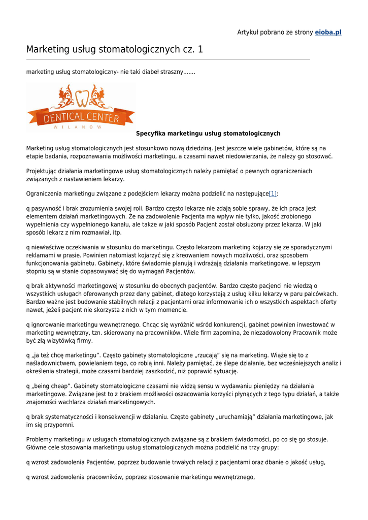 Artykuł pobrano ze strony eioba.pl Marketing usług stomatologicznych cz. 1 marketing usług stomatologiczny- nie taki diabeł straszny....... Specyfika marketingu usług stomatologicznych Marketing usług stomatologicznych jest stosunkowo nową dziedziną. Jest jeszcze wiele gabinetów, które są na etapie badania, rozpoznawania możliwości marketingu, a czasami nawet niedowierzania, że należy go stosować. Projektując działania marketingowe usług stomatologicznych należy pamiętać o pewnych ograniczeniach związanych z nastawieniem lekarzy. Ograniczenia marketingu związane z podejściem lekarzy można podzielić na następujące[1]: q pasywność i brak zrozumienia swojej roli. Bardzo często lekarze nie zdają sobie sprawy, że ich praca jest elementem działań marketingowych. Że na zadowolenie Pacjenta ma wpływ nie tylko, jakość zrobionego wypełnienia czy wypełnionego kanału, ale także w jaki sposób Pacjent został obsłużony przez lekarza. W jaki sposób lekarz z nim rozmawiał, itp. q niewłaściwe oczekiwania w stosunku do marketingu. Często lekarzom marketing kojarzy się ze sporadycznymi reklamami w prasie. Powinien natomiast kojarzyć się z kreowaniem nowych możliwości, oraz sposobem funkcjonowania gabinetu. Gabinety, które świadomie planują i wdrażają działania marketingowe, w lepszym stopniu są w stanie dopasowywać się do wymagań Pacjentów. q brak aktywności marketingowej w stosunku do obecnych pacjentów. Bardzo często pacjenci nie wiedzą o wszystkich usługach oferowanych przez dany gabinet, dlatego korzystają z usług kilku lekarzy w paru palcówkach. Bardzo ważne jest budowanie stabilnych relacji z pacjentami oraz informowanie ich o wszystkich aspektach oferty nawet, jeżeli pacjent nie skorzysta z nich w tym momencie. q ignorowanie marketingu wewnętrznego. Chcąc się wyróżnić wśród konkurencji, gabinet powinien inwestować w marketing wewnętrzny, tzn. skierowany na pracowników. Wiele firm zapomina, że niezadowolony Pracownik może być złą wizytówką firmy. q „ja też chcę marketingu”. Często gabinety stomatologiczne „rzucają” się na marketing. Wiąże się to z naśladownictwem, powielaniem tego, co robią inni. Należy pamiętać, że ślepe działanie, bez wcześniejszych analiz i określenia strategii, może czasami bardziej zaszkodzić, niż poprawić sytuację. q „being cheap”. Gabinety stomatologiczne czasami nie widzą sensu w wydawaniu pieniędzy na działania marketingowe. Związane jest to z brakiem możliwości oszacowania korzyści płynących z tego typu działań, a także znajomości wachlarza działań marketingowych. q brak systematyczności i konsekwencji w działaniu. Często gabinety „uruchamiają” działania marketingowe, jak im się przypomni. Problemy marketingu w usługach stomatologicznych związane są z brakiem świadomości, po co się go stosuje. Główne cele stosowania marketingu usług stomatologicznych można podzielić na trzy grupy: q wzrost zadowolenia Pacjentów, poprzez budowanie trwałych relacji z pacjentami oraz dbanie o jakość usług, q wzrost zadowolenia pracowników, poprzez stosowanie marketingu wewnętrznego, q poprawienie funkcjonowania firmy m.in. poprzez bazy danych na temat pacjentów i przeprowadzonych usług oraz wzrost skuteczności podejmowanych działań marketingowych. Więcej na temat „Marketingu usług stomatologicznych”, dowiesz się w artykule „Marketing usług stomatologicznych cz. 2” www.denticalcenter.pl [1] Na podstawie : Marczuk B., Marketing w firmie usług profesjonalnych, „Marketing w praktyce”, 2003, nr 3. Autor: Manager ds. Marketingu Dentical Center Wilanów, Agnieszka Przybylska Artykuł pobrano ze strony eioba.pl