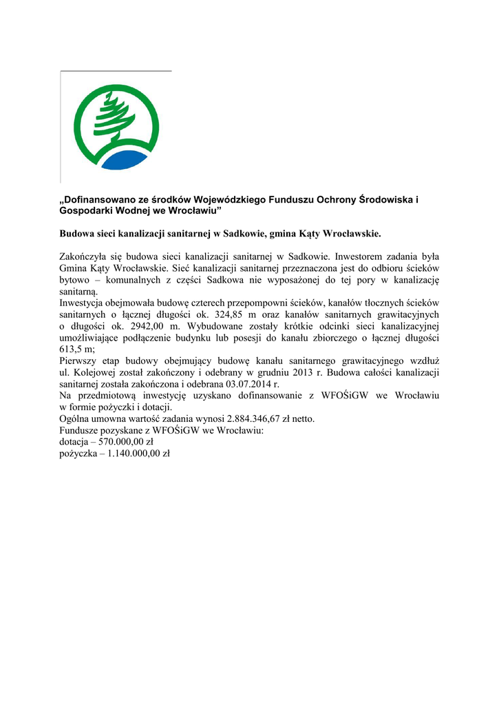 „Dofinansowano ze środków Wojewódzkiego Funduszu Ochrony Środowiska i Gospodarki Wodnej we Wrocławiu” Budowa sieci kanalizacji sanitarnej w Sadkowie, gmina Kąty Wrocławskie. Zakończyła się budowa sieci kanalizacji sanitarnej w Sadkowie. Inwestorem zadania była Gmina Kąty Wrocławskie. Sieć kanalizacji sanitarnej przeznaczona jest do odbioru ścieków bytowo – komunalnych z części Sadkowa nie wyposażonej do tej pory w kanalizację sanitarną. Inwestycja obejmowała budowę czterech przepompowni ścieków, kanałów tłocznych ścieków sanitarnych o łącznej długości ok. 324,85 m oraz kanałów sanitarnych grawitacyjnych o długości ok. 2942,00 m. Wybudowane zostały krótkie odcinki sieci kanalizacyjnej umożliwiające podłączenie budynku lub posesji do kanału zbiorczego o łącznej długości 613,5 m; Pierwszy etap budowy obejmujący budowę kanału sanitarnego grawitacyjnego wzdłuż ul. Kolejowej został zakończony i odebrany w grudniu 2013 r. Budowa całości kanalizacji sanitarnej została zakończona i odebrana 03.07.2014 r. Na przedmiotową inwestycję uzyskano dofinansowanie z WFOŚiGW we Wrocławiu w formie pożyczki i dotacji. Ogólna umowna wartość zadania wynosi 2.884.346,67 zł netto. Fundusze pozyskane z WFOŚiGW we Wrocławiu: dotacja – 570.000,00 zł pożyczka – 1.140.000,00 zł