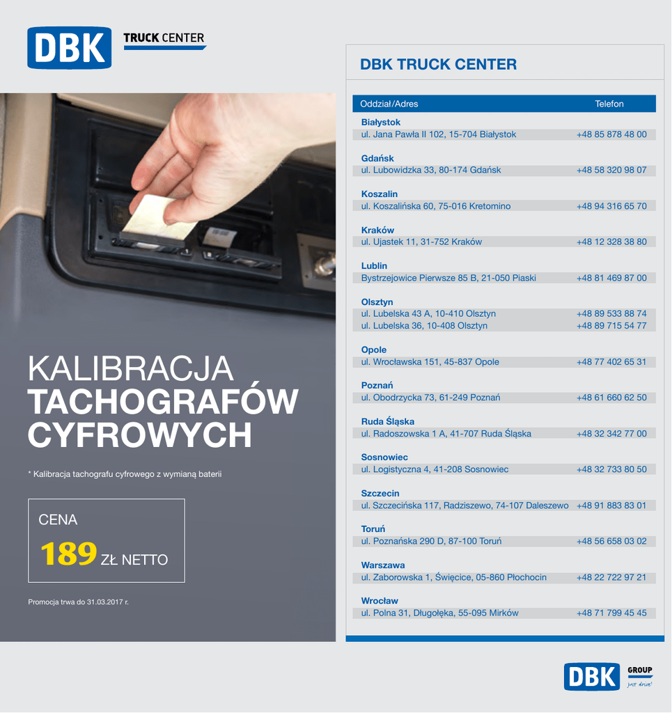 DBK TRUCK CENTER Oddział /Adres KALIBRACJA TACHOGRAFÓW CYFROWYCH * Kalibracja tachografu cyfrowego z wymianą baterii CENA 189 ZŁ NETTO Promocja trwa do 31.03.2017 r. Telefon Białystok ul. Jana Pawła II 102, 15-704 Białystok +48 85 878 48 00 Gdańsk ul. Lubowidzka 33, 80-174 Gdańsk +48 58 320 98 07 Koszalin ul. Koszalińska 60, 75-016 Kretomino +48 94 316 65 70 Kraków ul. Ujastek 11, 31-752 Kraków +48 12 328 38 80 Lublin Bystrzejowice Pierwsze 85 B, 21-050 Piaski +48 81 469 87 00 Olsztyn ul. Lubelska 43 A, 10-410 Olsztyn ul. Lubelska 36, 10-408 Olsztyn +48 89 533 88 74 +48 89 715 54 77 Opole ul. Wrocławska 151, 45-837 Opole +48 77 402 65 31 Poznań ul. Obodrzycka 73, 61-249 Poznań +48 61 660 62 50 Ruda Śląska ul. Radoszowska 1 A, 41-707 Ruda Śląska +48 32 342 77 00 Sosnowiec ul. Logistyczna 4, 41-208 Sosnowiec +48 32 733 80 50 Szczecin ul. Szczecińska 117, Radziszewo, 74-107 Daleszewo +48 91 883 83 01 Toruń ul. Poznańska 290 D, 87-100 Toruń Warszawa ul. Zaborowska 1, Święcice, 05-860 Płochocin Wrocław ul. Polna 31, Długołęka, 55-095 Mirków +48 56 658 03 02 +48 22 722 97 21 +48 71 799 45 45