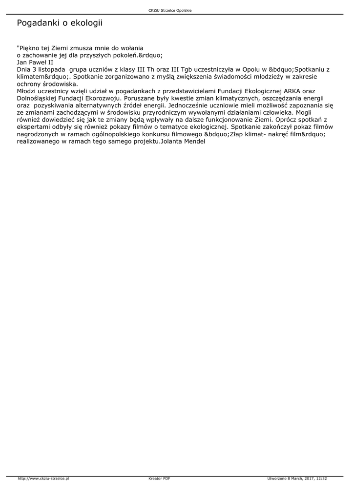 CKZiU Strzelce Opolskie Pogadanki o ekologii "Piękno tej Ziemi zmusza mnie do wołania o zachowanie jej dla przyszłych pokoleń.” Jan Paweł II Dnia 3 listopada grupa uczniów z klasy III Th oraz III Tgb uczestniczyła w Opolu w „Spotkaniu z klimatem”. Spotkanie zorganizowano z myślą zwiększenia świadomości młodzieży w zakresie ochrony środowiska. Młodzi uczestnicy wzięli udział w pogadankach z przedstawicielami Fundacji Ekologicznej ARKA oraz Dolnośląskiej Fundacji Ekorozwoju. Poruszane były kwestie zmian klimatycznych, oszczędzania energii oraz pozyskiwania alternatywnych źródeł energii. Jednocześnie uczniowie mieli możliwość zapoznania się ze zmianami zachodzącymi w środowisku przyrodniczym wywołanymi działaniami człowieka. Mogli również dowiedzieć się jak te zmiany będą wpływały na dalsze funkcjonowanie Ziemi. Oprócz spotkań z ekspertami odbyły się również pokazy filmów o tematyce ekologicznej. Spotkanie zakończył pokaz filmów nagrodzonych w ramach ogólnopolskiego konkursu filmowego „Złap klimat- nakręć film” realizowanego w ramach tego samego projektu.Jolanta Mendel http://www.ckziu-strzelce.pl Kreator PDF Utworzono 8 March, 2017, 12:32