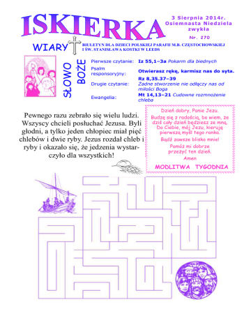 3 Sierpnia 2014r. Osiemnasta Niedziela zwykła Nr. 270 BIULETYN DLA DZIECI POLSKIEJ PARAFII M.B. CZĘSTOCHOWSKIEJ I ŚW. STANISŁAWA KOSTKI W LEEDS SŁOWO BOŻE WIARY Pierwsze czytanie: Iz 55,1–3a Pokarm dla biednych Psalm responsoryjny: Drugie czytanie: Ewangelia: Otwierasz rękę, karmisz nas do syta. Rz 8,35.37–39 Żadne stworzenie nie odłączy nas od miłości Boga Mt 14,13–21 Cudowne rozmnożenie chleba Pewnego razu zebrało się wielu ludzi. Wszyscy chcieli posłuchać Jezusa. Byli głodni, a tylko jeden chłopiec miał pięć chlebów i dwie ryby. Jezus rozdał chleb i ryby i okazało się, że jedzenia wystarczyło dla wszystkich! Dzień dobry, Panie Jezu. Budzę się z radością, bo wiem, że dziś cały dzień będziesz ze mną. Do Ciebie, mój Jezu, kieruję pierwszą myśl tego ranka. Bądź zawsze blisko mnie! Pomóż mi dobrze przeżyć ten dzień. Amen MODLITWA TYGODNIA Zuch kocha Boga Pierwszy punkt Prawa Zucha ma szeroki, uniwersalny i ogólnoludzki wymiar. Przede wszystkim zuch ma umieć kochać. Akceptować siebie, świat, swoje otoczenie. Zuch kocha Boga oznacza, że umie szanować wszystkie wartości dane człowiekowi jako wyposażenie na drogę życia: zasady moralne, poczucie dobra, piękna, a przede wszystkim dar miłości. Prawda, dobro, sprawiedliwość, wolność, miłość, przyjaźń i braterstwo, wiara i nadzieja to jakby szczeble wartości duchowych człowieka, po których powinien się on wspinać, aby drabinę swego życia przejść godnie, użytecznie i z sensem. Jest to akceptacja podstawowego prawa postępowania moralnego człowieka ukazanego w Dekalogu. Prawo Zuchów 1. 2. 3. 4. 5. Zuch kocha Boga i Polskę. Zuch jest dzielny. Wszystkim jest z zuchem dobrze. Zuch stara się być coraz lepszy. Zuch stara się mówić po polsku. B A C 1. Rzeka Jordan 2. Golgota 3. Kana Galilejska 4. Genezaret 5. Nazaret 6. Jerozolima 7. Betlejem 8. Góra Tabor A F C D E F G H 6 D E B G H Na Prawach Rękopisu For Private Circulation Only kontakt: [email protected]