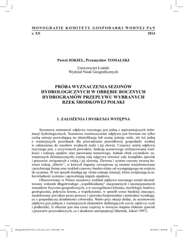 M O N O G R A F I E K O M I T E T U G O S P O D A R K I W O D N E J PA N z. XX 2014 Paweł JOKIEL, Przemysław TOMALSKI Uniwersytet Łódzki Wydział Nauk Geograficznych PRÓBA WYZNACZENIA SEZONÓW HYDROLOGICZNYCH W OBRĘBIE ROCZNYCH HYDROGRAMÓW PRZEPŁYWU WYBRANYCH RZEK ŚRODKOWEJ POLSKI 1. ZAŁOŻENIA I DYSKUSJA WSTĘPNA Sezonowa zmienność odpływu rzecznego jest jedną z najważniejszych informacji hydrologicznych. Sezonowe rozmieszczenie odpływu jest bowiem nie tylko cechą ustroju pozwalającą na identyfikację lub ocenę ustroju rzeki, ale też jedną z ważniejszych przesłanek dla prowadzenia prawidłowej gospodarki wodnej w odniesieniu do zasobów wodnych rzeki i jej zlewni. Czasowy ustrój odpływu rzecznego jest, z oczywistych powodów, funkcją sezonowego zróżnicowania wielkości i rodzaju opadów oraz parowania terenowego. Jednak obok czynników zewnętrznych (klimatycznych) ważną rolę odgrywa również cały kompleks zjawisk i procesów związanych z rzeką i jej zlewnią. Zlewnia i system rzeczny tworzą bowiem rodzaj „filtrów”, w których impulsy zewnętrzne są istotnie transformowane i przybierają formę oraz rozkład czasowy bardzo różny od występującego na wejściu do systemu. W ten sposób działają np. różne rodzaje retencji, które zwiększają m.in. bezwładność systemu i spowalniają impuls opadowy. Obserwowany w Polsce sezonowy rozkład odpływu rzecznego został ukształtowany wskutek długotrwałego „współdziałania” stacjonarnych i niestacjonarnych warunków fizyczno-geograficznych, a w szczególności klimatu, morfologii, budowy geologicznej, pokrycia terenu, a współcześnie, w sposób coraz bardziej znaczący, modelowany jest także przez procesy i zjawiska bezpośrednio i pośrednio wynikające z gospodarczej działalności człowieka. Warto przy okazji dodać, że sezonowość odpływu jest jednym z ważniejszych elementów definiujących ustrój odpływu rzeki i podkreślić, iż obecnie jest ona coraz częściej w równym stopniu efektem zjawisk i procesów przyrodniczych, co i skutkiem antropopresji (Bartnik, Jokiel 1997). Monografia KGW-PAN, z. XX, tom 2 (wer. 27.08).indb 203 2014-08-27 09:46:28 204 P. Jokiel, P. Tomalski Coroczna, mniej lub bardziej wyraźnie zarysowana, powtarzalność zjawisk hydrologicznych w Polsce jest oczywistą konsekwencją pór roku, a co za tym idzie skutkiem powtarzających się, sezonowych zmian opadu atmosferycznego i sposobów jego redystrybucji. Wiosną spodziewamy się roztopów i wysokich przepływów w rzekach. Latem pojawiają się w tych rzekach niżówki przerywane niekiedy wezbraniami opadowymi. Jesienią niżówki, wskutek niskich opadów lub ich braku, stają się zwykle jeszcze głębsze, a zimą powoli się wypełniają, by ponownie przejść w wezbrania wywołane kolejnymi wiosennymi roztopami lub opadami. Powtarzalność tego rytmu w kolejnych latach jest jednak względna. Zimy mogą być bowiem mroźne i długie albo łagodne i krótkie. Mogą być także śnieżne lub prawie bezśnieżne. Tylko tych 6 określeń daje możliwość utworzenia dwunastu „różnych zim” o cechach warunkujących bardzo zróżnicowany przebieg zjawisk hydrologicznych i to nie tylko w okresie zimy, ale również wiosną, a nawet latem. Także w innych porach roku zaznacza się bardzo duża zmienność wieloletnia cech i charakterystyk klimatycznych. W efekcie, pory genetycznie różnych wezbrań i niżówek „wędrują” co roku dość swobodnie po osi czasu, przy czym wraz z położeniem na tej osi zmieniają się również ich parametry, a niekiedy i geneza. Jeśli nałożymy na to, dostrzegane już niekiedy hydrologiczne skutki trwałych bądź nietrwałych zmian klimatycznych i efekty antropopresji, zauważymy, że pojęcie „sezonowość odpływu” w coraz większym stopniu jest umowne i wymaga uściślenia, a nawet okresowego redefiniowania. Postęp w zakresie metodycznym i w odniesieniu do jakości oraz dostępności danych hydrometrycznych stwarza sytuację, w której zestaw miar i procedur, służących do opisania sezonowości odpływu rzecznego, jest wciąż wzbogacany o nowe propozycje. Dość wymienić tu próby wykorzystania miar C.G. Markhama (1970) – pory koncentracji odpływu i indeksu sezonowości (np. Jokiel, Bartnik 2001, Tomaszewski 2001), a także propozycje zdefiniowania i zastosowania miar stabilności ustroju hydrologicznego i entropii odpływu (Wrzesiński 2013) oraz terminu połowy odpływu (Jokiel 2009). Przegląd metod pozwalających na wielokryterialną analizę i ocenę sezonowej struktury i zmienności odpływu rzecznego znajdzie czytelnik w pracy Bartnika i Jokiela (2005). W 1977 r. ukazała się praca J. Rotnickiej, w której podjęto bardzo interesującą próbę identyfikacji tzw. okresów hydrologicznych, czyli ciągów dni w roku, charakteryzujących się względnym podobieństwem wielkości, dyspersji i charakteru stanu wody w rzece (Rotnicka 1977). W późniejszych latach badania te zostały rozszerzone obszarowo i merytorycznie, a sama metoda dopracowana od strony teoretycznej (Rotnicka 1988). Metoda ta jest jednak dość skomplikowana, a przyjęcie pentady za elementarny wycinek czasu, jaki poddawany jest analizie, może być dyskusyjne. Mimo to próba identyfikacji okresów (sezonów) hydrologicznych w obrębie rocznego hydrogramu przepływu rzeki (wcześniej stanu wody), w aspekcie definiowania i monitorowania jej ustroju, wydaje się interesująca i szkoda, że w późniejszych latach problematyka ta została nieco zaniedbana, mimo że od czasu do czasu pojawiały się w tym zakresie ciekawe próby np. A. Bartczaka (2007). Traktując odpływ rzeczny jako stacjonarny proces stochastyczny, jego charakterystyki można obliczać na dwa sposoby – gdy dysponujemy wieloma realizacjami oraz gdy zakładamy istnienie tylko jednej realizacji. W przedstawionej niżej pro- Monografia KGW-PAN, z. XX, tom 2 (wer. 27.08).indb 204 2014-08-27 09:46:28 Próba