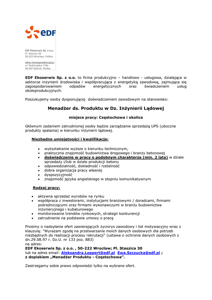 EDF Ekoserwis Sp. z o.o. to firma produkcyjno – handlowo - usługowa, działająca w sektorze inżynierii środowiska i współpracująca z energetyką zawodową, zajmująca się zagospodarowaniem odpadów energetycznych oraz świadczeniem usług okołoprodukcyjnych. Poszukujemy osoby dysponującej doświadczeniem zawodowym na stanowisko: Menadżer ds. Produktu w Dz. Inżynierii Lądowej miejsce pracy: Częstochowa i okolica Głównym zadaniem zatrudnionej osoby będzie zarządzanie sprzedażą UPS (uboczne produkty spalania) w kierunku inżynierii lądowej. Niezbędne umiejętności i kwalifikacje: wykształcenie wyższe o kierunku technicznym, praktyczna znajomość budownictwa drogowego i branży betonowej doświadczenie w pracy o podobnym charakterze (min. 2 lata) w dziale sprzedaży i/lub w dziale produkcji betonu odpowiedzialność, dokładność i rzetelność dobra organizacja pracy własnej dyspozycyjność znajomość języka angielskiego w stopniu komunikatywnym Rodzaj pracy: aktywna sprzedaż wyrobów na rynku współpraca z inwestorami, instytucjami branżowymi / doradcami, firmami pośredniczącymi oraz firmami wykonawczymi w branży budownictwa inżynieryjnego i kubaturowego monitorowanie trendów rynkowych, strategii konkurencji zatrudnienie na podstawie umowy o pracę Prosimy o nadsyłanie ofert zawierających życiorys zawodowy i list motywacyjny wraz z klauzulą: "Wyrażam zgodę na przetwarzanie moich danych osobowych dla potrzeb niezbędnych do realizacji procesu rekrutacji" (ustawa o ochronie danych osobowych z dn.29.08.97 r. Dz.U. nr 133 poz. 883) na adres: EDF Ekoserwis Sp. z o.o. , 50-222 Wrocław; Pl. Staszica 30 lub na adres email: [email protected] [email protected] ; z dopiskiem „Menadżer Produktu - Częstochowa”. Zastrzegamy sobie prawo odpowiedzi tylko na wybrane ofert.