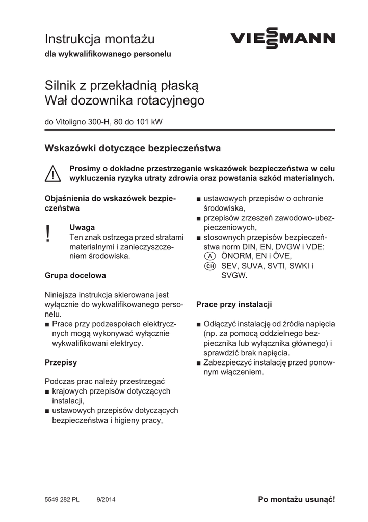 VIESMANN Instrukcja montażu dla wykwalifikowanego personelu Silnik z przekładnią płaską Wał dozownika rotacyjnego do Vitoligno 300-H, 80 do 101 kW Wskazówki dotyczące bezpieczeństwa Prosimy o dokładne przestrzeganie wskazówek bezpieczeństwa w celu wykluczenia ryzyka utraty zdrowia oraz powstania szkód materialnych. Objaśnienia do wskazówek bezpieczeństwa ! Uwaga Ten znak ostrzega przed stratami materialnymi i zanieczyszczeniem środowiska. Grupa docelowa Niniejsza instrukcja skierowana jest wyłącznie do wykwalifikowanego personelu. ■ Prace przy podzespołach elektrycznych mogą wykonywać wyłącznie wykwalifikowani elektrycy. Przepisy ■ ustawowych przepisów o ochronie środowiska, ■ przepisów zrzeszeń zawodowo-ubezpieczeniowych, ■ stosownych przepisów bezpieczeństwa norm DIN, EN, DVGW i VDE: a ÖNORM, EN i ÖVE, c SEV, SUVA, SVTI, SWKI i SVGW. Prace przy instalacji ■ Odłączyć instalację od źródła napięcia (np. za pomocą oddzielnego bezpiecznika lub wyłącznika głównego) i sprawdzić brak napięcia. ■ Zabezpieczyć instalację przed ponownym włączeniem. Podczas prac należy przestrzegać ■ krajowych przepisów dotyczących instalacji, ■ ustawowych przepisów dotyczących bezpieczeństwa i higieny pracy, 5549 282 PL 9/2014 Po montażu usunąć! ! Uwaga Naprawa podzespołów spełniających funkcje zabezpieczające zagraża bezpiecznej eksploatacji instalacji. Uszkodzone podzespoły wymieniać wyłącznie na oryginalne części zamienne firmy Viessmann. Wskazówka dotycząca użytkowania Dla kotła grzewczego o następujących numerach fabrycznych: 7552005 7552006 7552007 7552008 7552009 7552010 Dane techniczne 5549 282 PL Masa dozownika rotacyjnego łącznie: ■ 26,7 kg 2 Demontaż silnika z przekładnią płaską C B A 4x 4x A Silnik z przekładnią płaską (masa: 10,3 kg) 1. Wyjąć wtyczkę przewodu elektrycznego, prowadzącego od silnika. 2. Zdemontować silnik z przekładnią płaską A. B Ogranicznik momentu obrotowego C Odkręcić śrubę Odkręcić śrubę C i obrócić ogranicznik momentu obrotowego B na bok. 5. Wymienić uszkodzone podzespoły. 5549 282 PL 3. Wykręcić wałek silnika (gwint lewy). 4. Zdemontować ogranicznik momentu obrotowego B. W tym celu wykręcić śruby C. lub 3 Demontaż wału dozownika rotacyjnego H G D F 4x E D Pokrywa E Wpust pasowany F Wałek silnika G Łożysko H Wał dozownika rotacyjnego Wymienić uszkodzone podzespoły. Montaż dozownika rotacyjnego Wałek silnika: Wkręcić do oporu wałek silnika (gwint lewy) do wału dozownika rotacyjnego. 5549 282 PL Ponownie zmontować podzespoły, wykonując czynności w odwrotnej kolejności. Uwzględnić poniższą wskazówkę. 4 5 5549 282 PL 6 5549 282 PL 7 5549 282 PL 8 Zmiany techniczne zastrzeżone! 5549 282 PL Viessmann Sp. z o.o. ul. Gen. Ziętka 126 41 - 400 Mysłowice tel.: (801) 0801 24 (32) 22 20 330 mail: [email protected] www.viessmann.pl