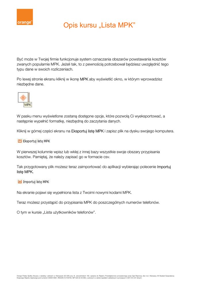 Opis kursu „Lista MPK” Być może w Twojej firmie funkcjonuje system oznaczania obszarów powstawania kosztów zwanych popularnie MPK. Jeżeli tak, to z pewnością potrzebował będziesz uwzględnić tego typu dane w swoich rozliczeniach. Po lewej stronie ekranu kliknij w ikonę MPK aby wyświetlić okno, w którym wprowadzisz niezbędne dane. W pasku menu wyświetlone zostaną dostępne opcje, które pozwolą Ci wyeksportować, a następnie wypełnić formatkę, niezbędną do zaczytania danych. Kliknij w górnej części ekranu na Eksportuj listę MPK i zapisz plik na dysku swojego komputera. W pierwszej kolumnie wpisz lub wklej z innej bazy wszystkie swoje obszary przypisania kosztów. Pamiętaj, że należy zapisać go w formacie csv. Tak przygotowany plik możesz teraz zaimportować do aplikacji wybierając polecenie Importuj listę MPK. Na ekranie pojawi się wypełniona lista z Twoimi nowymi kodami MPK. Teraz możesz przystąpić do przypisania MPK do poszczególnych numerów telefonów. O tym w kursie „Lista użytkowników telefonów”. Orange Polska Spółka Akcyjna z siedzibą i adresem w Warszawie (02-326) przy Al. Jerozolimskich 160, wpisana do Rejestru Przedsiębiorców prowadzonego przez Sąd Rejonowy dla m.st. Warszawy XII Wydział Gospodarczy Krajowego Rejestru Sądowego pod numerem 0000010681; REGON 012100784, NIP 526-02-50-995; z pokrytym w całości kapitałem zakładowym wynoszącym 3.937.072.437 złotych.