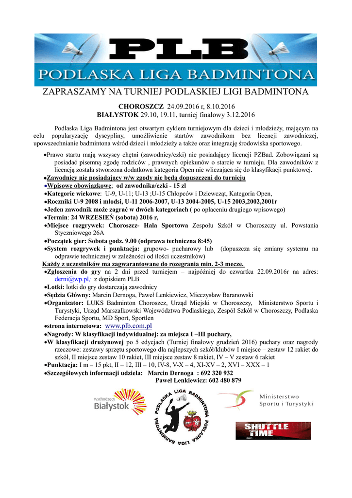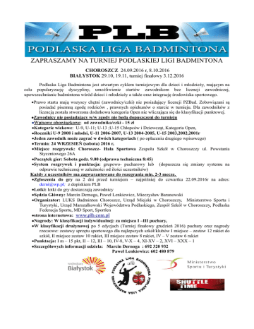 ZAPRASZAMY NA TURNIEJ PODLASKIEJ LIGI BADMINTONA CHOROSZCZ 24.09.2016 r, 8.10.2016 BIAŁYSTOK 29.10, 19.11, turniej finałowy 3.12.2016 Podlaska Liga Badmintona jest otwartym cyklem turniejowym dla dzieci i młodzieży, mającym na celu popularyzację dyscypliny, umożliwienie startów zawodnikom bez licencji zawodniczej, upowszechnianie badmintona wśród dzieci i młodzieży a także oraz integrację środowiska sportowego. Prawo startu mają wszyscy chętni (zawodnicy/czki) nie posiadający licencji PZBad. Zobowiązani są posiadać pisemną zgodę rodziców , prawnych opiekunów o starcie w turnieju. Dla zawodników z licencją została stworzona dodatkowa kategoria Open nie wliczająca się do klasyfikacji punktowej. Zawodnicy nie posiadający w/w zgody nie będą dopuszczeni do turnieju Wpisowe obowiązkowe; od zawodnika/czki - 15 zł Kategorie wiekowe: U-9, U-11; U-13 ;U-15 Chłopców i Dziewcząt, Kategoria Open, Roczniki U-9 2008 i młodsi, U-11 2006-2007, U-13 2004-2005, U-15 2003,2002,2001r Jeden zawodnik może zagrać w dwóch kategoriach ( po opłaceniu drugiego wpisowego) Termin: 24 WRZESIEŃ (sobota) 2016 r, Miejsce rozgrywek: Choroszcz- Hala Sportowa Zespołu Szkół w Choroszczy ul. Powstania Styczniowego 26A Początek gier: Sobota godz. 9.00 (odprawa techniczna 8:45) System rozgrywek i punktacja: grupowo- pucharowy lub (dopuszcza się zmiany systemu na odprawie technicznej w zależności od ilości uczestników) Każdy z uczestników ma zagwarantowane do rozegrania min. 2-3 mecze. Zgłoszenia do gry na 2 dni przed turniejem – najpóźniej do czwartku 22.09.2016r na adres: [email protected]; z dopiskiem PLB Lotki: lotki do gry dostarczają zawodnicy Sędzia Główny: Marcin Dernoga, Paweł Lenkiewicz, Mieczysław Baranowski Organizator: LUKS Badminton Choroszcz, Urząd Miejski w Choroszczy, Ministerstwo Sportu i Turystyki, Urząd Marszałkowski Województwa Podlaskiego, Zespół Szkół w Choroszczy, Podlaska Federacja Sportu, MD Sport, Sportlen strona internetowa: www.plb.com.pl Nagrody: W klasyfikacji indywidualnej: za miejsca I –III puchary, W klasyfikacji drużynowej po 5 edycjach (Turniej finałowy grudzień 2016) puchary oraz nagrody rzeczowe: zestawy sprzętu sportowego dla najlepszych szkół/klubów I miejsce – zestaw 12 rakiet do szkół, II miejsce zestaw 10 rakiet, III miejsce zestaw 8 rakiet, IV – V zestaw 6 rakiet Punktacja: I m – 15 pkt, II – 12, III – 10, IV-8, V-X – 4, XI-XV – 2, XVI – XXX – 1 Szczegółowych informacji udziela: Marcin Dernoga : 692 320 932 Paweł Lenkiewicz: 602 480 879