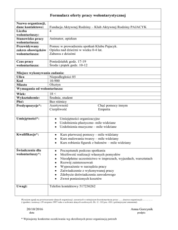 Formularz oferty pracy wolontarystycznej Nazwa organizacji, dane kontaktowe: Liczba wolontariuszy: Stanowisko pracy wolontariusza: Przewidywany zakres obowiązków wolontariusza: Czas pracy wolontariusza: Fundacja Aktywnej Rodziny – Klub Aktywnej Rodziny PAJACYK 4 Animator, opiekun Pomoc w prowadzeniu spotkań Klubu Pajacyk. Opieka nad dziećmi w wieku 0-4 lat. Zabawa z dziećmi Poniedziałek godz. 17-19 Środa i piątek godz. 10-12 Miejsce wykonywania zadania: Niepodległości 85 Ulica 10-900 Kod Olsztyn Miasto Wymagania od wolontariusza: Wiek: Wykształcenie: Płeć: Predyspozycje*: 18 < Średnie, student Bez różnicy Asertywność Cierpliwość Chęć pomocy innym Empatia Umiejętności*: Umiejętności organizacyjne Uzdolnienia plastyczne- mile widziane Uzdolnienia muzyczne – mile widziane Kwalifikacje*: Kurs pierwszej pomocy – mile widziany Kurs malowania twarzy – mile widziany Kurs robienia figurek z balonów – mile widziany Świadczenia dla wolontariuszy*: Poczęstunek podczas spotkania Możliwość realizacji własnych pomysłów Nieodpłatne uczestnictwo w imprezach, wyjazdach, warsztatach Rozwój zainteresowań Wyposażenie w narzędzia pracy Zaświadczenie z wykonywanej pracy Zdobycie doświadczenia zawodowego Zwrot poniesionych kosztów Telefon kontaktowy 517236262 Uwagi: Wyrażam zgodę na przetwarzanie danych organizacji, zawartych w niniejszym kwestionariuszu przez ……(nazwa organizacji)…………… ( zgodnie z ustawą z 29 sierpnia 1997 roku o ochronie danych osobowych, Dz. U. 133 poz. 833 z późniejszymi zmianami). 20/10/2016 data * Wpisujemy konkretne oczekiwania wg określonych przez organizację potrzeb Anna Gorzynik podpis