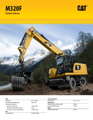 M320F Koparka kołowa Silnik Model silnika Emisja szkodliwych składników spalin Moc użyteczna (maksymalna) ISO 9249 przy 1550 obr./min ISO 9249/SAE J1349 (jednostki metryczne) ISO 13496 przy 1550 obr./min (maksymalna) Masy Masa eksploatacyjna Cat® C7.1 ACERT™ Stage IV (UE) 126 kW (169 hp) 171 KM 129,4 kW (174 hp) 18 750 kg-20 650 kg Dane techniczne łyżek Pojemności łyżek Zasięgi robocze Maksymalny zasięg na poziomie podłoża Maksymalna głębokość kopania Napęd Maksymalna prędkość jazdy 0,35 m3-1,18 m3 9580 mm 6330 mm 35 km/h Charakterystyka modelu M320F Niższe koszty Dzięki tej maszynie zyskasz wszechstronność, której potrzebujesz, a także wyjątkową precyzję i prędkość przy najniższym możliwym zużyciu paliwa – bez uszczerbku na wydajności. Łatwa i przyjemna praca Usiądź i daj się zaskoczyć ciszy oraz komfortowi w kabinie. Zrelaksuj się – my zadbamy o Twoje bezpieczeństwo. Korzystaj ze zintegrowanych technologii, które odciążają operatora. Dostępne z poziomu podłoża punkty obsługi serwisowej przyspieszają i ułatwiają konserwację okresową, a szeroka gama osprzętu roboczego Cat pozwala wykonywać różnorodne zadania. Nie ma lepszej maszyny na rynku. Spis treści Rozwiązania proekologiczne..........................................................4 Silnik..............................................................................................5 Zintegrowane rozwiązania zapewniające oszczędność paliwa.......5 Najwyższy komfort pracy...............................................................6 Prostota i funkcjonalność...............................................................7 Następna generacja.......................................................................8 Tempomat......................................................................................8 Inteligentne rozwiązania techniczne..............................................9 Mechanizm automatycznego blokowania osi "Dig and Go"...........9 Hydraulika....................................................................................10 Podwozie.....................................................................................11 Wysięgniki i ramiona...................................................................12 Funkcja SmartBoom™. .................................................................13 Układ kontroli komfortu jazdy......................................................13 Osprzęt roboczy............................................................................14 Obsługa serwisowa......................................................................16 Zintegrowane technologie...........................................................17 Bezpieczeństwo...........................................................................18 Niezrównana widoczność.............................................................20 Kompleksowa obsługa klienta.....................................................20 Dane techniczne...........................................................................21 Wyposażenie standardowe..........................................................32 Wyposażenie dodatkowe.............................................................33 Uwagi..........................................................................................34 Nowe modele serii F pozwalają na realizację szerokiego wachlarza zadań – jeszcze łatwiej i przyjemniej. Seria F – jeszcze łatwiejsza praca Rozwiązania proekologiczne Maszyna nowej generacji. Pod każdym względem Ekonomika paliwowa i ograniczona emisja spalin Paliwo biodiesel i biodegradowalny olej hydrauliczny Silnik spełnia normy emisji Stage IV (UE), osiągając tę samą moc, co w przypadku poprzedniego modelu pomimo zmniejszonego zużycia paliwa. To wydajniejsza jednostka napędowa, która zużywa mniej zasobów i emituje mniej CO2. • Do zasilania silnika modelu M320F można używać oleju napędowego o bardzo niskiej zawartości siarki (15 ppm lub niższej) albo paliwa biodiesel (B20) wymieszanego z olejem napędowym o bardzo niskiej zawartości siarki. • Olej Cat BIO HYDO Advanced HEES™ jest bardziej przyjazny dla środowiska. Cicha praca Maszyna charakteryzuje się wyjątkową kulturą pracy – trudno stwierdzić, czy jej silnik pracuje. Rozwiązania odciążające operatora i dłuższe okresy międzyobsługowe • Nowe tryby Eco, funkcja automatycznej regulacji prędkości obrotowej silnika oraz regulator czasu pracy na biegu jałowym przyczyniają się do zmniejszenia zużycia paliwa. • System Product Link™ umożliwia zdalne monitorowanie maszyny i jej efektywniejsze wykorzystanie. • Dealerzy Cat mogą pomóc Ci w wydłużeniu okresów międzyobsługowych – rzadsza wymiana płynów eksploatacyjnych i mniejsza ilość odpadów oznaczają dodatkową redukcję kosztów. 4 Maszyny używane z certyfikatem Cat Ten program jest kluczowym elementem w gamie rozwiązań oferowanych przez firmę Caterpillar oraz dealerów Cat, ponieważ umożliwia klientom rozwój działalności przy najniższych kosztach i wyeliminowanie odpadów. Używane maszyny są poddawane przeglądom i przygotowywane do dalszej niezawodnej pracy, a klienci otrzymują gwarancję firmy Caterpillar. Silnik Moc, niezawodność i ekonomiczne zużycie paliwa Moc i wydajność, jakiej potrzebujesz Strategia zapewniania stałej mocy silnika Gwarantuje szybką reakcję na zmianę obciążenia, zapewniając niezmienną moc niezależnie od warunków pracy. Wysoce skuteczne, autonomiczne rozwiązanie z zakresu kontroli emisji Silnik Cat C7.1 ACERT spełnia wymagania norm emisji spalin Stage IV (UE), a proces regeneracji układu oczyszczania gazów wydechowych nie zakłóca przebiegu pracy. Jest on: • Zautomatyzowany: nie jest wymagana ingerencja operatora. • Trwały: dzięki zastosowaniu filtra DPF zachowującego sprawność w całym okresie eksploatacji. • Wydajny: regeneracja nie 