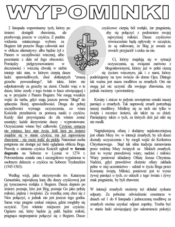 2 listopada wspominamy tych, którzy po śmierci dostąpili zbawienia, ale przebywają jeszcze w czyśćcu. Z punktu widzenia ostatecznego wyboru za Bogiem lub przeciw Bogu człowiek stoi w obliczu alternatywy: albo będzie żył z Panem w szczęśliwości wiecznej, albo pozostanie z dala od Jego obecności. Pomiędzy pielgrzymowaniem w doczesności i wieczną chwałą w niebie istnieje taki stan, w którym cierpią dusze ludzi sprawiedliwych, choć dotkniętych "zmazą grzechu powszedniego", lub takie, które nie odpokutowały za grzechy na ziemi. Chodzi więc o te dusze, które zeszły z tego świata w łasce uświęcającej i są w przyjaźni z Panem Bogiem. Nie mogą wszakże wejść do nieba, gdyż mają jeszcze pewne "długi" do spłacenia Bożej sprawiedliwości. Droga do pełnej szczęśliwości wymaga oczyszczenia, co wiara Kościoła przedstawia za pomocą nauki o czyśćcu. Każdy ślad przywiązania do zła winien zostać usunięty; każde skrzywienie duszy - wyprostowane. Oczyszczenie winno być całkowite. Czyściec oznacza nie miejsce, lecz stan życia. Jeśli ktoś po śmierci znajdzie się w stanie czyśćca, ma już zapewnione zbawienie - nie może trafić do piekła. Natomiast osoba potępiona nie dostąpi już łaski oglądania oblicza Boga. Prawdę o istnieniu czyśćca Kościół ogłosił w formie dogmatu na Soborze w Lyonie w 1274 r. Potwierdzona została ona i szczegółowo wyjaśniona w osobnym dekrecie o czyśćcu na Soborze Trydenckim (1545-1563). Według wizji, jakie otrzymywała św. Katarzyna Genueńska, największą karą dla duszy czyśćcowej jest jej tymczasowa rozłąka z Bogiem. Dusza dopiero po śmierci poznaje, kim jest Bóg, poznaje Go jako pełnię miłości, piękna i świętości. Za wszelką cenę chce się z Nim połączyć, a jednak nie jest jeszcze tego godna. Sama więc pragnie szukać miejsca, gdzie mogłaby się oczyścić. Tym właśnie miejscem jest czyściec. Ogniem zaś, który będzie ją palił, będzie miłość, pragnąca nieprzeparcie połączyć się z Bogiem. Dusze czyśćcowe cierpią ból rozłąki, żar pragnienia, aby się połączyć z podmiotem swojej najwyższej miłości. Dusze czyśćcowe równocześnie będą opływały w szczęście, że są miłowane, że Bóg je uważa za swoich przyjaciół i czeka na nie. Ci, którzy znajdują się w sytuacji oczyszczania, są związani zarówno z błogosławionymi, którzy już w pełni cieszą się życiem wiecznym, jak i z nami, którzy podróżujemy na tym świecie do domu Ojca. Dlatego tak ważna jest nasza modlitwa za zmarłych. Oni nie mogą już nic uczynić dla swojego zbawienia, my jednak możemy i powinniśmy. Kwiaty i znicze to jedynie zewnętrzne oznaki naszej pamięci o zmarłych. Tak naprawdę zmarli potrzebują naszej modlitwy. Módlmy się za nich nie tylko w święta i rocznice śmierci, ale także na co dzień. Pamiętajmy także o tych, za których dziś już nikt się nie modli. Najpiękniejszą ofiarą i dodajmy najskuteczniejszą jest ofiara Mszy św. w intencji zmarłych, by ich dusze doznały oczyszczenia i by mogli wejść do Królestwa Chrystusowego. Stąd tak silna tradycja zamawiania przez rodzinę Mszy świętych za bliskich zmarłych. Jest to wyraz prawdziwej wiary, nadziei i miłości. Wiary ponieważ składamy Ofiarę Jezusa Chrystusa. Nadziei, gdyż prawdziwe złożenie ofiary zakłada pełne w niej uczestnictwo – udział w życiu Boga przez Komunię świętą. Miłości, ponieważ jest to wyraz żywej pamięci o tych, co odeszli z tego świata i żywy znak pragnienia, by byli zbawieni. W intencji zmarłych możemy też składać zyskane odpusty. Za pobożne odwiedzenie cmentarza w dniach od 1 do 8 listopada i jednoczesną modlitwę za zmarłych można uzyskać odpust zupełny. Trzeba być w stanie łaski uświęcającej (po sakramencie pokuty). Wpisując Imiona i Nazwiska naszych bliskich zmarłych możemy zgłosić te osoby do Parafialnej Modlitwy Wypominkowej. W naszej parafii funkcjonują dwie formy takiej modlitwy : całoroczna i jednorazowa. Wypominki całoroczne modlitwa z wyczytaniem zgłoszonych osób w każdą niedzielę w dwóch częściach – część I o godz. 8:30 (przed Mszą świętą o godz.9:00) i część II o godz. 11:30 (przed Sumą o godz. 12:00). Wypominki jednorazowe to modlitwa za zmarłych odmawiana na cmentarzu podczas procesji żałobnej w dniu 1 listopada po sumie (którą również sprawujemy na cmentarzu, jeśli pozwala na to pogoda). Polecane osoby włączamy również do modlitwy 2 listopada podczas procesji żałobnej w kościele. WYPOMINKI CAŁOROCZNE / JEDNORAZOWE 1. 2. 3. 4. 5. 6. 7. 8. 9. 10. 11. 12. 13. 14. 15.
