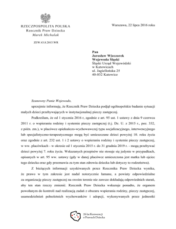 Warszawa, 22 lipca 2016 roku ZEW.43.8.2015.WR Pan Jarosław Wieczorek Wojewoda Śląski Śląski Urząd Wojewódzki w Katowicach ul. Jagiellońska 25 40-032 Katowice Szanowny Panie Wojewodo, uprzejmie informuję, że Rzecznik Praw Dziecka podjął ogólnopolskie badanie sytuacji małych dzieci przebywających w instytucjonalnej pieczy zastępczej. Podkreślam, że od 1 stycznia 2016 r, zgodnie z art. 95 ust. 1 ustawy z dnia 9 czerwca 2011 r. o wspieraniu rodziny i systemie pieczy zastępczej (t.j. Dz. U. z 2015 r., poz. 332, z późn. zm.), w placówce opiekuńczo-wychowawczej typu socjalizacyjnego, interwencyjnego lub specjalistyczno-terapeutycznego mogą być umieszczane dzieci powyżej 10. roku życia oraz zgodnie z art. 232 ust. 1 i 2 ustawy o wspieraniu rodziny i systemie pieczy zastępczej, w ww. placówkach - w okresie od 1 stycznia 2015 r. do 31 grudnia 2019 r. - mogą przebywać dzieci powyżej 7. roku życia. Wskazanych przepisów nie stosuje się jedynie w przypadkach, opisanych w art. 95 ww. ustawy (gdy w danej placówce umieszczona jest matka lub ojciec tego dziecka oraz gdy przemawia za tym stan zdrowia dziecka lub dotyczy to rodzeństwa). Z bieżących informacji uzyskiwanych przez Rzecznika Praw Dziecka wynika, że prawo w tym zakresie jest nadal notorycznie łamane, a powiaty odpowiedzialne za organizację pieczy zastępczej na swoim terenie nie zawsze dokładają odpowiednich starań, aby ten stan rzeczy zmienić. Rzecznik Praw Dziecka wskazuje ponadto, że organem powołanym do kontroli nad realizacją zadań z obszaru wspierania rodziny, pieczy zastępczej, usamodzielnień pełnoletnich wychowanków i adopcji, wykonywanych przez jednostki samorządu terytorialnego jest właściwy wojewoda, a w związku z tym to na tym organie spoczywa odpowiedzialność za każdy przypadek naruszenia dobra dziecka w tym zakresie. Minister Rodziny, Pracy i Polityki Społecznej w styczniu 2016 roku powiadomił Rzecznika Praw Dziecka o zobowiązaniu wojewodów do podjęcia działań mających na celu realizację prawa w kwestii zapewnienia odpowiedniej opieki małym dzieciom, które nie mogą wychowywać się w rodzinie biologicznej. Pani Minister Elżbieta Rafalska wskazała również województwa, w których najczęściej dochodzi do łamania prawa poprzez umieszczanie zbyt małych dzieci w instytucjonalnej pieczy zastępczej. Województwo śląskie na tej liście zajmowało czwarte miejsce. Mając powyższe na uwadze oraz wobec stale napływających do Rzecznika Praw Dziecka informacji o notorycznym łamaniu prawa w ww. zakresie, na podstawie art. 10 ust. 1 pkt 2 oraz art. 10a ust. 1-3 ustawy z dnia 6 stycznia 2000 r. o Rzeczniku Praw Dziecka (t.j. Dz. U. z 2015 r., poz. 2086), zwracam się do Pana Wojewody o pilne przekazanie Rzecznikowi Praw przebywających w Dziecka szczegółowych instytucjonalnej pieczy danych dotyczących zastępczej, sytuacji zorganizowanej na dzieci terenie województwa śląskiego, a także liczby placówek i liczby rodzin zastępczych. Proszę o przygotowanie tych danych w oparciu o zamieszczoną w załączniku tabelę w pliku Excel (stan na dzień 30 czerwca i 30 lipca 2016 roku). Ponadto proszę o wskazanie, jakie Pan Wojewoda podjął działania w ostatnim półroczu, aby organizacja pieczy zastępczej na podległym Panu terenie przebiegała zgodnie z prawem, a także jakie były efekty tych działań. Ponadto proszę o przekazanie Rzecznikowi diagnozy przyczyn tak notorycznego łamania praw dziecka w ww. zakresie. Do przesyłanych do Rzecznika Praw Dziecka informacji i wyjaśnień proszę dołączyć kopię dokumentacji istotnej w wyjaśnianiu wskazanego problemu. Z poważaniem Rzecznik Praw Dziecka Marek Michalak 2