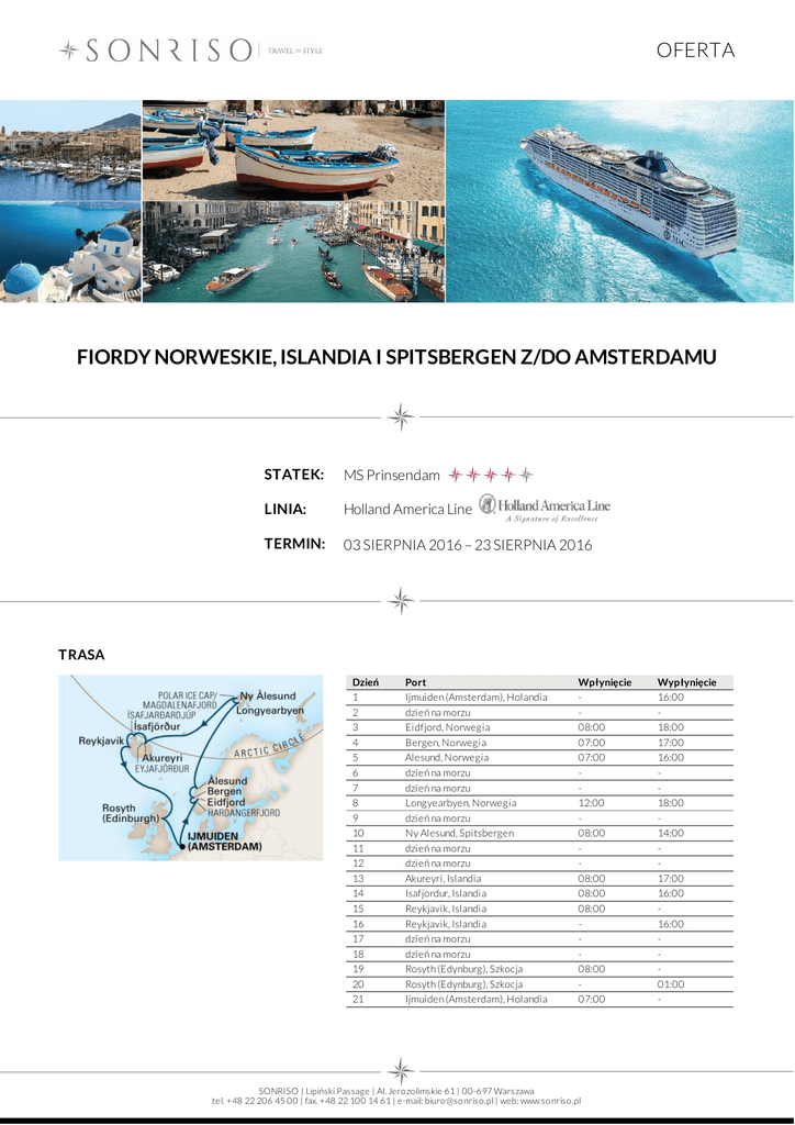 OFERTA FIORDY NORWESKIE, ISLANDIA I SPITSBERGEN Z/DO AMSTERDAMU STATEK: MS Prinsendam LINIA: Holland America Line TERMIN: 03 SIERPNIA 2016 – 23 SIERPNIA 2016 TRASA Dzień 1 2 3 4 5 6 7 8 9 10 11 12 13 14 15 16 17 18 19 20 21 Port Ijmuiden (Amsterdam), Holandia dzień na morzu Eidfjord, Norwegia Bergen, Norwegia Alesund, Norwegia dzień na morzu dzień na morzu Longyearbyen, Norwegia dzień na morzu Ny Alesund, Spitsbergen dzień na morzu dzień na morzu Akureyri, Islandia Isafjordur, Islandia Reykjavik, Islandia Reykjavik, Islandia dzień na morzu dzień na morzu Rosyth (Edynburg), Szkocja Rosyth (Edynburg), Szkocja Ijmuiden (Amsterdam), Holandia Wpłynięcie 08:00 07:00 07:00 12:00 08:00 08:00 08:00 08:00 08:00 07:00 SONRISO | Lipiński Passage | Al. Jero zo limskie 61 | 00-697 Warszawa tel. +48 22 206 45 00 | fax. +48 22 100 14 61 | e-mail: biuro @so nriso .pl | web: www.so nriso .pl Wypłynięcie 16:00 18:00 17:00 16:00 18:00 14:00 17:00 16:00 16:00 01:00 - OFERTA CENA Typ kabiny Cena z osobę Kabina wewnętrzna od 3 198 EUR Kabina z oknem od 3 198 EUR Kabina z balkonem od 7 198 EUR Superior Verandah Suite od 8 798 EUR CENA ZAWIERA DOTATKOWE OPŁATY zakwaterowanie w 2 - os. kabinie wybranej kategorii pełne wyżywienie: 3 posiłki, przekąski między posiłakmi, bufet o północy napoje do posiłków: woda stołowa, kawa, herbata oraz sok do śniadania serwis bagażowy podczas wejścia i zejścia ze statku 24 godzinny serwis kabinowy korzystanie z urządzeń sportowo - rekreacyjnych dostępnych na pokładzie (baseny, jacuzzi, boiska sportowe, kluby dla dzieci i młodzieży itp.) udział we wszystkich imprezach organizowanych na pokładzie (przedstawienia, pokazy, aukcje, animacje i inne) obowiązkowe opłaty portowe dojazd/przelot do portu rozpoczęcia i zakończenia rejsu transfery (lotnisko - port - lotnisko) ewentulne noclegi przed lub po rejsie wycieczki fakultatywne napoje: bezalkoholowe, alkoholowe, woda mineralna dostępne w restauracjach i barach (istnieje możliwość wykupienia pakietów napojów, o szczegóły zapytaj w biurze) korzystanie z mini baru w kabinie korzystanie z usług typu: SPA, salon piękności, pralnia itp. wydatki osobiste tj. zakupy w butikach, internet, kasyno itp. obowiązkowa opłata serwisowa (napiwki dla obsługi statku ok. 12,50 USD/os. dorosła/dzień, dzieci poniżej 3 lat nie płacą) obowiązkowe ubezpieczenie turystyczne koszt wymaganych wiz Na życzenie świadczymy dodatkowo usługi: rezerwacje hotelowe na całym świecie rezerwacje biletów lotniczych, trasferów oraz parkingu w porcie rezerwacje wycieczek fakultatywnych i innych atrakcji SONRISO | Lipiński Passage | Al. Jero zo limskie 61 | 00-697 Warszawa tel. +48 22 206 45 00 | fax. +48 22 100 14 61 | e-mail: biuro @so nriso .pl | web: www.so nriso .pl