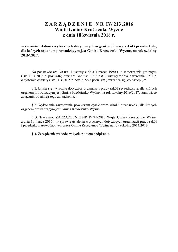 Z A R Z Ą D Z E N I E N R IV/ 213 /2016 Wójta Gminy Krościenko Wyżne z dnia 18 kwietnia 2016 r. w sprawie ustalenia wytycznych dotyczących organizacji pracy szkół i przedszkola, dla których organem prowadzącym jest Gmina Krościenko Wyżne, na rok szkolny 2016/2017. Na podstawie art. 30 ust. 1 ustawy z dnia 8 marca 1990 r. o samorządzie gminnym (Dz. U. z 2016 r. poz. 446) oraz art. 34a ust. 1 i 2 pkt 3 ustawy z dnia 7 września 1991 r. o systemie oświaty (Dz. U. z 2015 r. poz. 2156 z późn. zm.) zarządza się, co następuje: § 1. Ustala się wytyczne dotyczące organizacji pracy szkół i przedszkola, dla których organem prowadzącym jest Gmina Krościenko Wyżne, na rok szkolny 2016/2017, stanowiące załącznik do niniejszego zarządzenia. § 2. Wykonanie zarządzenia powierzam dyrektorom szkół i przedszkola, dla których organem prowadzącym jest Gmina Krościenko Wyżne. § 3. Traci moc ZARZĄDZENIE NR IV/40/2015 Wójta Gminy Krościenko Wyżne z dnia 10 marca 2015 r. w sprawie ustalenia wytycznych dotyczących organizacji pracy szkół i przedszkoli prowadzonych przez Gminę Krościenko Wyżne na rok szkolny 2015/2016. § 4. Zarządzenie wchodzi w życie z dniem podpisania. 2 Załącznik do zarządzenia Nr IV/ 213 /2016 Wójta Gminy Krościenko Wyżne z dnia 18 kwietnia 2016 r. WYTYCZNE DOTYCZĄCE ORGANIZACJI PRACY SZKÓŁ I PRZEDSZKOLA, DLA KTÓRYCH ORGANEM PROWADZĄCYM JEST GMINA KROŚCIENKO WYŻNE NA ROK SZKOLNY 2016/2017 Rozdział 1 Podstawa prawna 1. Ustawa z dnia 26 stycznia 1982 r. – Karta Nauczyciela (Dz. U. z 2014 r. poz. 191 z późn. zm.). 2. Ustawa z dnia 7 września 1991 r. o systemie oświaty (Dz. U. z 2015 r. poz. 2156 z późn. zm.). 3. Ustawa z dnia 21 listopada 2008 r. o pracownikach samorządowych (Dz. U. z 2014 r. poz. 1202 z późn. zm.). 4. Rozporządzenie MEN z dnia 7 lutego 2012 r. w sprawie ramowych planów nauczania w szkołach publicznych (Dz. U. poz. 204 z późn. zm.). 5. Rozporządzenie MEN z dnia 21 maja 2001 r. w sprawie ramowych statutów publicznego przedszkola oraz publicznych szkół (Dz. U. Nr 61, poz. 624 z późn. zm.). 6. Rozporządzenie MEN z dnia 27 sierpnia 2012 r. w sprawie podstawy programowej wychowania przedszkolnego oraz kształcenia ogólnego w poszczególnych typach szkół (Dz. U. poz. 977 z późn. zm.). 7. Rozporządzenie MEN z dnia 12 sierpnia 1999 r. w sprawie sposobu nauczania szkolnego oraz zakresu treści dotyczących wiedzy o życiu seksualnym człowieka, o zasadach świadomego i odpowiedzialnego rodzicielstwa, o wartości rodziny, życia w fazie prenatalnej oraz metodach i środkach świadomej prokreacji zawartych w podstawie programowej kształcenia ogólnego (Dz. U. z 2014 r. poz. 395). 8. Rozporządzenie MEN z dnia 30 kwietnia 2013 r. w sprawie zasad udzielania i organizacji pomocy psychologiczno-pedagogicznej w publicznych przedszkolach, szkołach i placówkach (Dz. U. poz. 532). 9. Rozporządzenie MENiS z dnia 19 grudnia 2001 r. w sprawie warunków i trybu udzielania zezwoleń na indywidualny program lub tok nauki oraz organizacji indywidualnego programu lub toku nauki (Dz. U. z 2002 r. Nr 3, poz. 28). 10. Rozporządzenie MEN z dnia 28 sierpnia 2014 r. w sprawie indywidualnego obowiązkowego rocznego przygotowania przedszkolnego dzieci i indywidualnego nauczania dzieci i młodzieży (Dz. U. z 2014 r. poz. 1157). 11. Rozporządzenie MEN z dnia 11 października 2013 r. w sprawie organizowania wczesnego wspomagania rozwoju dzieci (Dz. U. poz. 1257). 12. Rozporządzenie MEN z dnia 24 lipca 2015 r. w sprawie warunków organizowania kształcenia, wychowania i opieki dla dzieci i młodzieży niepełnosprawnych, niedostosowanych społecznie i zagrożonych niedostosowaniem społecznym (Dz. U. poz. 1113). 3 13. Rozporządzenie MENiS z dnia 9 kwietnia 2002 r. w sprawie warunków prowadzenia działalności innowacyjnej i eksperymentalnej przez publiczne szkoły i placówki (Dz. U. Nr 56, poz. 506 z późn. zm.). 14. Rozporządzenie MEN z dnia 14 kwietnia 1992 r. w sprawie warunków i sposobu organizowania nauki religii w publicznych przedszkolach i szkołach (Dz. U. Nr 36, poz. 155 z późn. zm.). 15. Rozporządzenie MEN z dnia 31 sierpnia 2010 r. w sprawie rodzajów innych form wychowania przedszkolnego, warunków tworzenia i organizowania tych form oraz sposobu ich działania (Dz. U. Nr 161, poz. 1080 z późn. zm.). 16. Rozporządzenie MEN z dnia 12 marca 2009 r. w sprawie szczegółowych kwalifikacji wymaganych od nauczycieli oraz określenia szkół i wypadków, w których można zatrudnić nauczycieli nie mających wyższego wykształcenia lub ukończonego zakładu kształcenia nauczycieli (Dz. U. z 2015 r. poz. 1264). Rozdział 2 Postanowienia ogólne 1. Ustala się zasady organizacji pracy przedszkola, szkoły podstawowej i oddziałów przedszkolnych w szkole podstawowej oraz gimnazjum, prowadzonych przez Gminę Krościenko Wyżne, stanowiące podstawę do opracowania arkuszy organizacyjnych, na rok szkolny 2016/2017. 2. Ilekroć w dalszej części wytycznych jest mowa o: 1) szkole – należy przez to rozumieć: przedszkole, szkołę podstawową, oddziały przedszkolne w szkole podstawowej oraz gimnazjum, dla których organem prowadzącym jest Gmina Krościenko Wyżne; 2) szkole podstawowej - należy przez to rozumieć szkołę podstawową, w której strukturze funkcjonują oddziały przedszkolne, dla której organem prowadzącym jest Gmina Krościenko Wyżne; 3) gimnazjum – należy przez to rozumieć gimnazjum, dla którego organem prowadzącym jest Gmina Krościenko Wyżne; 4) przedszkolu – należy przez to rozumieć przedszkole, dla którego organem prowadzącym jest Gmina Krościenko Wyżne; 5) dyrektorze – należy rozumieć dyrektora jednostki, o których mowa w pkt 1; 6) roku szkolnym – należy przez to rozumieć okres pracy szkoły od dnia 1 września 2016 r. do dnia 31 sierpnia 2017 r.; 7) uczniu – należy przez to rozumieć również wychowanka przedszkola. 3. Zatwierdzony przez Wójt