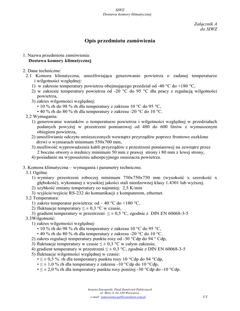 SIWZ Dostawa komory klimatycznej Załącznik A do SIWZ Opis przedmiotu zamówienia 1. Nazwa przedmiotu zamówienia: Dostawa komory klimatycznej 2. Dane techniczne: 2.1 Komora klimatyczna, umożliwiająca generowanie powietrza o zadanej temperaturze i wilgotności względnej: 1) w zakresie temperatury powietrza obejmującego przedział od -40 °C do +180 °C, 2) w zakresie temperatury powietrza od -20 °C do 95 °C dla pracy z regulacją wilgotności powietrza, 3) zakres wilgotności względnej: • 10 % rh do 98 % rh dla temperatury z zakresu 10 °C do 95 °C, • 40 % rh do 80 % rh dla temperatury z zakresu -20 °C do 10 °C. 2.2 Wymagania: 1) generowanie warunków o temperaturze powietrza i wilgotności względnej w przedziałach podanych powyżej w przestrzeni pomiarowej od 480 do 600 litrów z wymuszonym obiegiem powietrza, 2) umożliwianie odczytu umieszczonych wewnątrz przyrządów poprzez frontowe oszklone drzwi o wymiarach minimum 550x700 mm, 3) możliwość wyprowadzenia kabli przyrządów z przestrzeni pomiarowej na zewnątrz przez 2 boczne otwory o średnicy minimum 50 mm z prawej strony i 80 mm z lewej strony, 4) posiadanie na wyposażeniu adsorpcyjnego osuszacza powietrza. 3. Komora klimatyczna – wymagania i parametry techniczne. 3.1 Ogólne 1) wymiary przestrzeni roboczej minimum 750x750x750 mm (wysokość x szerokość x głębokość), wykonanej z wysokiej jakości stali nierdzewnej klasy 1.4301 lub wyższej. 2) szybkość zmiany temperatury co najmniej: 2,5 K/min 3) wyjście/wejście RS-232 do komunikacji z komputerem, ethernet. 3.2 Temperatura: 1) zakres temperatur powietrza: od – 40 °C do +180 °C, 2) fluktuacje temperatury ≤ ± 0,3 °C w czasie, 3) gradient temperatury w przestrzeni ≤ ± 0,5 °C, zgodnie z DIN EN 60068-3-5 3.3Wilgotność: 1) zakres wilgotności względnej: • 10 % rh do 98 % rh dla temperatury z zakresu 10 °C do 95 °C, • 40 % rh do 80 % rh dla temperatury z zakresu -20 °C do 10 °C. 2) zakres regulacji temperatury punktu rosy od -30 °Cdp do 94 ° Cdp, 3) fluktuacje temperatury w czasie ≤ ± 0,3 °C w całym zakresie, 4) gradient temperatury w przestrzeni ≤ ± 0,3 °C, zgodnie z DIN EN 60068-3-5 5) fluktuacje wilgotności względnej w czasie: • ≤ ± 0,5 % rh dla temperatury punktu rosy 10 °Cdp do 94 °Cdp, • ≤ ± 1,0 % rh dla temperatury z zakresu -10 °Cdp do 10 °Cdp, • ≤ ± 2,0 % rh dla temperatury punktu rosy poniżej -30 °Cdp do -10 °Cdp. Instytut Energetyki, Dział Zamówień Publicznych ul. Mory 8, 01-330 Warszawa, e-mail: [email protected] 1/1