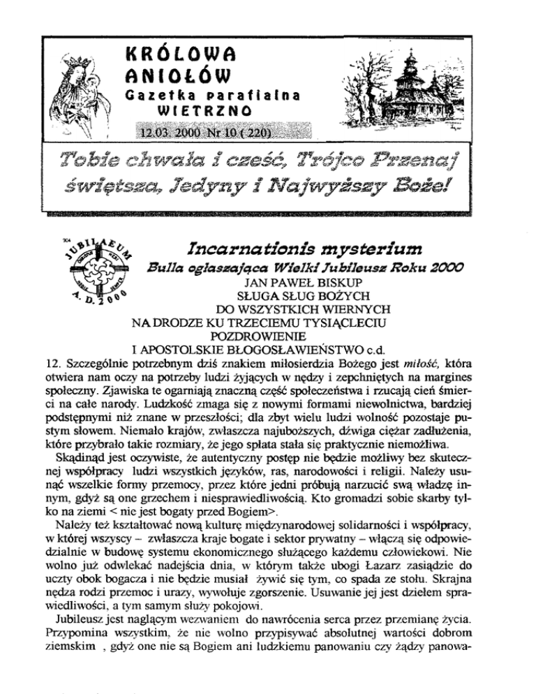 m KRÓLOWA ANIOŁÓW Gazet ka p a r a f i a l n a WI E T R Z N O waJa i cześć, Trójce P rze n a j Jedyn y i N a jw y ższy Boże! Incarnationis mysterium Bulla ogłaszająca W ielki Jubileusz Roku 2000 JAN PAWEŁ BISKUP SŁUGA SŁUG BOŻYCH DO WSZYSTKICH WIERNYCH NADRODZE KU TRZECIEMU TYSIĄCLECIU POZDROWIENIE I APOSTOLSKIE BŁOGOSŁAWIEŃSTWO c.d. 12. Szczególnie potrzebnym dziś znakiem miłosierdzia Bożego jest miłość, która otwiera nam oczy na potrzeby ludzi żyjących w nędzy i zepchniętych na margines społeczny. Zjawiska te ogarniają znaczną część społeczeństwa i rzucają cień śmier ci na całe narody. Ludzkość zmaga się z nowymi formami niewolnictwa, bardziej podstępnymi niż znane w przeszłości; dla zbyt wielu ludzi wolność pozostaje pu stym słowem. Niemało krajów, zwłaszcza najuboższych, dźwiga ciężar zadłużenia, które przybrało takie rozmiaiy, że jego spłata stała się praktycznie niemożliwa. Skądinąd jest oczywiste, że autentyczny postęp nie będzie możliwy bez skutecz nej współpracy ludzi wszystkich języków, ras, narodowości i religii. Należy usu nąć wszelkie formy przemocy, przez które jedni próbują narzucić swą władzę in nym, gdyż są one grzechem i niesprawiedliwością. Kto gromadzi sobie skarby tyl ko na ziemi < nie jest bogaty przed Bogiem>. Należy też kształtować nową kulturę międzynarodowej solidarności i współpracy, w której wszyscy - zwłaszcza kraje bogate i sektor prywatny - włączą się odpowie dzialnie w budowę systemu ekonomicznego służącego każdemu człowiekowi. Nie wolno już odwlekać nadejścia dnia, w którym także ubogi Łazarz zasiądzie do uczty obok bogacza i nie będzie musiał żywić się tym, co spada ze stołu. Skrajna nędza rodzi przemoc i urazy, wywołuje zgorszenie. Usuwanie jej jest dziełem spra wiedliwości, a tym samym służy pokojowi. Jubileusz jest naglącym wezwaniem do nawrócenia serca przez przemianę życia. Przypomina wszystkim, że nie wolno przypisywać absolutnej wartości dobrom ziemskim , gdyż one nie są Bogiem ani ludzkiemu panowaniu czy żądzy panowa- m a ją p ra w o się złościć ? Każde dziecko od czasu do czasu złości się na swoich rodziców. Czy możemy się godzić na te wybuchy gniewu i jak powinniśmy na nie reagować. Dziecko, któremu nie wolno swobodnie okazywać negatywnych emocji wobec ojca lub matki, będzie akumulowało w sobie złość. Doprowadzi to do stanu, który psychologowie na zywają „ bierną agresją”. Może się to objawiać przygnębieniem, dąsami, nocnym mocze niem, słabymi ocenami w szkole. Sfrustrowane dziecko popada w depresję, pochłania z ner wów ogromne ilości jedzenia. Dzieci zazwyczaj nie mają pojęcia, że ich dziwne zachowanie bierze się ze złości. Te reakcje to nieświadomy sposób wyrażania nagromadzonej wrogości wobec rodziców. Dlatego należy godzić się na dziecięce wybuchy gniewu. Z drugiej strony należy uczyć dzieci szacunku wobec rodziców. Dzieci nie powinny zwracać się do rodziców po imieniu, zachowywać się nonszalancko i pogardliwie. Powinna raczej obowiązywać zasa da, że wolno wyrazić swoje niezadowolenie i złość, ale pod warunkiem zachowania odpo wiednich manier. Komunikaty w rodzaju: „Zawstydziłaś mnie w obecności moich przyjaciół” albo: „Moje kieszonkowe wydaje mi się za małe”, czy: „Czasem mam wrażenie, że bardziej ode mnie ko chasz Bilły’ego” uświadamiają rodzicom, co dręczy i boli ich dzieci. Niedopuszczalne są na tomiast formy obraźliwe, niegrzeczne. Stosując się do tej zasady, uczymy dzieci, jak można okazywać niezadowole nie, nie raniąc niczyich uczuć. Ta umiejętność przyda im się w przyszłości, w do rosłym życiu. c.d. ze str. 1 nia , bo ziemia należy do Boga i tylko do Niego: <ziemia należy do Mnie, a wy jesteście u Mnie przybyszami i osadnikami>. Oby ten rok łaski poruszył serca tych wszystkich, w rękach których są losy narodów! 13. Świadectwem prawdy chrześcijańskiej miłości - zawsze czytelnym, dziś jednak szczegól nie wymownym - jest pamięć o męczennikach. Niech ich świadectwo nie będzie zapomniane. Głosili oni Ewangelię, oddając życie dla miłości. Zwłaszcza w naszej epoce męczennik jest znakiem owej największej miłości, w której zawierają się wszystkie inne wartości. Jego życie jest odblaskiem wzniosłych słów Chrystusa, wypowiedzianych na krzyżu: <Ojcze, przebacz im, bo nie wiedzą, co czynią >. Człowiek wierzący, traktujący poważnie swoje chrześcijańskie powołanie, w którym mę czeństwo jest możliwością zapowiedzianą już w Objawieniu, nie może usunąć tej perspekty wy z horyzontu własnego życia. W ciągu dwóch tysięcy lat od narodzenia Chrystusa zawsze obecne było świadectwo męczenników. Także nasze stulecie, zbliżające się ku końcowi, wydało bardzo wielu męczenników, którzy ponieśli śmierć przede wszystkim jako ofiary nazizmu i komunizmu oraz walk rasowych i plemiennych, c.d.n. __ Dziś li_ j\ tj. 12.03.2000 r * N 1 E D Z IE L A 1 W P °- i ‘ *, sto. Dziś po Sumie Jl Życia partii Gorzkie Żale □ w tym tygodniu Msze św. tylko w piątek po Drodze Krzyżowej i w sobotę o godz. 17—ÓW piątek Droga Krzyżowa o godz 17— a po niej Msza św. „ Idźcie więc na cały świat i nauczajcie wszystkie narody, udzielając im chrztu w imię Ojca i Syna i Ducha Świętego. Uczcie je zachowywać wszystko, co wam przykazałem55. W tym tygodniu za łaskę chrztu św. Dziękują: 13.03 Zofia Helnarska; 14.03 Irena Fran kiewicz, Ferdynand Kusiak, Stefania Leś, Piotr Pietruszka; 15.03 - Maria Longawa; 17.03.- Stanisław Władyka; 18.03 - Tomasz Bogacz, Grzegorz Kijowski; 19.03 - Anna Bogacz, Kazimiera Kamińska, Ireneusz Kijowski, Paweł Longa wa, Józef Szyszlak. Żywot wieczny - Nie możemy dowie dzieć się jak wygląda niebo. Nie znamy losu, który czeka nas po śmierci. Tajem nica szczęśliwej komunii z Bogiem i wszy