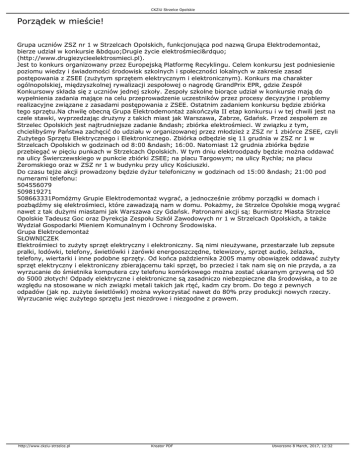 CKZiU Strzelce Opolskie Porządek w mieście! Grupa uczniów ZSZ nr 1 w Strzelcach Opolskich, funkcjonująca pod nazwą Grupa Elektrodemontaż, bierze udział w konkursie „Drugie życie elektrośmieci” (http://www.drugiezycieelektrosmieci.pl). Jest to konkurs organizowany przez Europejską Platformę Recyklingu. Celem konkursu jest podniesienie poziomu wiedzy i świadomości środowisk szkolnych i społeczności lokalnych w zakresie zasad postępowania z ZSEE (zużytym sprzętem elektrycznym i elektronicznym). Konkurs ma charakter ogólnopolskiej, międzyszkolnej rywalizacji zespołowej o nagrodę GrandPrix EPR, gdzie Zespół Konkursowy składa się z uczniów jednej szkoły. Zespoły szkolne biorące udział w konkursie mają do wypełnienia zadania mające na celu przeprowadzenie uczestników przez procesy decyzyjne i problemy realizacyjne związane z zasadami postępowania z ZSEE. Ostatnim zadaniem konkursu będzie zbiórka tego sprzętu.Na chwilę obecną Grupa Elektrodemontaż zakończyła II etap konkursu i w tej chwili jest na czele stawki, wyprzedzając drużyny z takich miast jak Warszawa, Zabrze, Gdańsk. Przed zespołem ze Strzelec Opolskich jest najtrudniejsze zadanie – zbiórka elektrośmieci. W związku z tym, chcielibyśmy Państwa zachęcić do udziału w organizowanej przez młodzież z ZSZ nr 1 zbiórce ZSEE, czyli Zużytego Sprzętu Elektrycznego i Elektronicznego. Zbiórka odbędzie się 11 grudnia w ZSZ nr 1 w Strzelcach Opolskich w godzinach od 8:00 – 16:00. Natomiast 12 grudnia zbiórka będzie przebiegać w pięciu punkach w Strzelcach Opolskich. W tym dniu elektroodpady będzie można oddawać na ulicy Świerczewskiego w punkcie zbiórki ZSEE; na placu Targowym; na ulicy Rychla; na placu Żeromskiego oraz w ZSZ nr 1 w budynku przy ulicy Kościuszki. Do czasu tejże akcji prowadzony będzie dyżur telefoniczny w godzinach od 15:00 – 21:00 pod numerami telefonu: 504556079 509819271 508663331Pomóżmy Grupie Elektrodemontaż wygrać, a jednocześnie zróbmy porządki w domach i pozbądźmy się elektrośmieci, które zawadzają nam w domu. Pokażmy, że Strzelce Opolskie mogą wygrać nawet z tak dużymi miastami jak Warszawa czy Gdańsk. Patronami akcji są: Burmistrz Miasta Strzelce Opolskie Tadeusz Goc oraz Dyrekcja Zespołu Szkół Zawodowych nr 1 w Strzelcach Opolskich, a także Wydział Gospodarki Mieniem Komunalnym i Ochrony Środowiska. Grupa Elektrodemontaż SŁOWNICZEK Elektrośmieci to zużyty sprzęt elektryczny i elektroniczny. Są nimi nieużywane, przestarzałe lub zepsute pralki, lodówki, telefony, świetlówki i żarówki energooszczędne, telewizory, sprzęt audio, żelazka, telefony, wiertarki i inne podobne sprzęty. Od końca października 2005 mamy obowiązek oddawać zużyty sprzęt elektryczny i elektroniczny zbierającemu taki sprzęt, bo przecież i tak nam się on nie przyda, a za wyrzucanie do śmietnika komputera czy telefonu komórkowego można zostać ukaranym grzywną od 50 do 5000 złotych! Odpady elektryczne i elektroniczne są zasadniczo niebezpieczne dla środowiska, a to ze względu na stosowane w nich związki metali takich jak rtęć, kadm czy brom. Do tego z pewnych odpadów (jak np. zużyte świetlówki) można wykorzystać nawet do 80% przy produkcji nowych rzeczy. Wyrzucanie więc zużytego sprzętu jest niezdrowe i niezgodne z prawem. http://www.ckziu-strzelce.pl Kreator PDF Utworzono 8 March, 2017, 12:32