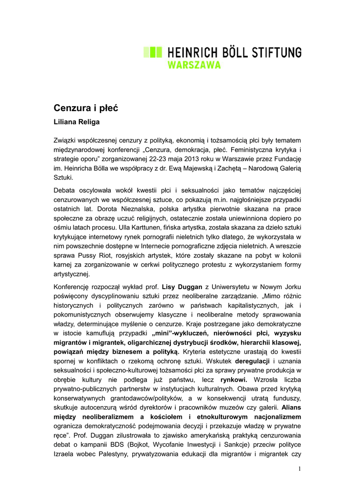 Cenzura i płeć Liliana Religa Związki współczesnej cenzury z polityką, ekonomią i tożsamością płci były tematem międzynarodowej konferencji „Cenzura, demokracja, płeć. Feministyczna krytyka i strategie oporu” zorganizowanej 22-23 maja 2013 roku w Warszawie przez Fundację im. Heinricha Bölla we współpracy z dr. Ewą Majewską i Zachętą – Narodową Galerią Sztuki. Debata oscylowała wokół kwestii płci i seksualności jako tematów najczęściej cenzurowanych we współczesnej sztuce, co pokazują m.in. najgłośniejsze przypadki ostatnich lat. Dorota Nieznalska, polska artystka pierwotnie skazana na prace społeczne za obrazę uczuć religijnych, ostatecznie została uniewinniona dopiero po ośmiu latach procesu. Ulla Karttunen, fińska artystka, została skazana za dzieło sztuki krytykujące internetowy rynek pornografii nieletnich tylko dlatego, że wykorzystała w nim powszechnie dostępne w Internecie pornograficzne zdjęcia nieletnich. A wreszcie sprawa Pussy Riot, rosyjskich artystek, które zostały skazane na pobyt w kolonii karnej za zorganizowanie w cerkwi politycznego protestu z wykorzystaniem formy artystycznej. Konferencję rozpoczął wykład prof. Lisy Duggan z Uniwersytetu w Nowym Jorku poświęcony dyscyplinowaniu sztuki przez neoliberalne zarządzanie. „Mimo różnic historycznych i politycznych zarówno w państwach kapitalistycznych, jak i pokomunistycznych obserwujemy klasyczne i neoliberalne metody sprawowania władzy, determinujące myślenie o cenzurze. Kraje postrzegane jako demokratyczne w istocie kamuflują przypadki „mini”-wykluczeń, nierówności płci, wyzysku migrantów i migrantek, oligarchicznej dystrybucji środków, hierarchii klasowej, powiązań między biznesem a polityką. Kryteria estetyczne urastają do kwestii spornej w konfliktach o rzekomą ochronę sztuki. Wskutek deregulacji i uznania seksualności i społeczno-kulturowej tożsamości płci za sprawy prywatne produkcja w obrębie kultury nie podlega już państwu, lecz rynkowi. Wzrosła liczba prywatno-publicznych partnerstw w instytucjach kulturalnych. Obawa przed krytyką konserwatywnych grantodawców/polityków, a w konsekwencji utratą funduszy, skutkuje autocenzurą wśród dyrektorów i pracowników muzeów czy galerii. Alians między neoliberalizmem a kościołem i etnokulturowym nacjonalizmem ogranicza demokratyczność podejmowania decyzji i przekazuje władzę w prywatne ręce”. Prof. Duggan zilustrowała to zjawisko amerykańską praktyką cenzurowania debat o kampanii BDS (Bojkot, Wycofanie Inwestycji i Sankcje) przeciw polityce Izraela wobec Palestyny, prywatyzowania edukacji dla migrantów i migrantek czy 1 ataków środowisk konserwatywnych i religijnych na women’s studies. Przykładem wojen kulturowych inspirowanych przez opozycję katolicką jest zdaniem prof. Duggan także przypadek Doroty Nieznalskiej i zarzuty o pedofilię wobec fotografki Livingstone czy artystki Ulli Karttunen. Ponadto strategiczne sojusze między prawicą, kościołem a neoliberalnym rynkiem w sposób niejawny konstruują oportunizm w środowiskach artystycznych. Bezwzględność biopolitycznego zarządzania dobrze pokazuje historia Ulli Karttunen skazanej za dzieło sztuki, w którym krytykowała internetowy rynek pornografii nieletnich. Mimo iż w projekcie The Virgin-Whore Church wykorzystała powszechnie dostępne w Internecie zdjęcia, oskarżono ją o rozpowszechnianie dziecięcej pornografii. Broniąc prawa do swobody wypowiedzi, odwołała się do Trybunału w Strasburgu, który jednak odrzucił jej skargę. Powszechnie powoływano się na ochronę dzieci, by odwrócić uwagę od zdominowania rynku przez treści pornograficzne i obsesyjnego przywiązania do treści o charakterze seksualnym. Dr hab. Paweł Leszkowicz, teoretyk sztuki i kurator z Instytutu Historii Sztuki UAM, podjął kwestię traktowania osób homoseksualnych w Rosji po przyjęciu ustawy penalizującej „propagowanie homoseksualizmu". 11 czerwca 2013 roku rosyjska Duma ostatecznie uchwaliła zakaz „dystrybucji informacji o atrakcyjności nietradycyjnych stosunków seksualnych oraz równorzędności tradycyjnych i nietradycyjnych relacji”. Mimo protestów projekt zostanie podpisany przez Radę Federacji i Putina. Podobne ustawy obowiązują już w dziesięciu regionach Federacji Rosyjskiej. Zmiany legislacyjne znacząco ograniczą wolność queerowej ekspresji artystycznej. Muzea, instytucje kulturalne, publikacje czy nagrania pozytywnie odnoszące się do homoseksualności znajdą się pod silną presją wartości ortodoksyjnych. Podobne tendencje daje się zauważyć na Litwie, gdzie parlament – mimo weta prezydenta – przyjął ustawę o zakazie promocji homoseksualizmu. „Choć zwykło się demonizować Europę Środkowo-Wschodnią za brak tolerancji wobec homoseksualizmu, to należy pamiętać, że restrykcyjne prawo obowiązywało do niedawna także w krajach zachodnich, takich jak Wielka Brytania” – zauważył dr Leszkowicz. Dr Tamara Zlobina wygłosiła referat o ukrytych formach cenzury i ich wpływie na sztukę kobiet na Ukrainie. Zdaniem filozofki i krytyczki sztuki jej państwo nie traktuje kobiet jako obywatelek z konkretnymi potrzebami, a zamyka je w stereotypach dwóch modeli – superwoman o wyglądzie Barbie i strażniczki tożsamości narodowej Berehynii. „Mainstreamowe media dewaluują sztukę kobiet, zawężają ją do tematyki cielesności, seksualności i przecenianego macierzyństwa. Feministycznych autorek nie uznaje się za źródło odniesienia”. Dorota Jarecka, krytyczka sztuki „Gazety Wyborczej”, wspomniała poczucie zażenowania i psychologicznej, przemocowej presji towarzyszącej cenzurowaniu wystaw Zofii Kulik w Muzeum Narodowym w Poznaniu, zniszczeniu rzeźby Maurizio Cattelana czy atakowi na fotosy Piotra Uklańskiego „Naziści". Tego typu zachowania przypisała syndromowi postkomunizmu: „Rozpłynęła się autorytarna władza, nato