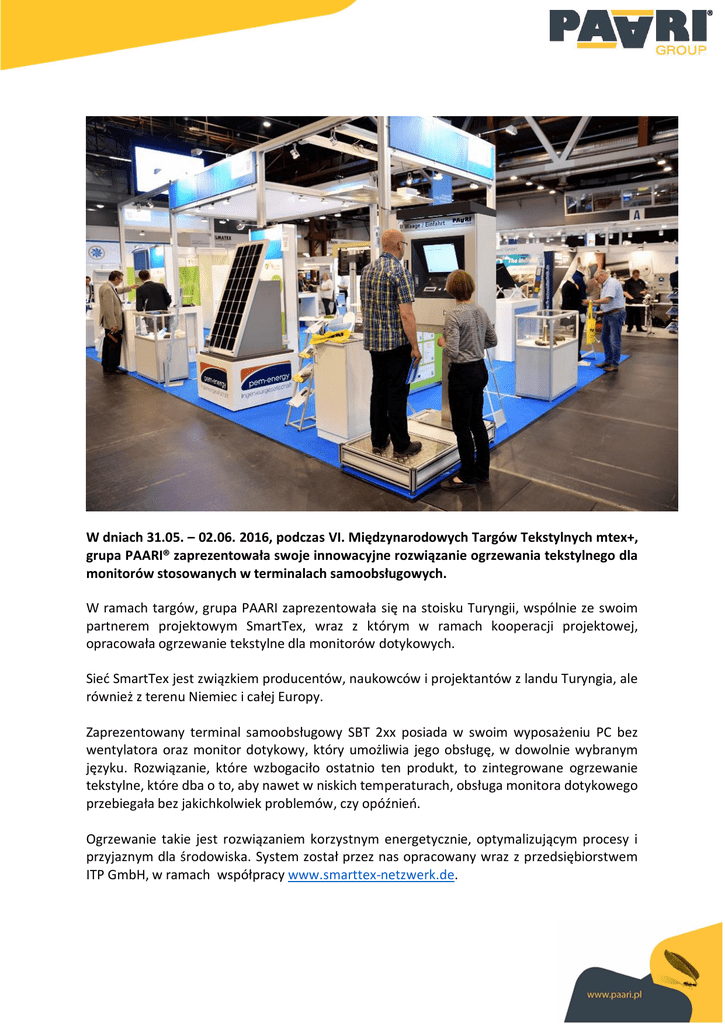 W dniach 31.05. – 02.06. 2016, podczas VI. Międzynarodowych Targów Tekstylnych mtex+, grupa PAARI® zaprezentowała swoje innowacyjne rozwiązanie ogrzewania tekstylnego dla monitorów stosowanych w terminalach samoobsługowych. W ramach targów, grupa PAARI zaprezentowała się na stoisku Turyngii, wspólnie ze swoim partnerem projektowym SmartTex, wraz z którym w ramach kooperacji projektowej, opracowała ogrzewanie tekstylne dla monitorów dotykowych. Sieć SmartTex jest związkiem producentów, naukowców i projektantów z landu Turyngia, ale również z terenu Niemiec i całej Europy. Zaprezentowany terminal samoobsługowy SBT 2xx posiada w swoim wyposażeniu PC bez wentylatora oraz monitor dotykowy, który umożliwia jego obsługę, w dowolnie wybranym języku. Rozwiązanie, które wzbogaciło ostatnio ten produkt, to zintegrowane ogrzewanie tekstylne, które dba o to, aby nawet w niskich temperaturach, obsługa monitora dotykowego przebiegała bez jakichkolwiek problemów, czy opóźnień. Ogrzewanie takie jest rozwiązaniem korzystnym energetycznie, optymalizującym procesy i przyjaznym dla środowiska. System został przez nas opracowany wraz z przedsiębiorstwem ITP GmbH, w ramach współpracy www.smarttex-netzwerk.de. Podczas prezentacji nowego produktu istotne było dla nas nie tylko pokazanie jego wyglądu, ale również zastosowania w praktyce. Za pomocą elektroniki w terminalu samoobsługowych, umożliwiliśmy pomiar masy osób odwiedzających targi. Pomimo początkowych obaw, z możliwości takiej, skorzystało kilku „śmiałków”, nie bojących się swojego wyniku ważenia. O PAARI® Grupa PAARI® jest wiodącym dostawcą rozwiązań z zakresu logistyki zakładowej, oprogramowania, automatyzacji oraz techniki wagowej. Do grupy należą dwie spółki niemieckie: PAARI® Waagen- und Anlagenbau GmbH & Co.KG i PAARI® Systemhaus GmbH oraz polska, siostrzana spółka PAARI® Wagi i Urządzenia Przemysłowe Sp. z o.o. Nasze rozwiązania odpowiadają na Państwa specyficzne potrzeby dot. różnych dziedzin funkcjonowania przedsiębiorstwa. Tworzymy oprogramowanie, które optymalizuje procesy zachodzące na terenie firmy oraz oferujemy rozwiązania automatyzujące te procesy. Całość uzupełniają produkowane przez nas niezawodne wagi i systemy wagowe. W ofercie naszej firmy znaleźć można bardzo wytrzymałe wagi samochodowe dedykowane m.in. branży materiałów sypkich, jak również swobodnie programowalne systemy elektroniczne z połączeniami sieciowymi dla branży rolnej, czy też kompleksowe rozwiązania dla procesów występujących w biogazowniach. Oferujemy ponadto rozwiązanie polegające na możliwości skonsolidowania danych pochodzących z różnych oddziałów firmy, do księgowości w centrali firmy. Ułatwiamy ważenie i zarządzanie danymi. Nasze wagi cechuje duży komfort użytkowania, a oprogramowanie może zostać skonfigurowane pod kątem Państwa indywidualnych potrzeb. Dzięki modułowej budowie, nasze systemy mogą zostać również zintegrowane z istniejącymi już wagami oraz sieciami zakładowymi, stanowiąc tym samym łatwą oraz korzystną cenowo alternatywę. Przy powielaniu powyższych informacji, prosimy o podanie ich źródła i przesłanie egzemplarzy okazowych. Kontakt: a.kornek(at)paari.pl; +48 77 402 17 79