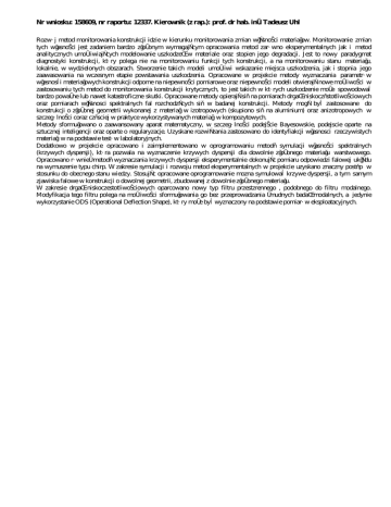 Nr wniosku: 158609, nr raportu: 12337. Kierownik (z rap.): prof. dr hab. inż. Tadeusz Uhl Rozwój metod monitorowania konstrukcji idzie w kierunku monitorowania zmian włąsności materiałow. Monitorowanie zmian tych własności jest zadaniem bardzo złożonym wymagającym opracowania metod zarówno eksperymentalnych jak i metod analitycznych umożliwiających modelowanie uszkodzeń w materiale oraz stopien jego degradacji. Jest to nowy paradygmat diagnostyki konstrukcji, który polega nie na monitorowaniu funkcji tych konstrukcji, a na monitorowaniu stanu materiału, lokalnie, w wydzielonych obszarach. Stworzenie takich modeli umożliwi wskazanie miejsca uszkodzenia, jak i stopnia jego zaawasowania na wczesnym etapie powstawania uszkodzenia. Opracowane w projekcie metody wyznaczania parametrów własnosći materiałowych konstrukcji odporne na niepewności pomiarowe oraz niepewności modeli otwierają nowe możliwości w zastosowaniu tych metod do monitorowania konstrukcji krytycznych, to jest takich w których uszkodzenie może spowodować bardzo poważne lub nawet katastroficzne skutki. Opracowane metody opierają się na pomiarach drgań niskoczęstotliwościowych oraz pomiarach włąsnosci spektralnych fal rozchodzących się w badanej konstrukcji. Metody mogą być zastosowane do konstrukcji o złożonej geometrii wykonanej z materiałów izotropowych (skupiono się na aluminium) oraz anizotropowych w szczególności coraz częsciej w praktyce wykorzystywanych materiałów kompozytowych. Metody sformułowano o zaawansowany aparat matematyczny, w szczególności podejście Bayesowskie, podejscie oparte na sztucznej inteligencji oraz oparte o regularyzacje. Uzyskane rozwiązania zastosowano do identyfiakcji własnosci rzeczywistych materiałów na podstawie testów labolatoryjnych. Dodatkowo w projekcie opracowano i zaimplementowano w oprogramowaniu metodę symulacji własności spektralnych (krzywych dyspersji), która pozwala na wyznaczenie krzywych dyspersji dla dowolnie złożonego materiału warstwowego. Opracowano również metodę wyznaczania krzywych dyspersji eksperymentalnie dokonując pomiaru odpowiedzi falowej ukłądu na wymuszenie typu chirp. W zakresie symulacji i rozwoju metod eksperymentalnych w projekcie uzyskano znaczny postęp w stosunku do obecnego stanu wiedzy. Stosując opracowane oprogramowanie mozna symulować krzywe dyspersji, a tym samym zjawiska falowe w konstrukcji o dowolnej geometrii, zbudowanej z dowolnie złożonego materiału. W zakresie drgań niskoczestotliwościowych oparcowano nowy typ filtru przestzrennego , podobnego do filtru modalnego. Modyfikacja tego filtru polega na możliwości sformułowania go bez przeprowadzania żmudnych badań modalnych, a jedynie wykorzystanie ODS (Operational Deflection Shape), który może być wyznaczony na podstawie pomiarów eksploatacyjnych.