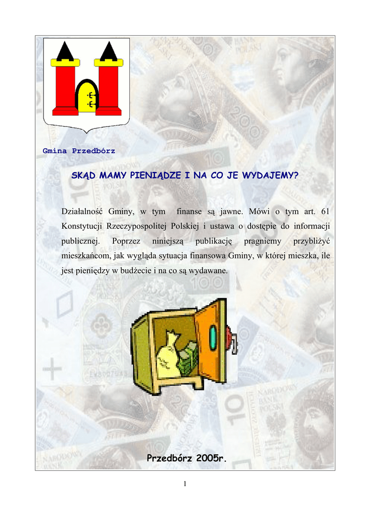 Gmina Przedbórz SKĄD MAMY PIENIĄDZE I NA CO JE WYDAJEMY? Działalność Gminy, w tym finanse są jawne. Mówi o tym art. 61 Konstytucji Rzeczypospolitej Polskiej i ustawa o dostępie do informacji publicznej. Poprzez niniejszą publikację pragniemy przybliżyć mieszkańcom, jak wygląda sytuacja finansowa Gminy, w której mieszka, ile jest pieniędzy w budżecie i na co są wydawane. Przedbórz 2005r. 1 Co to jest budżet? Każda rodzina, firma, instytucja i każde państwo ma wydatki i dochody. Zestawienie dochodów i przychodów oraz wydatków i rozchodów dotyczących jakiegoś określonego czasu - na przykład miesiąca lub roku – nazywamy budżetem. W budżecie domowym dochodami są m.in.: pensje członków rodziny, emerytury, darowizny, zasiłki, zysk z lokat bankowych. Gospodarstwo domowe wydaje pieniądze zależnie od swoich potrzeb i posiadanych środków. Przykładowe wydatki gospodarstwa domowego obejmują: 1. Zakupy produktów spożywczych 2. Wydatki na dzieci 3. Czynsz, energia elektryczna, gaz, telefon, abonament radiowo-telewizyjny 4. 5. Zakup ubrań 6. Zakup komputera 2 Budżet gminy jest więc podobny do budżetu rodzinnego, w którym także planuje się uzyskiwanie w ciągu roku określonych dochodów i dostosowanych do nich wydatków. Prace związane z uchwaleniem budżetu rozpoczynają się w III kwartale roku poprzedzającego rok budżetowy. Do końca września wszystkie jednostki budżetowe przedkładają Burmistrzowi zestawienia planowanych dochodów i wydatków. W tym też terminie powinny wpłynąć do Burmistrza wszelkie wnioski dotyczące budżetu od organizacji zainteresowanych realizacją zadań gminy na zasadzie spisanych porozumień, jak również od mieszkańców. Na podstawie zebranych materiałów Skarbnik Miasta dokonuje zbiorczego zestawienia. Prace nad przedmiotowym zestawieniem trwają tak długo, dopóki nie osiągnie się równowagi budżetowej. Dochody + Przychody = Wydatki + Rozchody W terminie do 15 listopada Burmistrz zobowiązany jest przedłożyć projekt budżetu Radzie Miejskiej, która do 31 grudnia ostatecznie winna uchwalić budżet na rok następny. W uzasadnionych sytuacjach termin uchwalenia budżetu może być przesunięty do 31 marca następnego roku. Jednak w ciągu roku budżetowego zachodzą zdarzenia, których nie można było przewidzieć w chwili uchwalania budżetu zarówno po stronie dochodowej jak i wydatkowej, dlatego też dokonuje się zmian w budżecie w trakcie jego realizacji. Na straży zachowania równowagi budżetowej stoją: Rada Miejska, Komisja Rewizyjna, Burmistrz oraz Skarbnik. Zestawienie dochodów i wydatków Gminy Przedbórz w latach 2003 – 2005 przedstawia się następująco: Dochody + Przychody = Wydatki + Rozchody Rok 2003 Dochody 10.554.046 + Przychody Wydatki 10.676.606 + 512.487 Rozchody 11.066.533 389.927 11.066.533 3 Dochody + Przychody = Wydatki + Rozchody Rok 2004 Dochody 11.839.438 + Wydatki 12.089.825 + Przychody 877.975 Rozchody 12.717.413 627.588 12.717.413 Rok 2005 Dochody 12.923.187 + Wydatki 16.637.339 + Przychody 4.115.582 Rozchody 17.038.769 401.430 17.038.769 18 000 000 zł 16 000 000 zł 14 000 000 zł 12 000 000 zł Dochody Przychody Wydatki Rozchody 10 000 000 zł 8 000 000 zł 6 000 000 zł 4 000 000 zł 2 000 000 zł 0 zł 2003r. 2004r. 2005r. Szczegółowe źródła dochodów gminy określa ustawa o dochodach jednostek samorządu terytorialnego. Dochody to pieniądze, które uzyskujemy do gminnej kasy z różnych źródeł, a ich głównymi źródłami są: – subwencje, które są formą zasilania budżetów gmin przez budżet państwa, – dotacje (łac. dotatio – wyposażam) będące formą wydatku z budżetu państwa na rzecz gmin o ścisłym przeznaczeniu i wysokości, – podatki jako obowiązkowe płatności na rzecz Skarbu Państwa lub gmin. Przychody to pieniądze pochodzące z zaciąganych kredytów i pożyczek oraz nadwyżki budżetowej. Rozchody to pieniądze przeznaczone na spłatę wcześniej zaciągniętych kredytów i pożyczek. 4 Budżet Gminy Przedbórz na 2005 rok został przyjęty Uchwałą Rady Miejskiej Nr XXIV/168/05 w dniu 15 lutego 2005r. i zmieniony uchwałami nr: XXV/178/05, XXVI/184/05, XXVII/192/05, XXVIII/203/05. Dochody Gminy Przedbórz na 2005r. przedstawiają się następująco: -subwencje -dotacje -udziały w podatku dochodowym od osób fizycznych i prawnych -podatek od nieruchomości -podatek leśny -odpłatność za wyżywienie w szkołach, przedszkolu, bursie -podatek rolny -opłata za zezwolenia na sprzedaż alkoholu -podatek od środków transportowych -opłata targowa -dochody z najmu i dzierżaw -podatek od czynności cywilno-prawnych -wpływy ze sprzedaży składników majątkowych -opłata skarbowa -odsetki od środków na rachunkach bankowych -podatek od spadków i darowizn -podatek z tzw karty podatkowej -dochody realizowane przez MDK, Muzeum Ludowe, Biblioteki -odpłatność z tytułu obozów i kolonii -opłata administracyjna -dochody realizowane przez MGOPS -opłata produktowa -różne dochody -wpływy z usług – szkolne schronisko młodzieżowe -podatek od psów -odsetki od nieterminowych płatności 7.593.093 2.476.361 946.144 735.271 161.147 160.340 98.392 83.000 72.314 70.000 62.779 52.000 50.870 38.720 18.631 15.000 14.242 19.096 28.200 8.000 7.000 4.500 141.063 45.724 500 13.800 Na co Gmina Przedbórz wyda w roku 2005 pieniądze Wydatki ogółem wynoszą: w tym: wydatki bieżące wydatki majątkowe (inwestycyjne) 16.637.339 12.250.238 4.387.101 Do wydatków bieżących zaliczamy: • wydatki na wynagrodzenia i pochodne od wynagrodzeń 6.401.923 • dotacje 170.000 • odsetki od kredytów i pożyczek 145.833 • zasiłki 2.234.503 • ochrona zdrowia 117.255 • pozostałe wydatki bieżące 3.180.724 (tj. m.in.: zakup energii elektrycznej, zakup materiałów, usługi, remonty, stypendia) 5 wydatki na wynagrodzenia i pochodne od dotacje odsetki od kredytów i pożyczek zasiłki ochrona zdrowia pozostałe wydatki bie