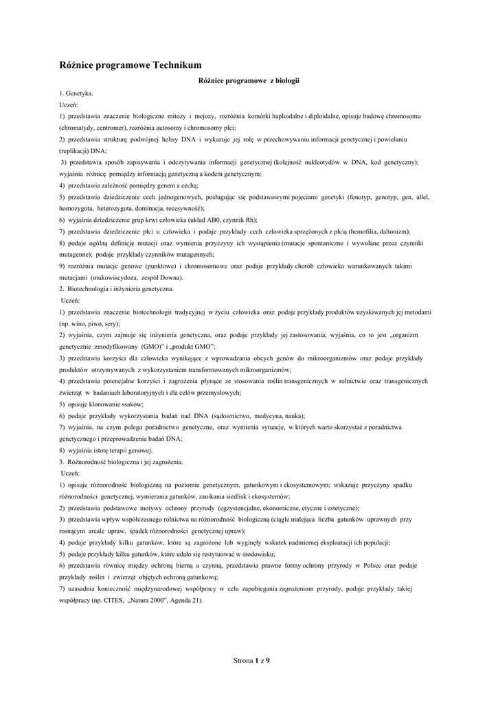 Różnice programowe Technikum Różnice programowe z biologii 1. Genetyka. Uczeń: 1) przedstawia znaczenie biologiczne mitozy i mejozy, rozróżnia komórki haploidalne i diploidalne, opisuje budowę chromosomu (chromatydy, centromer), rozróżnia autosomy i chromosomy płci; 2) przedstawia strukturę podwójnej helisy DNA i wykazuje jej rolę w przechowywaniu informacji genetycznej i powielaniu (replikacji) DNA; 3) przedstawia sposób zapisywania i odczytywania informacji genetycznej (kolejność nukleotydów w DNA, kod genetyczny); wyjaśnia różnicę pomiędzy informacją genetyczną a kodem genetycznym; 4) przedstawia zależność pomiędzy genem a cechą; 5) przedstawia dziedziczenie cech jednogenowych, posługując się podstawowymi pojęciami genetyki (fenotyp, genotyp, gen, allel, homozygota, heterozygota, dominacja, recesywność); 6) wyjaśnia dziedziczenie grup krwi człowieka (układ AB0, czynnik Rh); 7) przedstawia dziedziczenie płci u człowieka i podaje przykłady cech człowieka sprzężonych z płcią (hemofilia, daltonizm); 8) podaje ogólną definicję mutacji oraz wymienia przyczyny ich wystąpienia (mutacje spontaniczne i wywołane przez czynniki mutagenne); podaje przykłady czynników mutagennych; 9) rozróżnia mutacje genowe (punktowe) i chromosomowe oraz podaje przykłady chorób człowieka warunkowanych takimi mutacjami (mukowiscydoza, zespół Downa). 2. Biotechnologia i inżynieria genetyczna. Uczeń: 1) przedstawia znaczenie biotechnologii tradycyjnej w życiu człowieka oraz podaje przykłady produktów uzyskiwanych jej metodami (np. wino, piwo, sery); 2) wyjaśnia, czym zajmuje się inżynieria genetyczna, oraz podaje przykłady jej zastosowania; wyjaśnia, co to jest „organizm genetycznie zmodyfikowany (GMO)” i „produkt GMO”; 3) przedstawia korzyści dla człowieka wynikające z wprowadzania obcych genów do mikroorganizmów oraz podaje przykłady produktów otrzymywanych z wykorzystaniem transformowanych mikroorganizmów; 4) przedstawia potencjalne korzyści i zagrożenia płynące ze stosowania roślin transgenicznych w rolnictwie oraz transgenicznych zwierząt w badaniach laboratoryjnych i dla celów przemysłowych; 5) opisuje klonowanie ssaków; 6) podaje przykłady wykorzystania badań nad DNA (sądownictwo, medycyna, nauka); 7) wyjaśnia, na czym polega poradnictwo genetyczne, oraz wymienia sytuacje, w których warto skorzystać z poradnictwa genetycznego i przeprowadzenia badań DNA; 8) wyjaśnia istotę terapii genowej. 3. Różnorodność biologiczna i jej zagrożenia. Uczeń: 1) opisuje różnorodność biologiczną na poziomie genetycznym, gatunkowym i ekosystemowym; wskazuje przyczyny spadku różnorodności genetycznej, wymierania gatunków, zanikania siedlisk i ekosystemów; 2) przedstawia podstawowe motywy ochrony przyrody (egzystencjalne, ekonomiczne, etyczne i estetyczne); 3) przedstawia wpływ współczesnego rolnictwa na różnorodność biologiczną (ciągle malejąca liczba gatunków uprawnych przy rosnącym areale upraw, spadek różnorodności genetycznej upraw); 4) podaje przykłady kilku gatunków, które są zagrożone lub wyginęły wskutek nadmiernej eksploatacji ich populacji; 5) podaje przykłady kilku gatunków, które udało się restytuować w środowisku; 6) przedstawia równicę między ochroną bierną a czynną, przedstawia prawne formy ochrony przyrody w Polsce oraz podaje przykłady roślin i zwierząt objętych ochroną gatunkową; 7) uzasadnia konieczność międzynarodowej współpracy w celu zapobiegania zagrożeniom przyrody, podaje przykłady takiej współpracy (np. CITES, „Natura 2000”, Agenda 21). Strona 1 z 9 Różnice programowe z geografii 1. 2. 3. 4. 5. 6. 7. Rozwój turystyki na świecie Regiony turystyczne świata i Polski Dysproporcje w rozwoju ekonomicznym państw Współpraca międzynarodowa. Handel międzynarodowy Organizacje międzynarodowe - tylko dla 2O Oddziaływanie człowieka na środowisko Równowaga ekologiczna i oddziałania na rzecz jej odbudowania. Różnice programowe z historii 1. 2. 3. 4. 5. 6. Następstwa I wojny światowej ( polityczne, gospodarcze, społeczne i kulturowe). Cele powołania i charakter Ligi Narodów. Polityka mocarstw wobec Niemiec po zakończeniu I wojny światowej. Odrodzenie państwa polskiego, jego granice i sąsiadów. Postanowienia traktatu wersalskiego dotyczące Polski. Cele i skutki powstania wielkopolskiego oraz trzech powstań śląskich, przyczyny i opisuje następstwa wojny polskobolszewickiej. 7. Ustrój polityczny II Rzeczypospolitej na podstawie konstytucji marcowej z 1921 r. i konstytucji kwietniowej z 1935 r. 8. Czynniki utrudniające proces integracji odrodzonego państwa polskiego. 9. Cele i skutki reformy W. Grabskiego. 10. Wkład J. Piłsudskiego i R. Dmowskiego w odbudowę państwa polskiego. 11. Okoliczności oraz następstwa dojścia do władzy B. Mussoliniego i A. Hitlera. 12. Porównanie faszyzmu z nazizmem, uwzględniając kwestie organizacji państwa, ideologii oraz polityki wobec społeczeństwa. 13. Polityka państw europejskich wobec Hitlera, jej uwarunkowania. 14. Okoliczności dojścia do władzy J. Stalina. 15. Zmiany polityczne, społeczne i gospodarcze w ZSRR po dojściu do władzy Stalina, z uwzględnieniem uprzemysłowienia kraju, kolektywizacji rolnictwa wraz z jej następstwami (wielki głód) i wielkiej czystki. 16. Porównanie totalitarnych systemów hitlerowskich Niemiec i stalinowskiego Związku Radzieckiego. 17. Przyczyny i skutki przewrotu majowego. 18. Cechy rządów sanacji, różnice między demokracją parlamentarną a rządami autorytarnymi. 19. Główne kierunki polityki zagranicznej II Rzeczypospolitej. 20. Struktura społeczna, narodowościowa i wyznaniowa odrodzonego państwa polskiego, przyczyny konfliktów społecznych i narodowościowych, 21. Przejawy kryzysu gospodarczego na świecie i w Polsce, jego specyficzne cechy. 22. Osiągnięcia gospodarcze w II Rzeczypospolitej, w tym budowa portu w 