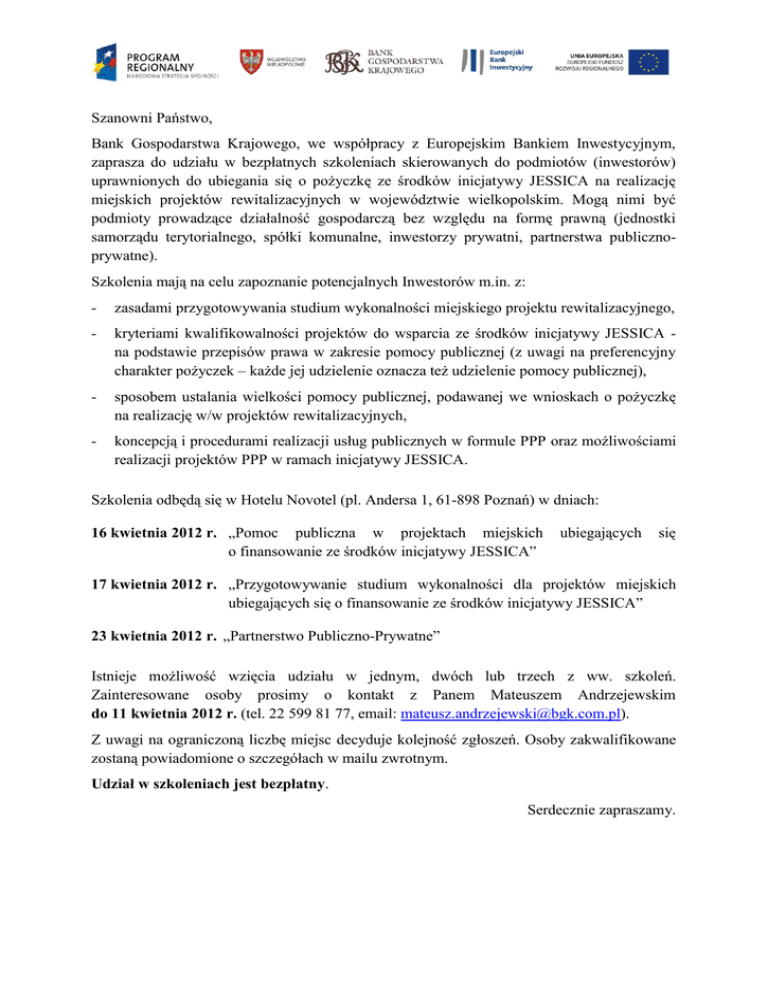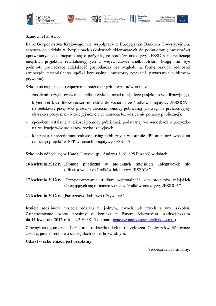 Szanowni Państwo, Bank Gospodarstwa Krajowego, we współpracy z Europejskim Bankiem Inwestycyjnym, zaprasza do udziału w bezpłatnych szkoleniach skierowanych do podmiotów (inwestorów) uprawnionych do ubiegania się o pożyczkę ze środków inicjatywy JESSICA na realizację miejskich projektów rewitalizacyjnych w województwie wielkopolskim. Mogą nimi być podmioty prowadzące działalność gospodarczą bez względu na formę prawną (jednostki samorządu terytorialnego, spółki komunalne, inwestorzy prywatni, partnerstwa publicznoprywatne). Szkolenia mają na celu zapoznanie potencjalnych Inwestorów m.in. z: - zasadami przygotowywania studium wykonalności miejskiego projektu rewitalizacyjnego, - kryteriami kwalifikowalności projektów do wsparcia ze środków inicjatywy JESSICA na podstawie przepisów prawa w zakresie pomocy publicznej (z uwagi na preferencyjny charakter pożyczek – każde jej udzielenie oznacza też udzielenie pomocy publicznej), - sposobem ustalania wielkości pomocy publicznej, podawanej we wnioskach o pożyczkę na realizację w/w projektów rewitalizacyjnych, - koncepcją i procedurami realizacji usług publicznych w formule PPP oraz możliwościami realizacji projektów PPP w ramach inicjatywy JESSICA. Szkolenia odbędą się w Hotelu Novotel (pl. Andersa 1, 61-898 Poznań) w dniach: 16 kwietnia 2012 r. „Pomoc publiczna w projektach miejskich o finansowanie ze środków inicjatywy JESSICA” ubiegających się 17 kwietnia 2012 r. „Przygotowywanie studium wykonalności dla projektów miejskich ubiegających się o finansowanie ze środków inicjatywy JESSICA” 23 kwietnia 2012 r. „Partnerstwo Publiczno-Prywatne” Istnieje możliwość wzięcia udziału w jednym, dwóch lub trzech z ww. szkoleń. Zainteresowane osoby prosimy o kontakt z Panem Mateuszem Andrzejewskim do 11 kwietnia 2012 r. (tel. 22 599 81 77, email: [email protected]). Z uwagi na ograniczoną liczbę miejsc decyduje kolejność zgłoszeń. Osoby zakwalifikowane zostaną powiadomione o szczegółach w mailu zwrotnym. Udział w szkoleniach jest bezpłatny. Serdecznie zapraszamy. SZKOLENIE POMOC PUBLICZNA W PROJEKTACH MIEJSKICH UBIEGAJĄCYCH SIĘ O FINANSOWANIE ZE ŚRODKÓW INICJATYWY JESSICA Termin: 16 kwietnia 2012 r., rozpoczęcie o godz. 10.00 Miejsce: Hotel Novotel (pl. Andersa 1, 61-898 Poznań) Prowadzący: Mikołaj Stasiak, Easy State Aid Kaznowski Stasiak Sp. J. Czas trwania szkolenia: 7 godzin lekcyjnych zgrupowanych w 5 bloków tematycznych Cel szkolenia: zapoznanie uczestników z prawem regulującym udzielanie pomocy publicznej oraz liczeniem wielkości pomocy publicznej w projektach finansowanych z programu JESSICA Forma szkolenia: Wykład Blok I - Zagadnienia ogólne 1. Prawo regulujące udzielanie pomocy publicznej prawo unijne prawo krajowe 2. Pojęcie pomocy publicznej w oparciu o art. 107 ust. 1 Traktatu o Funkcjonowaniu Unii Europejskiej (TFUE) 3. Zasada warunkowej dopuszczalności pomocy publicznej (art. 107 ust. 2-3 TFUE) wyjątki od zakazu udzielenia pomocy publicznej 4. Pomoc publiczna w dotacjach a w instrumentach zwrotnych Blok II - Pomoc de minimis 1. Pomoc de minimis a pomoc publiczna – zalety stosowania pomocy de minimis 2. Zasada kumulacji pomocy de minimis Blok III - Rozporządzenie Komisji (WE) Nr 800/2008 z dnia 6 sierpnia 2008 r. uznające niektóre rodzaje pomocy za zgodne ze wspólnym rynkiem w zastosowaniu art. 87 i 88 Traktatu (Dz. Urz. UE L 214 z 09.08.2008 r.) 1. Przeznaczenia pomocy dopuszczalne w ramach rozporządzenia Komisji (WE) Nr 800/2008 2. Sektory, w których nie można stosować rozporządzenia Komisji (WE) Nr 800/2008 3. Regulacje dotyczące efektu zachęty w rozporządzeniu Komisji (WE) Nr 800/2008 Blok IV - Omówienie Rozporządzenia Ministra Rozwoju Regionalnego z dnia 21 grudnia 2010 r. w sprawie udzielania regionalnej pomocy inwestycyjnej przez fundusze rozwoju obszarów miejskich w ramach regionalnych programów operacyjnych 1. Nowa inwestycja w kontekście inicjatywy JESSICA i projektów rewitalizacyjnych 2. Omówienie wydatków kwalifikowanych w ramach inicjatywy JESSICA 3. Moment kwalifikowalności wydatków Blok V - Doświadczenia innych państw SZKOLENIE PRZYGOTOWYWANIE STUDIUM WYKONALNOŚCI DLA PROJEKTÓW MIEJSKICH UBIEGAJĄCYCH SIĘ O FINANSOWANIE ZE ŚRODKÓW INICJATYWY JESSICA Termin: 1 kwietnia 2012 r., rozpoczęcie o godz. 9.00 Miejsce: Hotel Novotel (pl. Andersa 1, 61-898 Poznań) Prowadzący: dr Paweł Jagiełło Czas trwania szkolenia: 8 godzin lekcyjnych zgrupowanych w 4 bloki po 1,5 godziny Cel szkolenia: Zapoznanie uczestników ze specyfiką programu JESSICA, przedstawienie zasad oceny projektu i układu wniosku o pożyczkę JESSICA; Przedstawienie analizy opłacalności projektu oraz procedury przygotowywania studium wykonalności projektu Forma szkolenia: Wykład wraz z praktycznymi ćwiczeniami demonstrowanymi przez prowadzącego Blok I - Wprowadzenie do programu JESSICA Specyfika programu JESSICA i podkreślenie jego odmienność w stosunku do innych form finansowania projektów z funduszy europejskich Warunki formalne udziału w programie JESSICA Komercyjny charakter inwestycji Procedura ubiegania się o pożyczkę z programu JESSICA Dokumentacja aplikacyjna Blok II - Podstawowe pojęcia z zakresu analizy opłacalności projektu Typologia nakładów inwestycyjnych Prognozowanie przyszłych przychodów Miary opłacalności finansowej projektu Analiza ekonomiczna - wprowadzenie Prognoza spłaty pożyczki Blok III - Studium wykonalności projektu (cz. 1) Cele stawiane przed opracowaniem studium wykonalności projektu Układ studium wykonalności projektu Nietypowe elementy w przygotowywaniu studium wykonalności projektu wynikające z wymogów programu JESSICA Procedura przygotowania studium wykonalności projektu Blok IV - Studium wykonalności projektu (cz. 2) Źródła informacji dla przygotowania studium wykonalności projektu Sposób przygotowania poszczególnych elementów studium Problemy i najczę