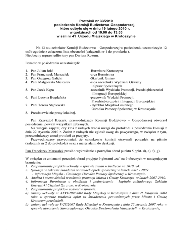 Protokół nr 33/2010 posiedzenia Komisji Budżetowo-Gospodarczej, które odbyło się w dniu 19 lutego 2010 r. w godzinach od 10.00 do 13.55 w sali nr 41 Urzędu Miejskiego w Krotoszynie Na 13-stu członków Komisji Budżetowo – Gospodarczej w posiedzeniu uczestniczyło 12 osób zgodnie z załączoną listą obecności (załącznik nr 1 do protokołu ). Nieobecny usprawiedliwiony pan Dariusz Rozum. Ponadto w posiedzeniu uczestniczyli: 1. 2. 3. 4. Pan Julian Jokś Pan Franciszek Marszałek Pan Grzegorz Galicki Pani Małgorzata Mielcarek 5. Pan Jacek Kępa 6. Pani Lucyna Bogdańska 7. Pani Teresa Stęplewska -Burmistrz Krotoszyna -z-ca Burmistrza -Skarbnik Gminy -z-ca naczelnika Wydziału Oświaty i Spraw Społecznych -naczelnik Wydziału Promocji, Przedsiębiorczości i Integracji Europejskiej -pracownik Wydział Promocji, Przedsiębiorczości i Integracji Europejskiej - dyrektor Miejsko-Gminnego Ośrodka Pomocy Społecznej w Krotoszynie 8. Przedstawiciele prasy lokalnej. Pan Krzysztof Kierzek, przewodniczący Komisji Budżetowo – Gospodarczej otworzył posiedzenie, powitał wszystkich zebranych. Na wstępie zapytał, czy ktoś z radnych wnosi uwagi do protokołu z posiedzenia komisji z dnia 22 stycznia 2010 r. Żaden z radnych nie zgłosił uwag do powyższego, w związku z tym, przewodniczący uznał protokół za przyjęty. Przewodniczący przypomniał, że członkowie komisji otrzymali porządek na piśmie (załącznik nr 2 do protokołu) wraz z materiałami do dyskusji. Pan Franciszek Marszałek prosił o wykreślenie z porządku obrad punktu 5 ppkt. d), e), f), g). W związku ze zmianami porządek obrad przyjęto 9 głosami „za” na 9 obecnych w następującym brzmieniu: 1. Zaopiniowanie projektu uchwały w sprawie zmian w budżecie na 2010 rok. 2. Sytuacja w zakresie świadczeń w ramach opieki społecznej w latach 2007 - 2009 - informacja Miejsko - Gminnego Ośrodka Pomocy Społecznej w Krotoszynie. 3. Analiza i ocena działań w zakresie promocji Miasta i Gminy Krotoszyn w latach 2007-2010. 4. Informacja Burmistrza o obniżeniu i podwyższeniu kapitału zakładowego Zakładu Energetyki Cieplnej Sp. z o.o. w Krotoszynie. 5. Zaopiniowanie projektów uchwał w sprawie: a) zmiany uchwały nr XXVI/209/2004 Rady Miejskiej w Krotoszynie z dnia 25 listopada 2004 roku w sprawie ustalenia opłat za świadczenia prowadzonych przez Miasto i Gminę Krotoszyn przedszkoli, b) zmiany uchwały nr V/28/2007 Rady Miejskiej w Krotoszynie z dnia 25 stycznia 2007 roku w sprawie utworzenia Samorządowego Ośrodka Doskonalenia Nauczycieli w Krotoszynie, c) zmiany uchwały nr XXXV/256/2009 Rady Miejskiej w Krotoszynie z dnia 26 marca 2009 roku w sprawie ustalenia regulaminu określającego wysokość stawek oraz szczegółowe warunki przyznawania dodatków: za wysługę lat, motywacyjnego, funkcyjnego, za warunki pracy; szczegółowe warunki obliczania i wypłacania wynagrodzenia za godziny ponadwymiarowe i godziny doraźnych zastępstw; wysokość i warunki wypłacania innych składników wynagrodzenia nauczycielom zatrudnionym w placówkach oświatowych prowadzonych przez Miasto i Gminę Krotoszyn, d) górnych stawek opłat ponoszonych przez właścicieli nieruchomości za usługi w zakresie odbierania odpadów komunalnych oraz opróżniania zbiorników bezodpływowych i transportu nieczystości ciekłych, e) wymagań, jakie powinien spełniać przedsiębiorca ubiegający się o uzyskanie zezwolenia na świadczenie usług w zakresie odbierania odpadów komunalnych oraz opróżniania zbiorników bezodpływowych i transportu nieczystości ciekłych. 6. Zapytania do informacji o pracy Burmistrza Krotoszyna w okresie międzysesyjnym. 7. Wolne głosy. Przystąpiono do omawiania poszczególnych tematów. Punkt 1 Zaopiniowanie projektu uchwały w sprawie zmian w budżecie na 2010 rok. Materiał członkowie komisji otrzymali - załącznik nr 3 do protokołu. - Rozpatrzenie wniosku o dofinansowanie inwestycji drogowych realizowanych przez powiat krotoszyński w 2010 roku Wprowadzenia dokonał burmistrz Julian Jokś. Poinformował, że wpłynęło pismo z Zarządu Powiatu z propozycją dofinansowania realizacji inwestycji drogowych w wysokości 50% wkładu własnego do przebudowy dróg na Parcelkach oraz 200 tys. zł na budowę ronda (załącznik nr 4 do protokołu). Przypomniał, że pomysłodawcą tej inwestycji była gmina, jednak z uwagi na to, iż dofinansowanie mogą otrzymać wyłącznie drogi powiatowe przekonywaliśmy powiat do złożenia wniosku. Dodał, że od początku rozmów gmina oferowała pomoc przy realizacji tego zadania. Podkreślił, że pierwsze sugestie powiatu były takie, iż gmina w 100% dofinansuje wkład własny powiatu, kolejna propozycja była taka, że gmina dołoży 4 mln. zł, powiat 1.200.000 zł, obecna propozycja jest pierwszą partnerską decyzją. Oznajmił, że gmina jest skłonna do współfinansowania tego zadania ale musimy dokonać korekty 3 zadań inwestycyjnych: 1) uzbrojenia terenu w obrębie Wałbrzyskiej Strefy Ekonomicznej; 2) budowy cmentarza komunalnego; 3) systemu gospodarki odpadami dla Związku Gmin Zlewni Górnej Baryczy. Zaznaczył jednak, by wkład gminy wynosił 50%, nie więcej niż 2 mln. zł plus 200 tys. zł na budowę ronda, ponieważ wyższa kwota oznaczałaby korektę kolejnego zadania inwestycyjnego. Podkreślił, że oczekuje od Zarządu Powiatu wskazania zabezpieczenia finansowego ze strony powiatu powyższego zadania. Przypomniał, iż pomysłodawcą tej inwestycji była gmina, jednak dofinansowanie otrzymał powiat na drogi powiatowe, natomiast gmina musi swoje ulice robić bez dofinansowania. Wspomniał również o czekających budżet wydatkach, które nie mają zabezpieczenia finansowego a mianowicie remont dachu na budynku muzeum oraz szkoły w Orpiszewie. Poinformował też o potencjalnym inwestorze, który jest zainteresowany kupnem terenów w strefie ekonomicznej. Radny Paweł Sikora stwierdził, że jest to zadanie słuszne, al